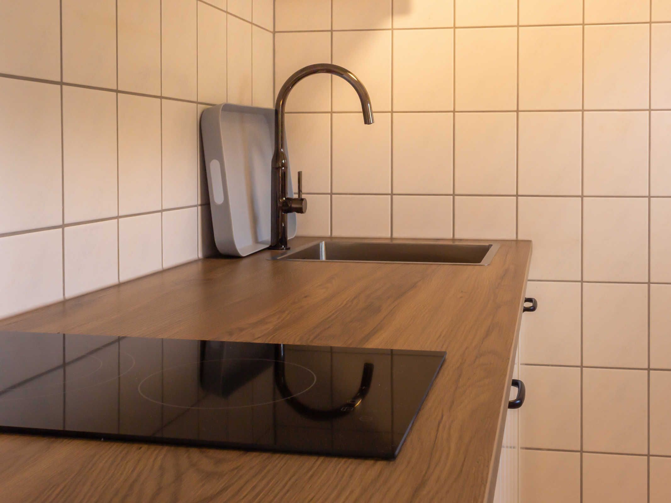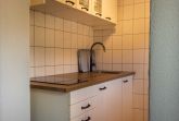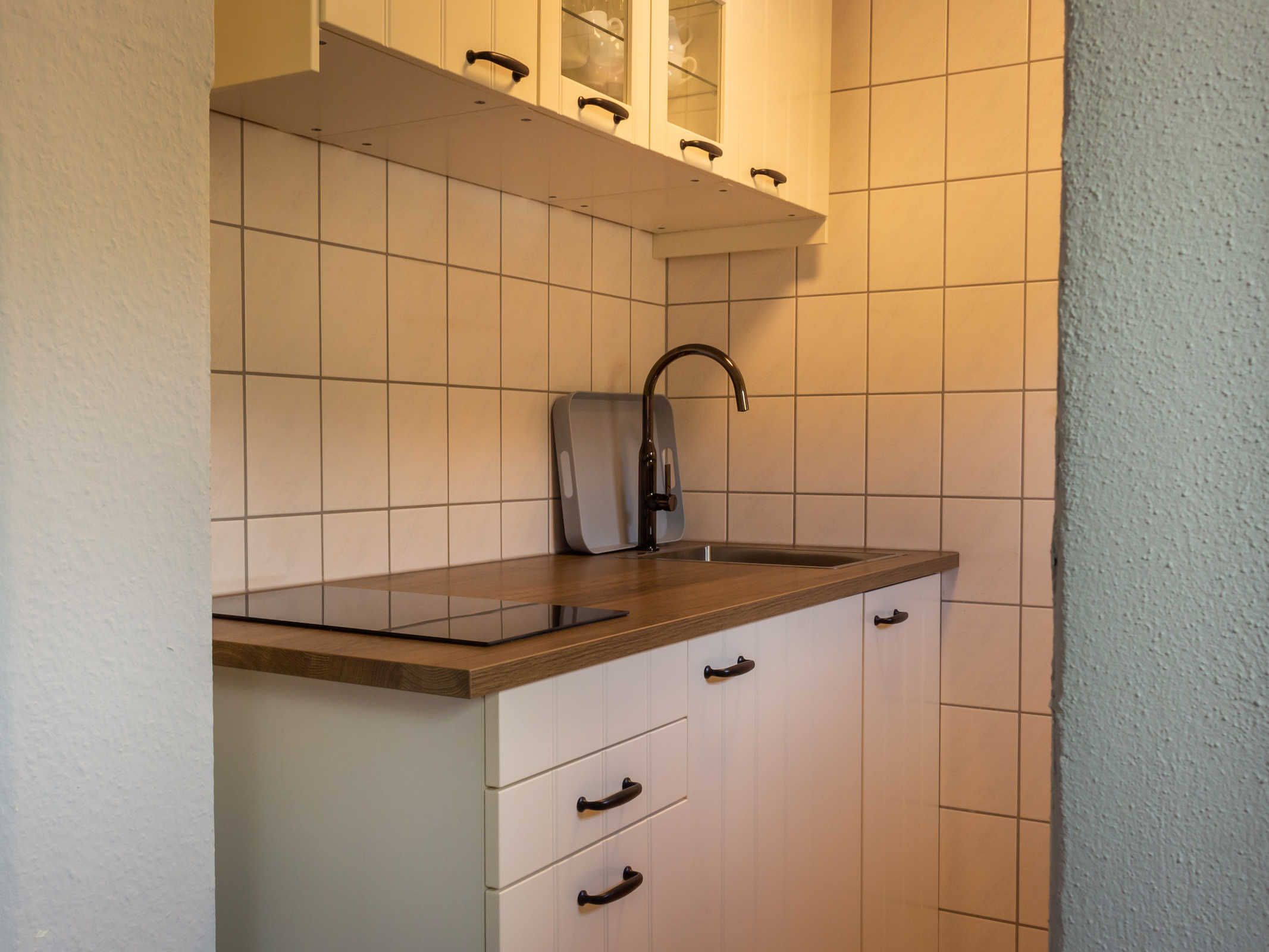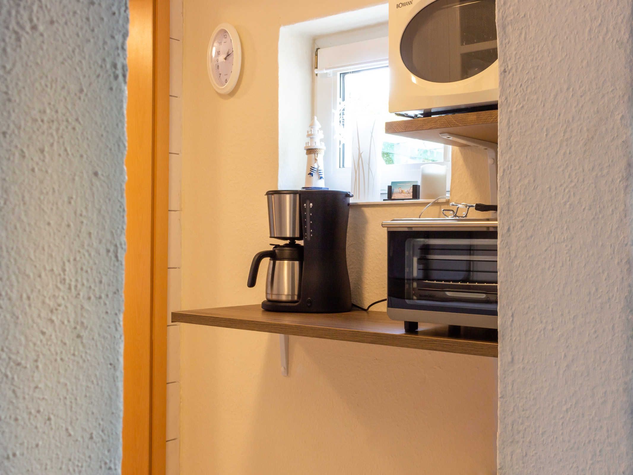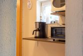 - Pantryküche mit zwei E-Herdplatten, Kühlschrank (mit kleinem Eisfach), Mikrowelle und Kaffeemaschine