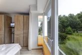 Vom Küchenbereich gelangen Sie in das einladende Wohnzimmer, das nahtlos in die Terrasse übergeht, die zur Ostseite hin ausgerichtet ist. Hier können Sie den Tag bei schönem Wetter genießen und den Blick auf die Natur und das Meer bewundern. Direkt über dem Wohnzimmer befindet sich das gemütliche Schlafzimmer mit einem großen Doppelbett, das 2021 erneuert wurde. Von hier aus haben Sie einen seitlichen Blick über die Düne auf den Ostseestrand.
