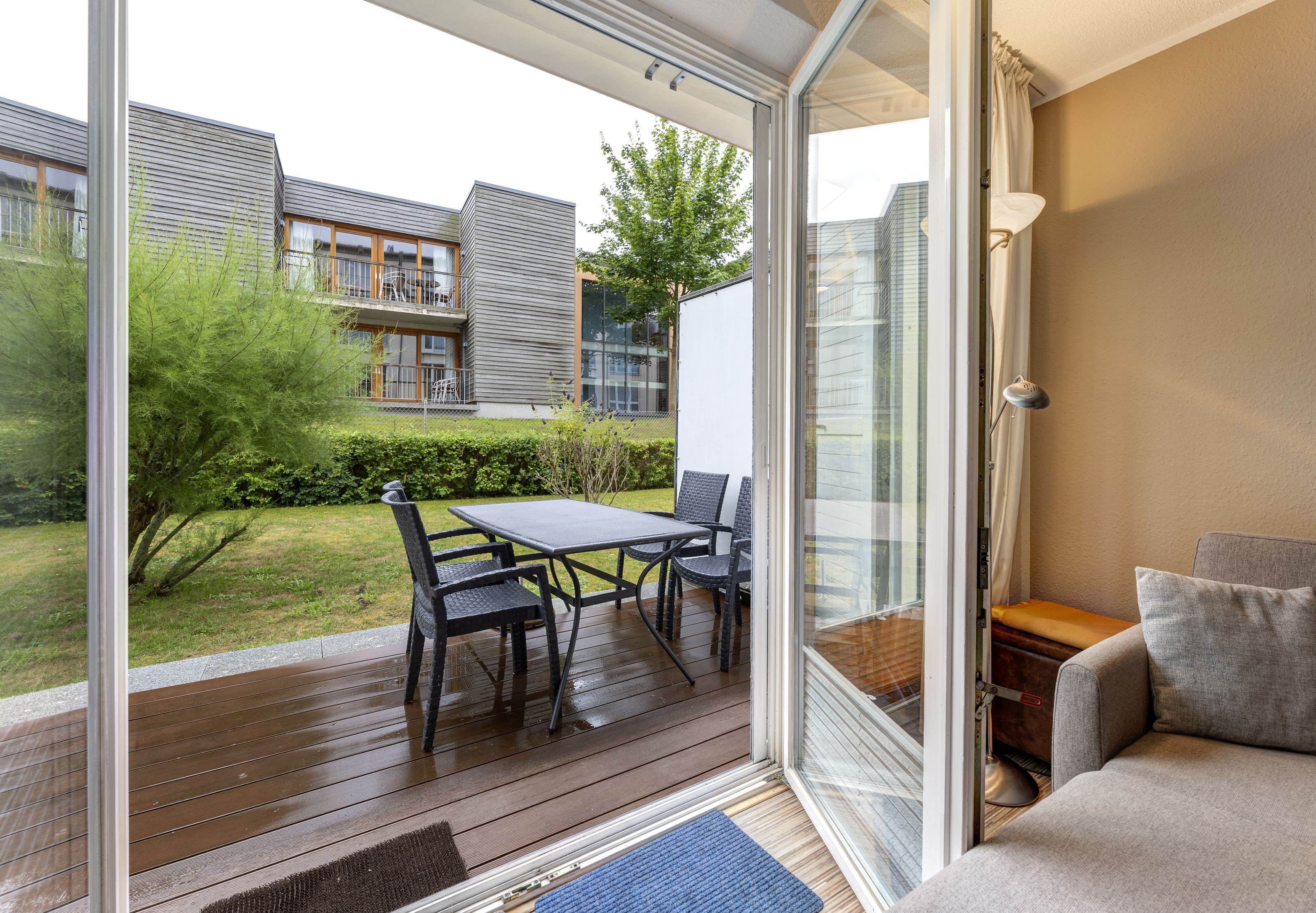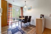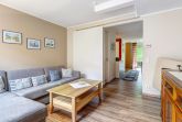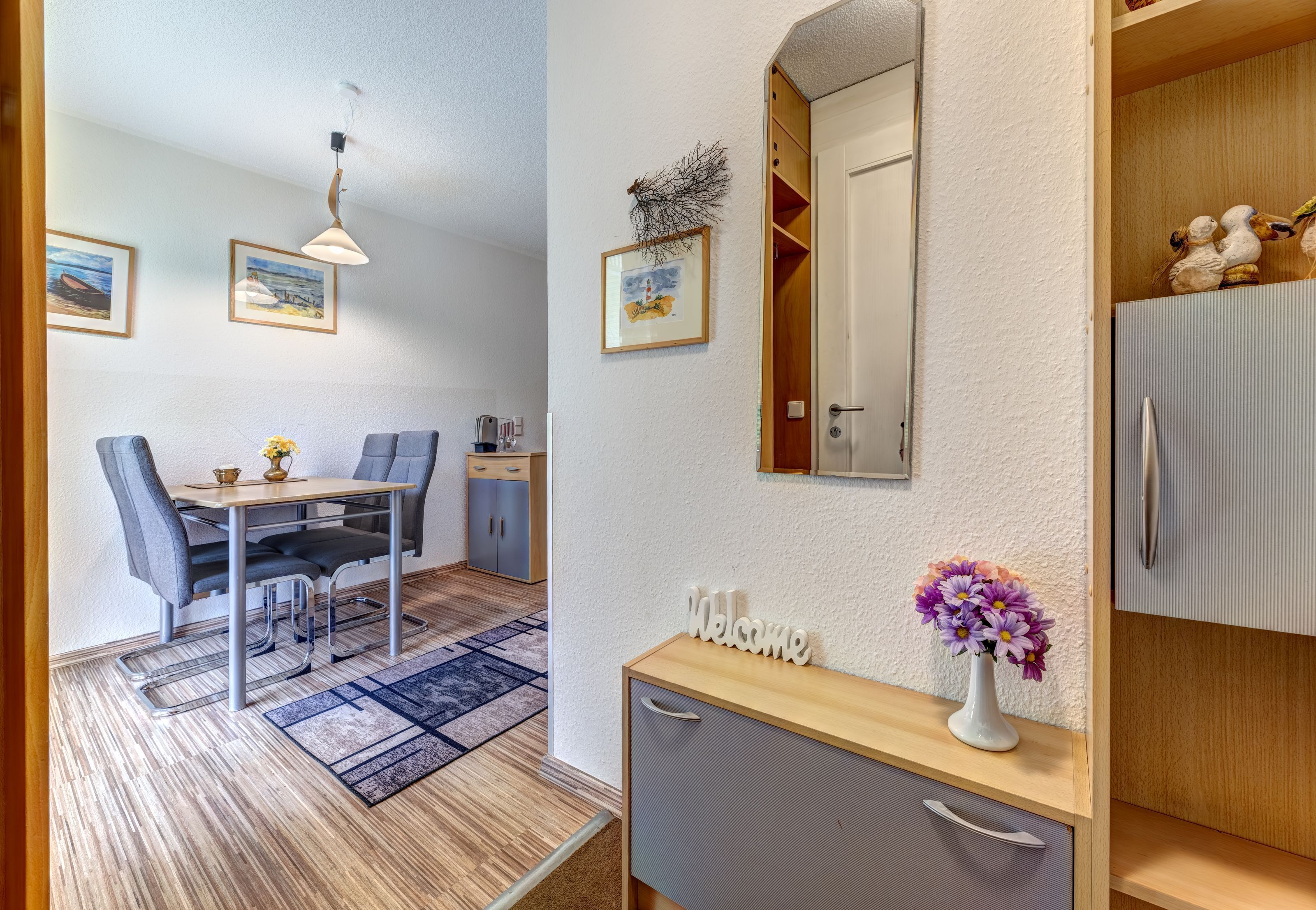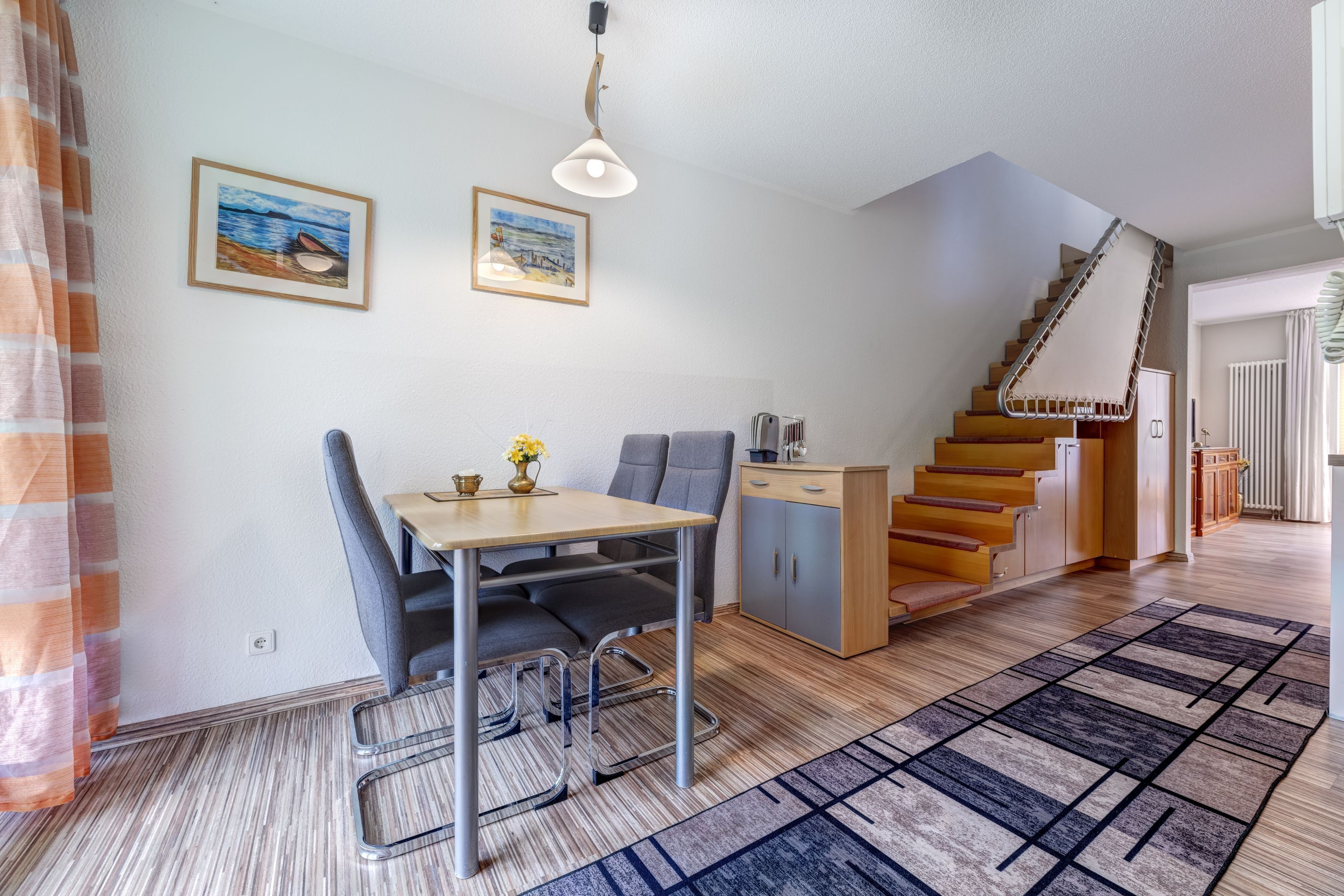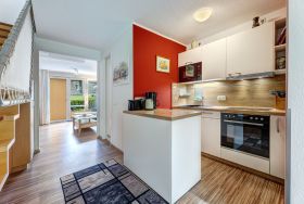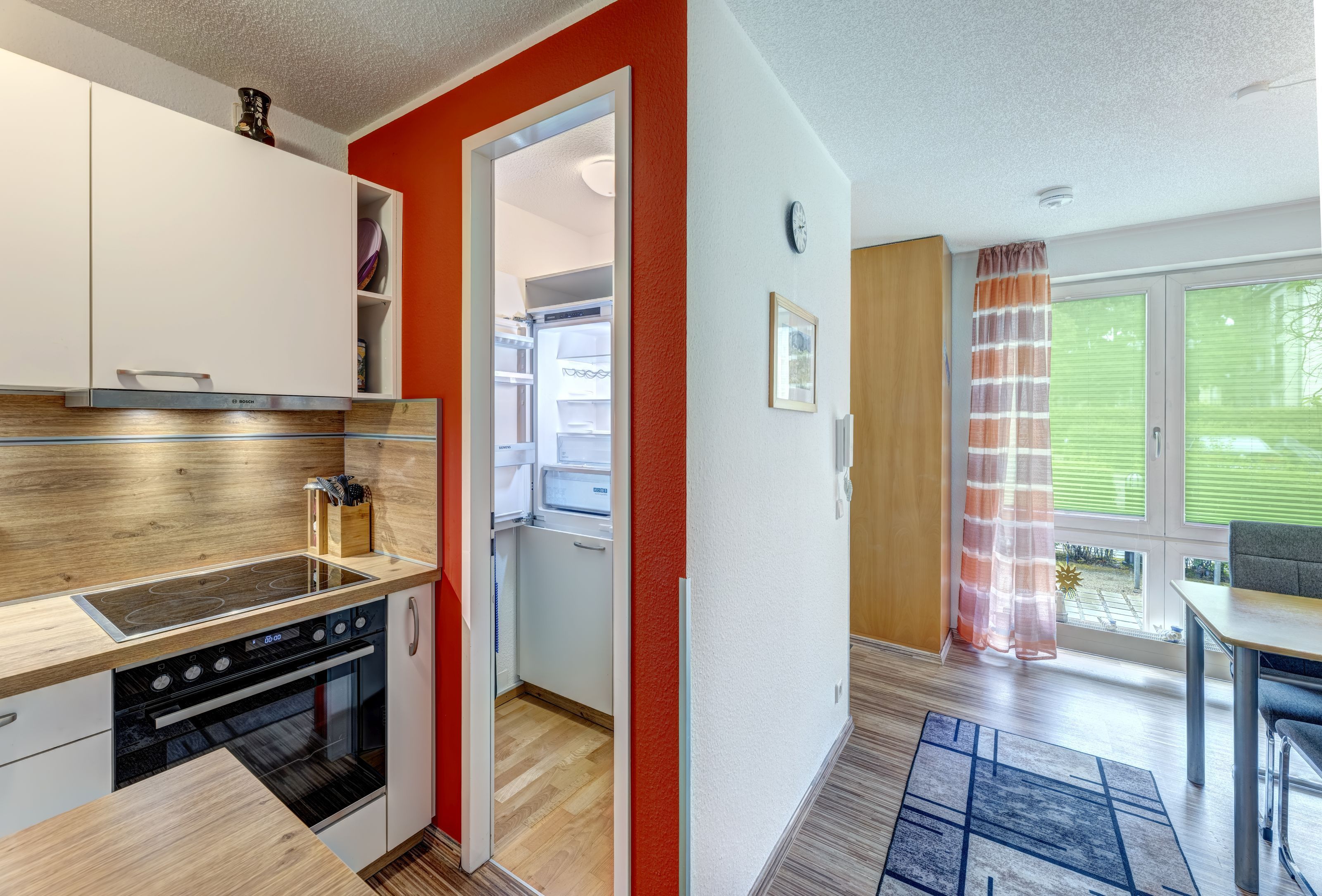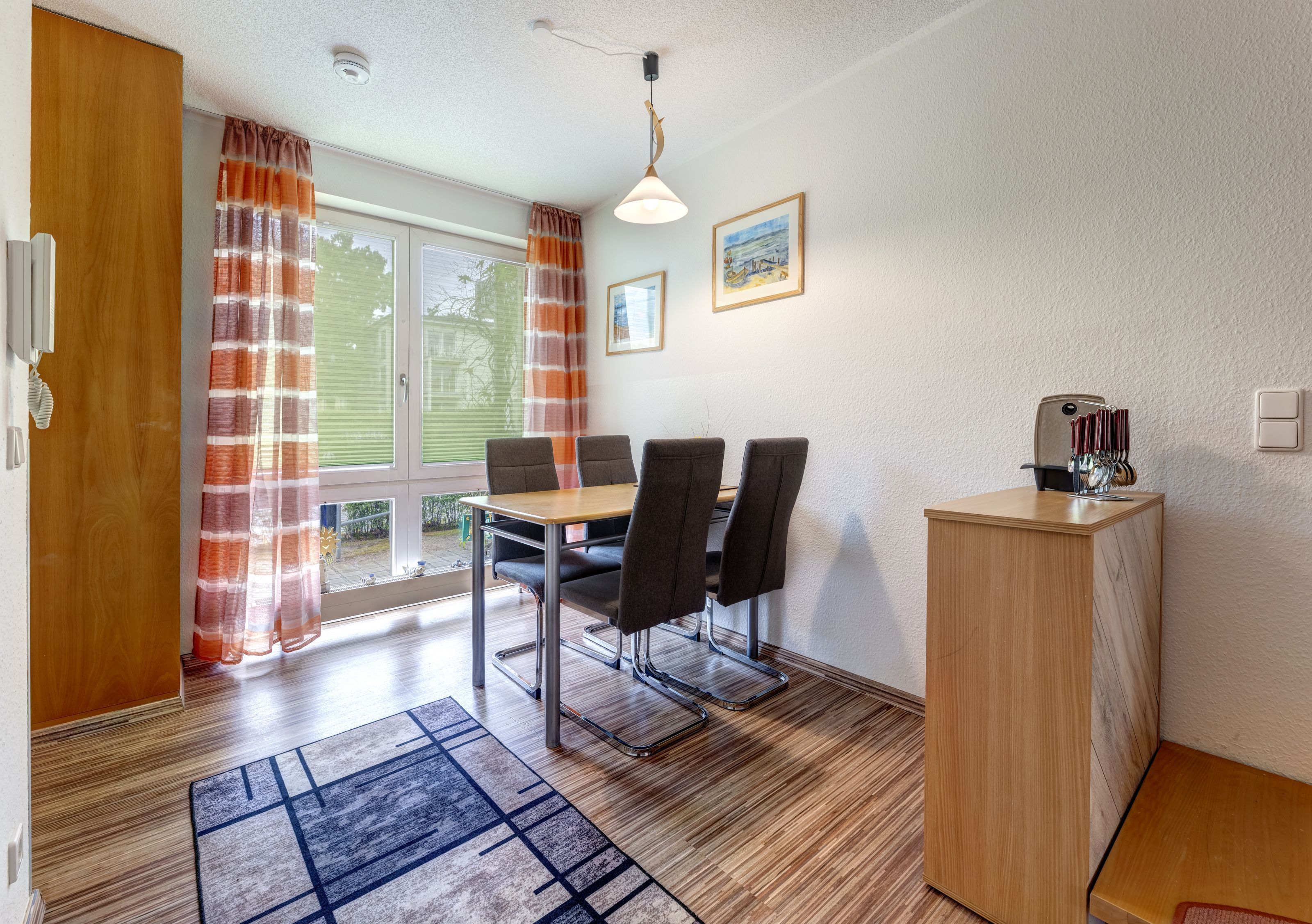 In der modernen Appartementanlage „Forum Marinar“ erwartet Sie eine liebevoll eingerichtete Maisonette-Ferienwohnung mit einer gemütlichen Terrasse und einer kleinen, vorgelagerten Wiese, die zum Entspannen einlädt. Diese charmante 2-Raum-Wohnung erstreckt sich über das Erdgeschoss, wo sich der Eingangsbereich mit einer frisch renovierten Küche aus dem Jahr 2022 und einem Esstisch für 2 Personen befindet. Die gut ausgestattete Küche lässt keine Wünsche offen und bietet alles, was Sie für einen angenehmen Urlaub benötigen - darunter eine Kaffeemaschine, Mikrowelle, Wasserkocher, Toaster, ein großer Herd, Geschirrspüler und ein Kühlschrank mit Frostfach.