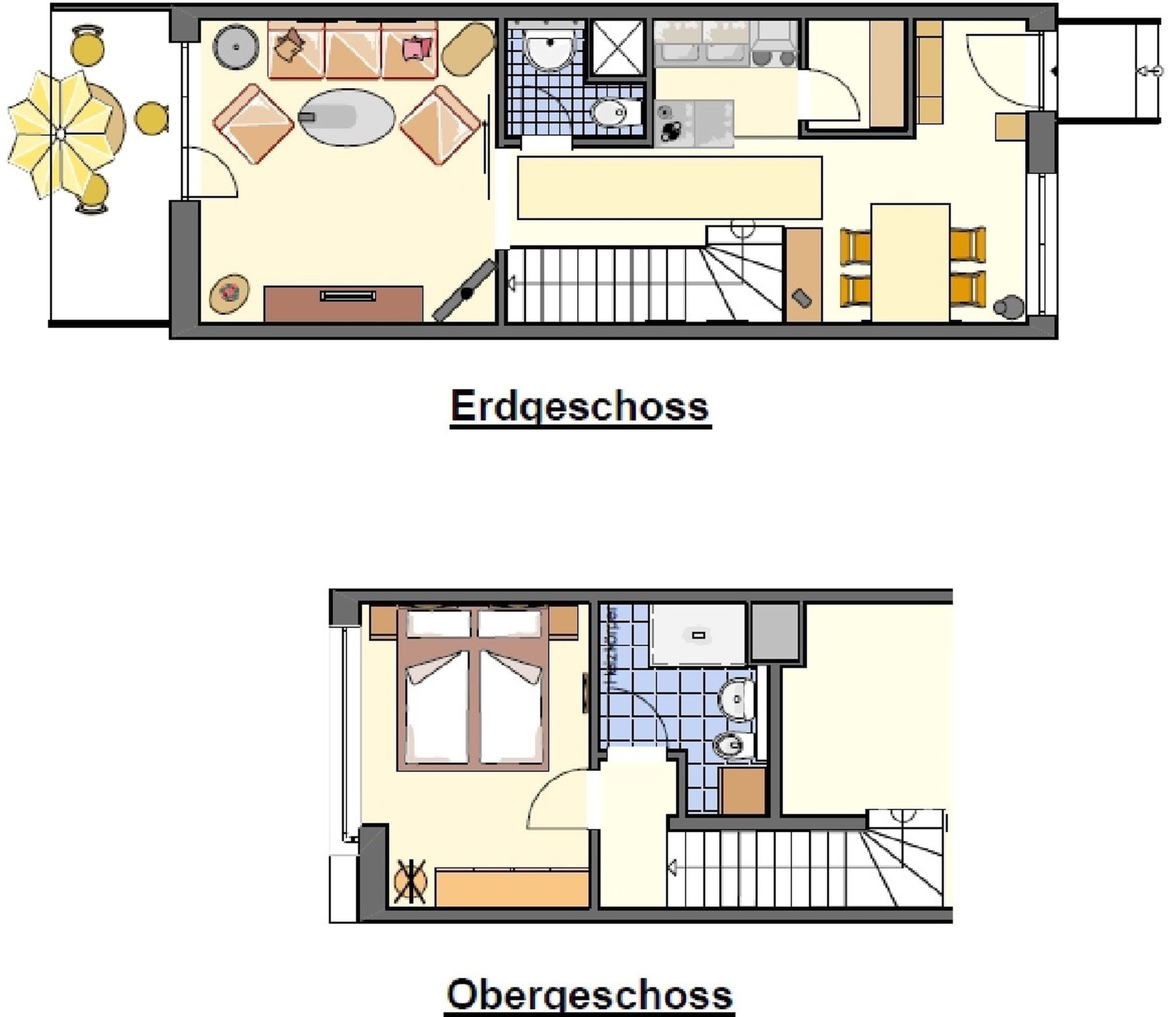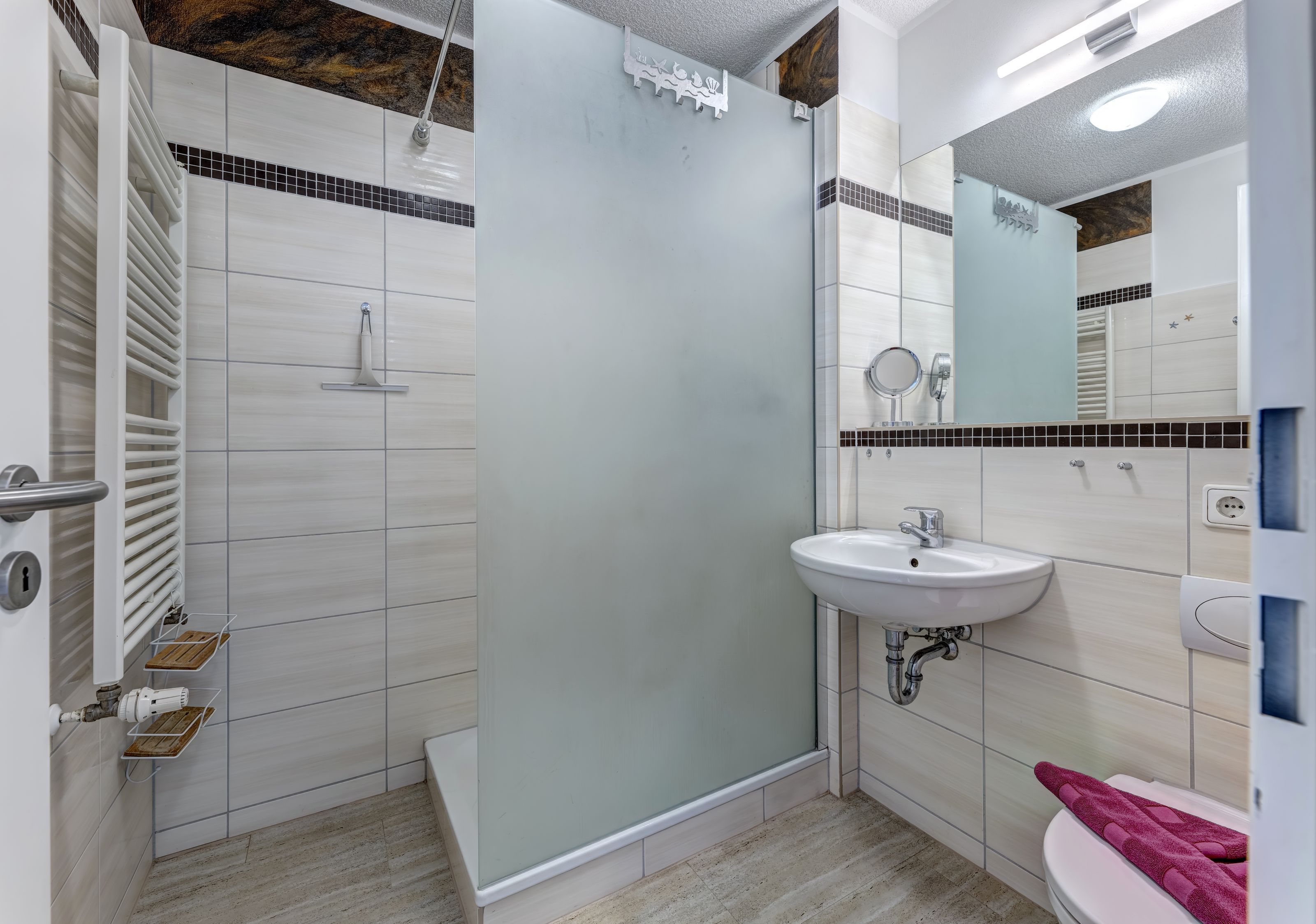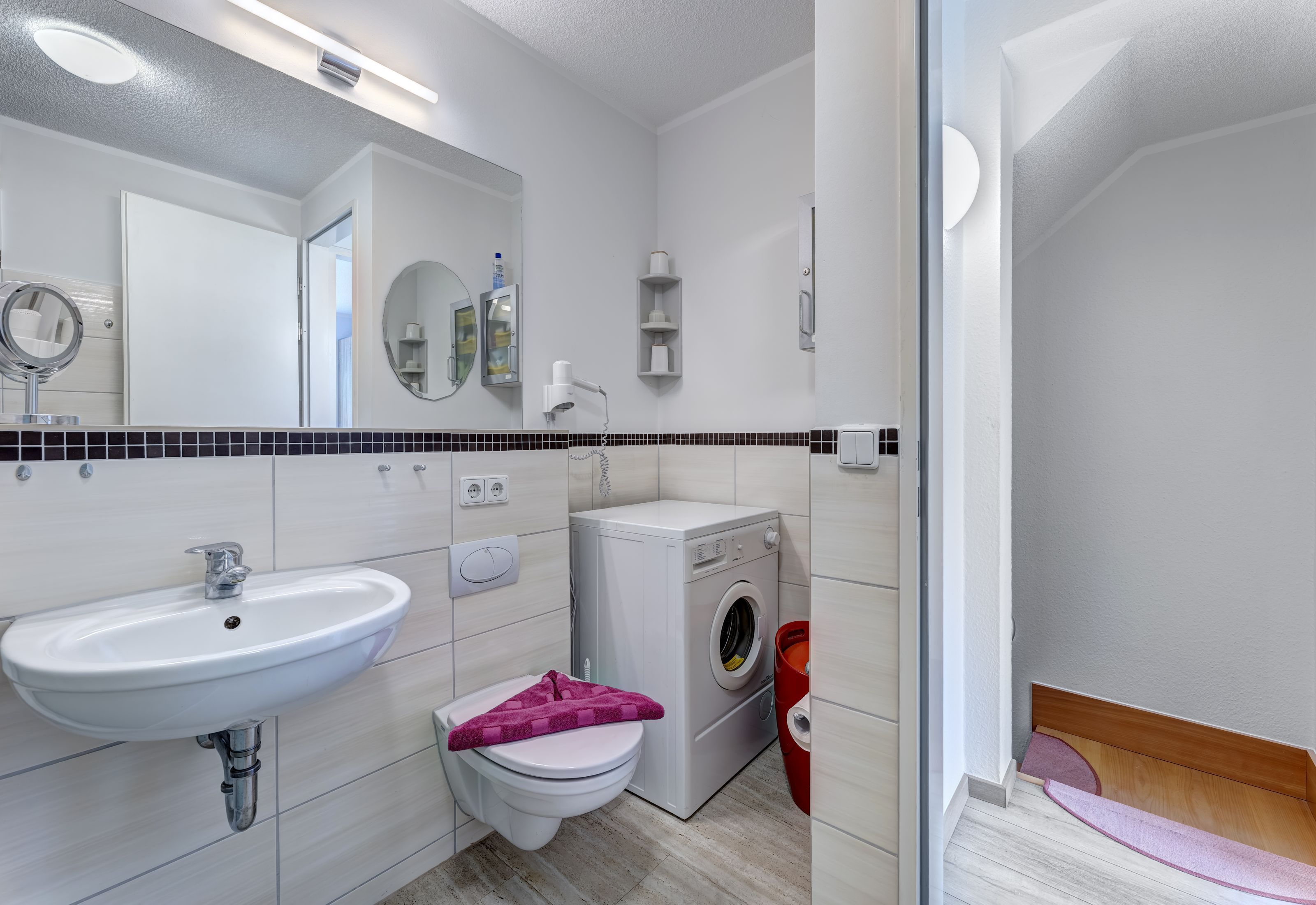 Im Obergeschoss befindet sich neben dem Schlafzimmer ein weiteres Badezimmer mit Dusche sowie eine Waschmaschine, die Ihnen zusätzlichen Komfort bietet. Auch im Erdgeschoss finden Sie ein weiteres Badezimmer mit WC und Waschbecken.