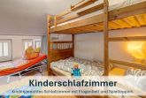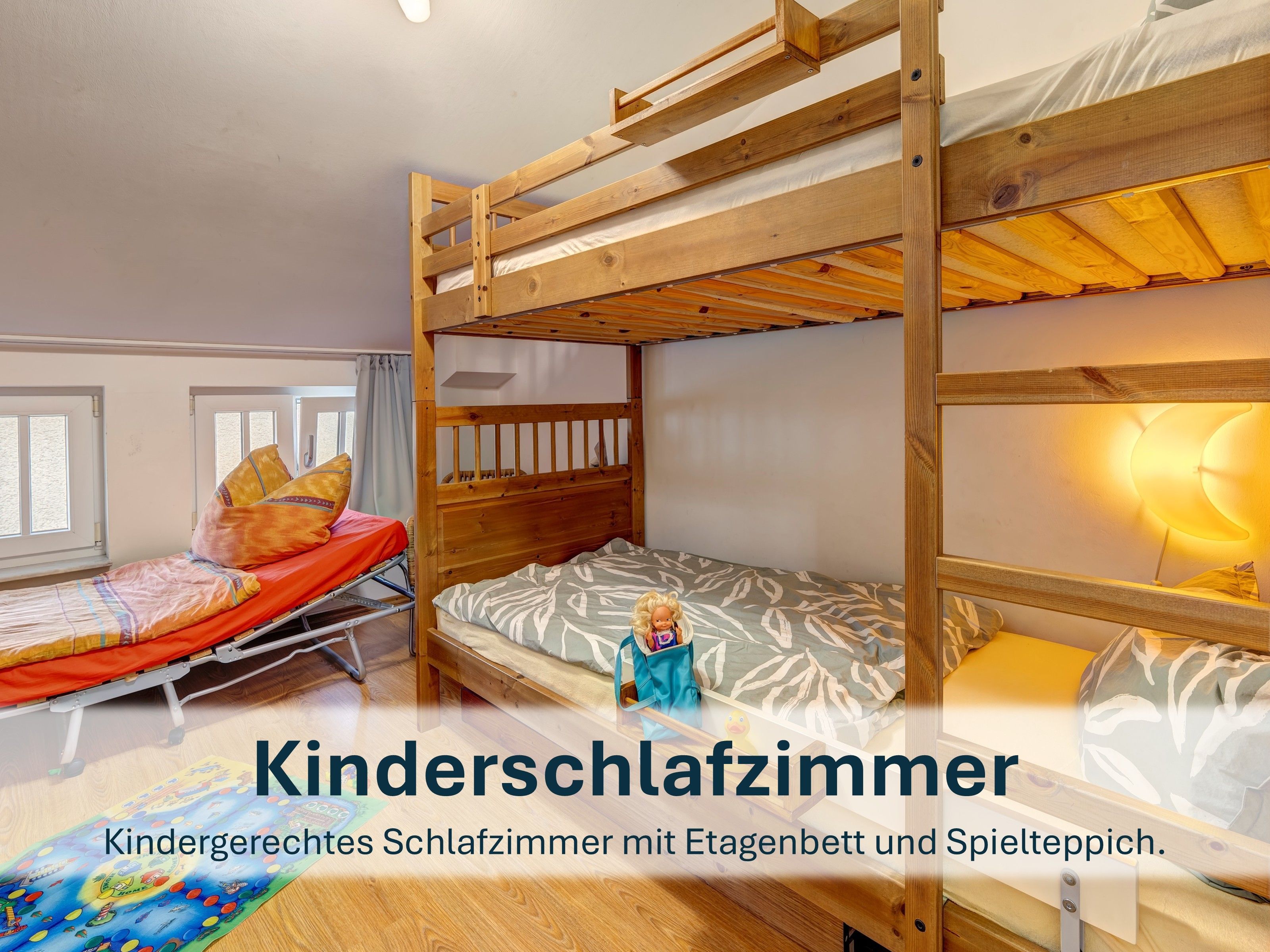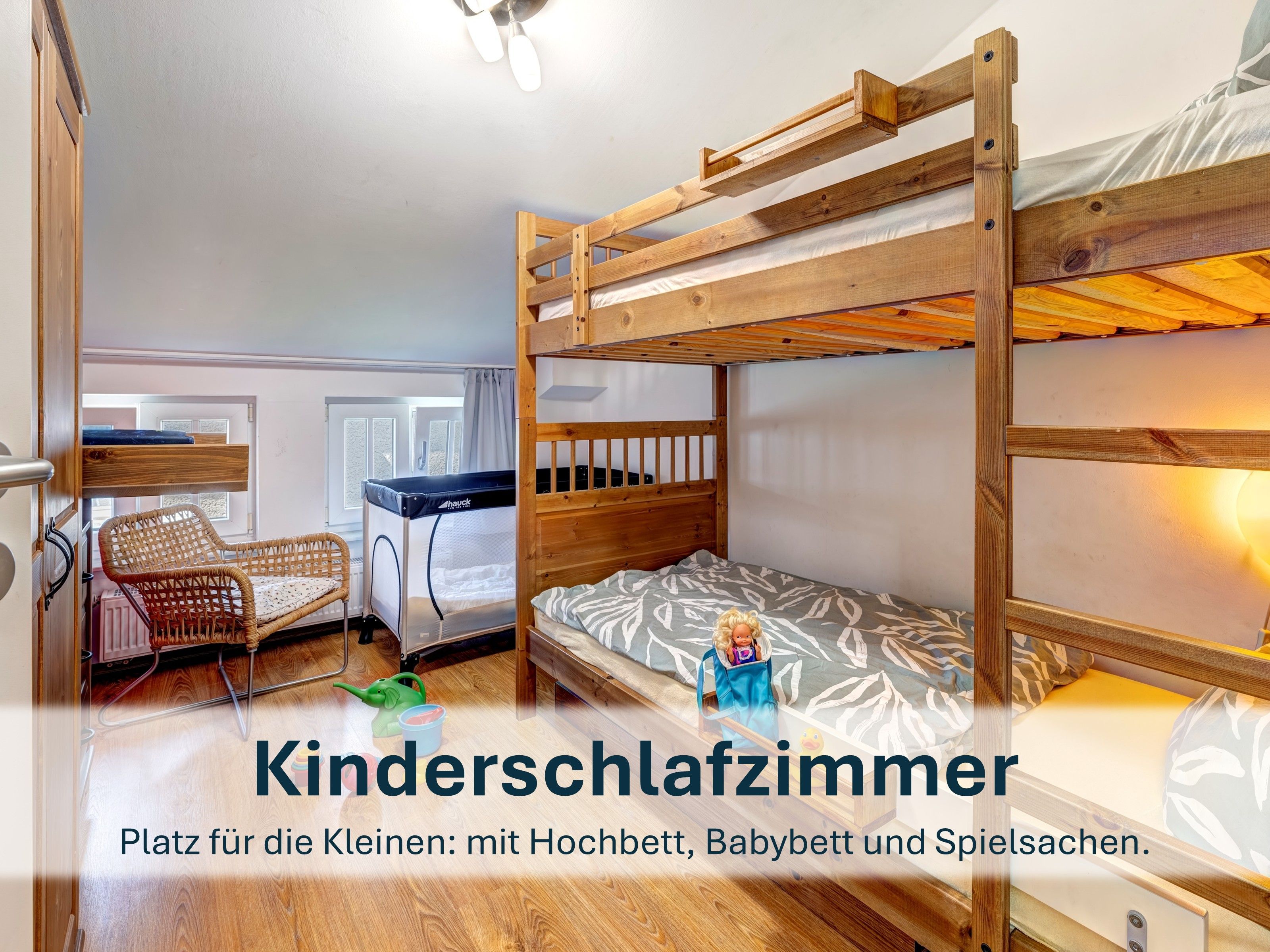 Kinderzimmer mit Etagenbett (2×90×200), zusätzlichem Baby-/Reisebett, Wickelkommode, Nachtlicht, Schrank & Babyfon