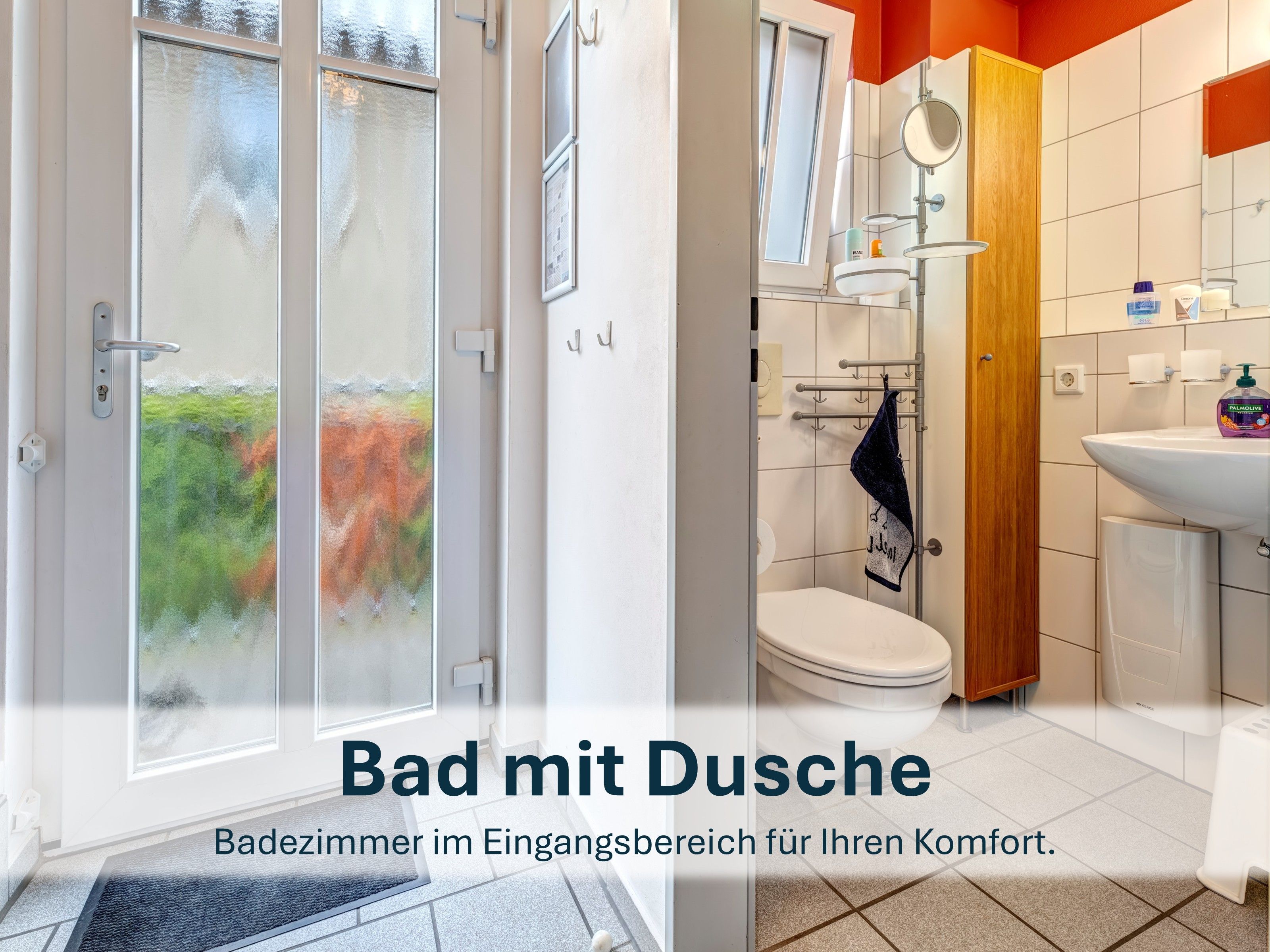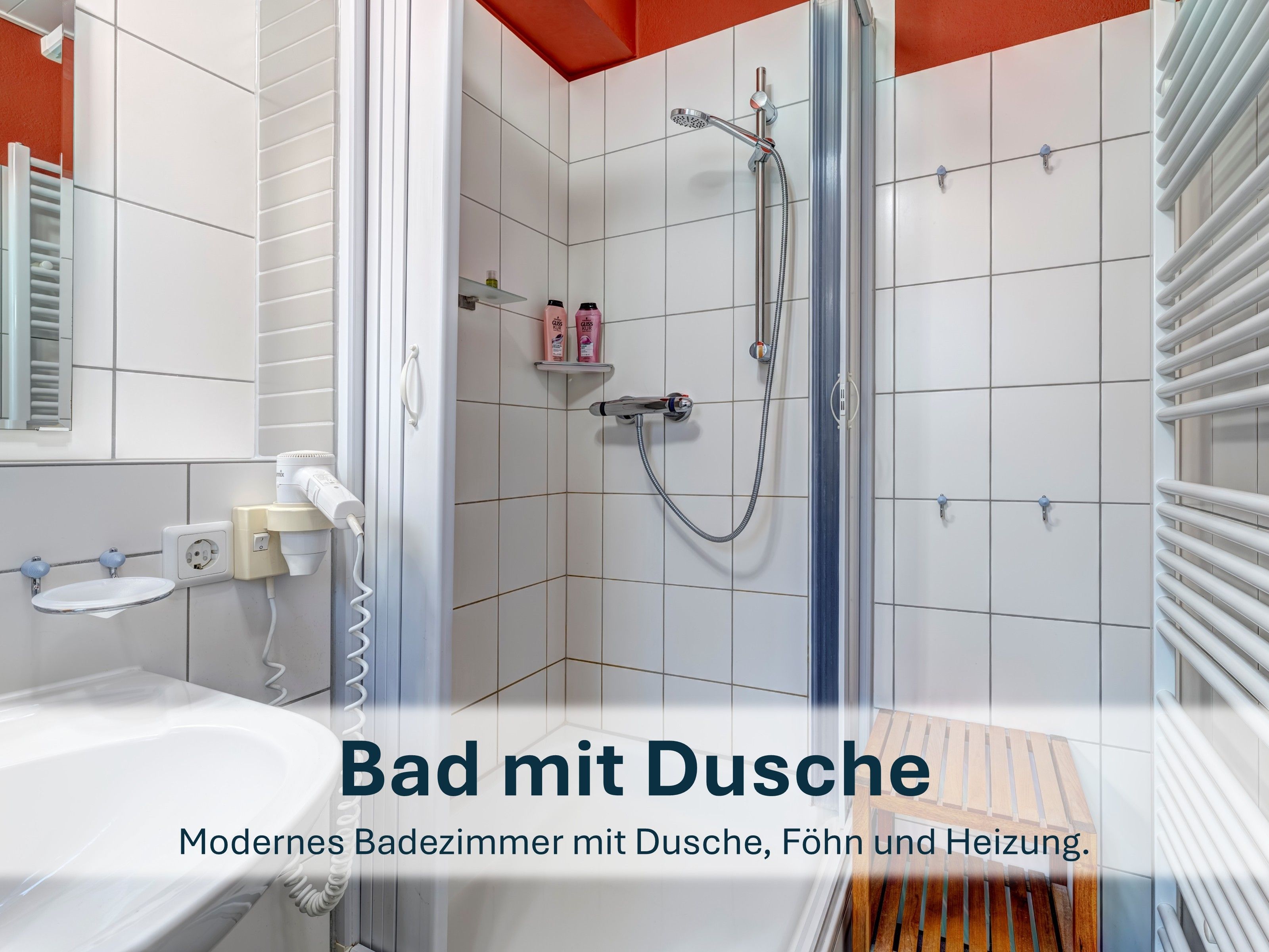 Im gleichen Stockwerk befindet sich das moderne Bad mit Dusche und WC.