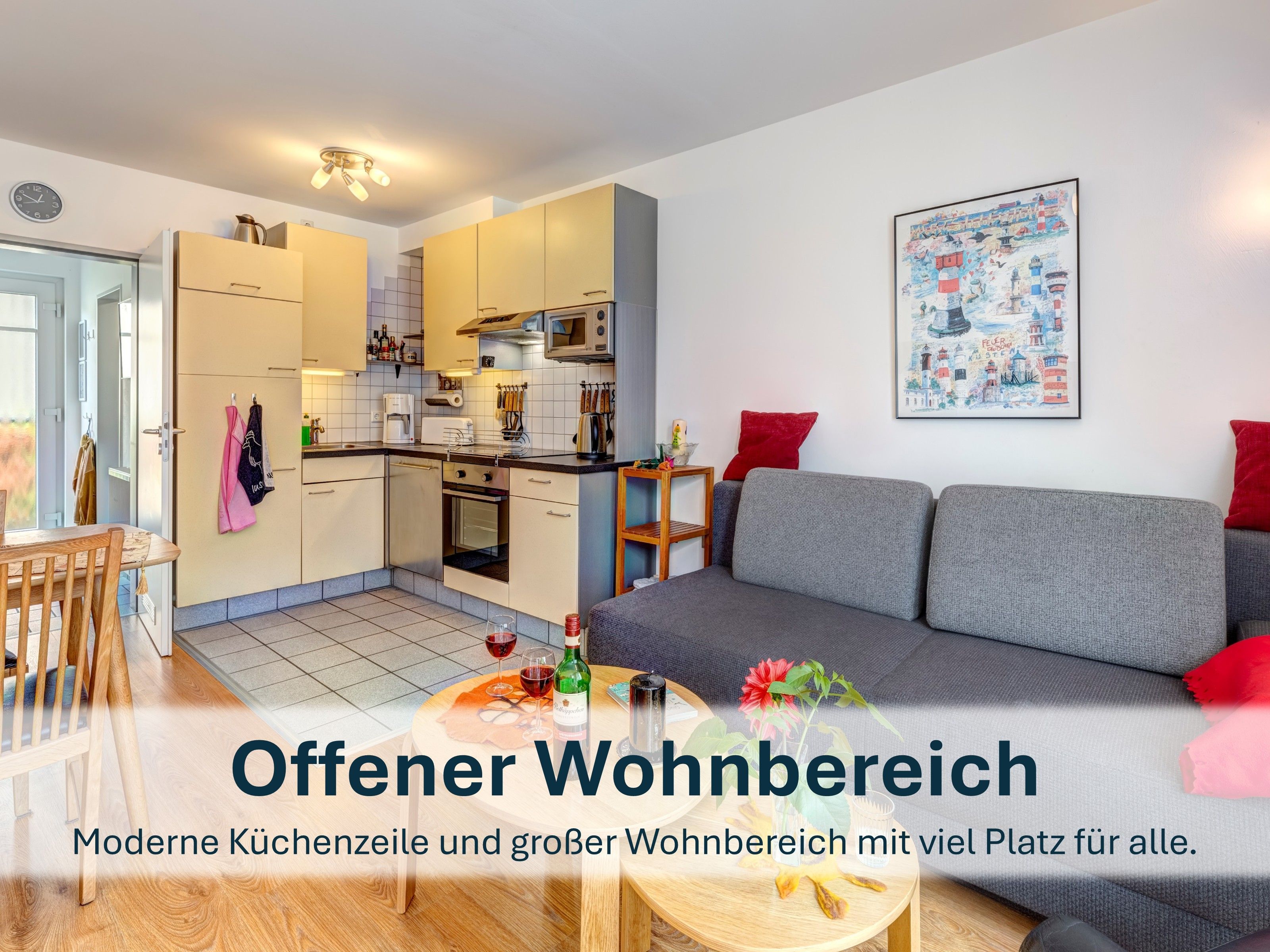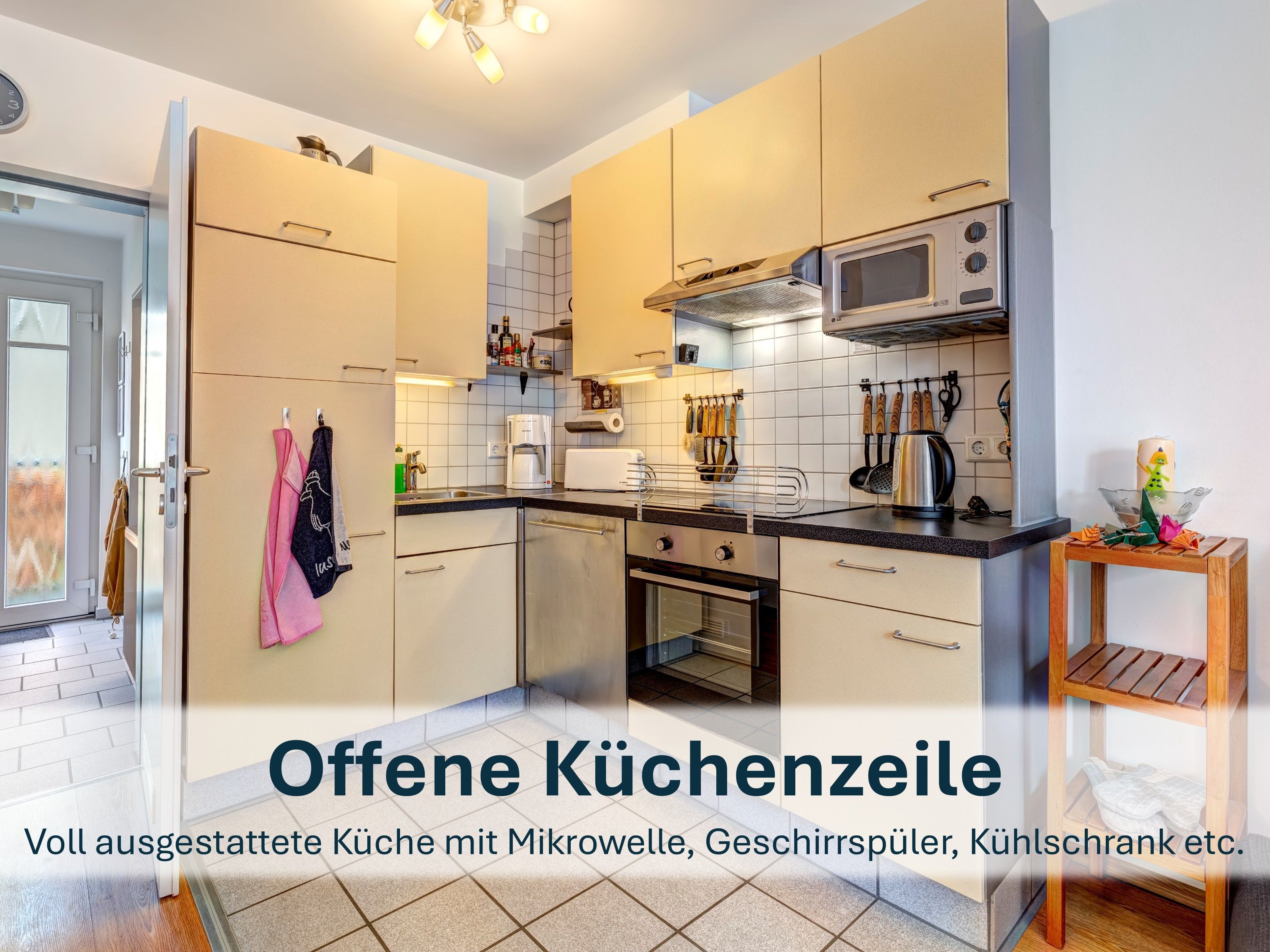 Die offene Küche ist hochwertig ausgestattet: Geschirrspüler, Induktionskochfeld, Backofen, Mikrowelle, Kühlschrank mit Gefrierfach, Kaffeemaschine, Wasserkocher und Toaster alles da für genussvolle Mahlzeiten. Auch ein Babyhochstuhl und eine Trittleiter sind vorhanden.