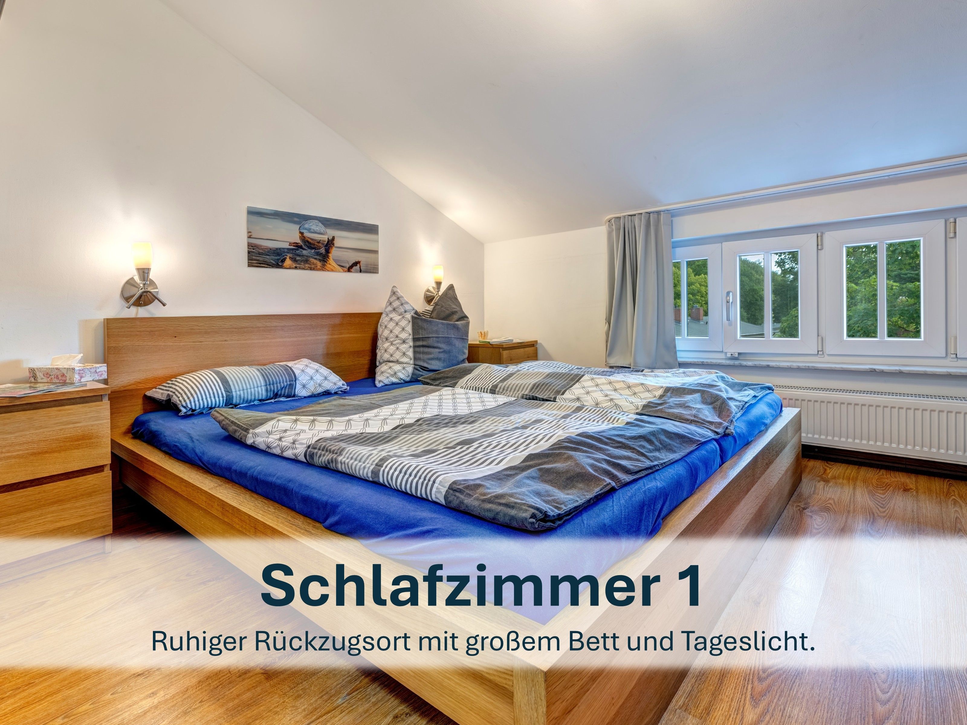 Elternzimmer mit Doppelbett (180×200), Kleiderschrank, Nachttischen & Flat-TV