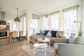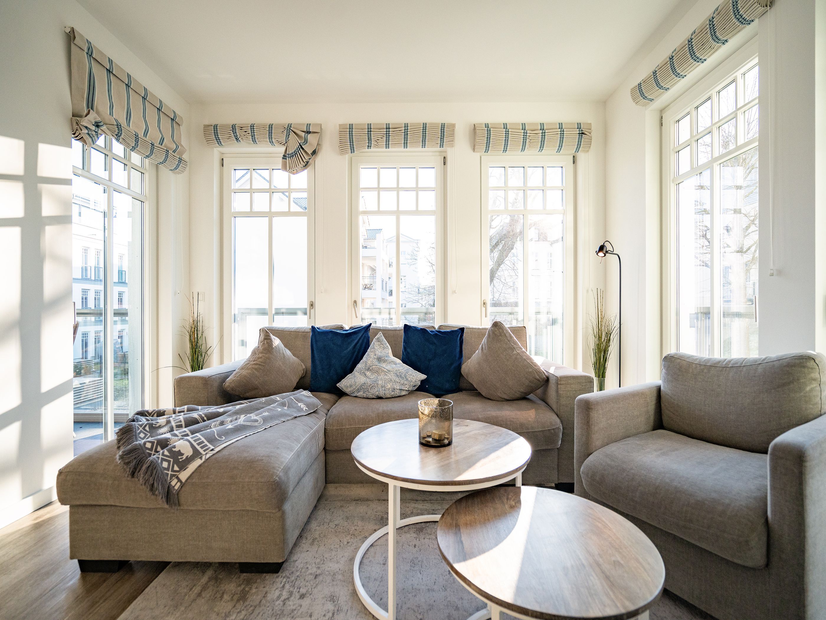 Eine harmonisch abgestimmte Inneneinrichtung und dezente Farben - so begrüßt Sie das gemütliche 68 Quadratmeter große Appartement 8 im Westendpalais. Das exklusive 3-Raum-Domizil eignet sich für maximal 2 Erwachsene, 2 Kinder und ein Kleinkind (bis 3 Jahre im Kinderreisebett). Viel Platz zum Entspannen bietet der offene Wohn-Essbereich mit Sofalandschaft und Flat-TV. Ein Elektro-Kamin sorgt für zusätzliche Wohlfühlatmosphäre, besonders an kühleren Tagen. Einen seitlichen Blick auf die Ostsee gibt der kleine Balkon frei, der auch von der angrenzenden Küche begehbar ist. Die hochwertige Küchenzeile ist u.a. mit einem Induktionsherd und allem, was Sie zum Zubereiten Ihrer Speisen benötigen, ausgestattet. Ein Essplatz für bis zu 5 Personen rundet den Wohn-Essbereich ab. Sollten Sie die Ostsee nachts einmal nicht hören, können Sie zumindest von ihr träumen. Dafür steht ein Schlafzimmer mit Doppelbett (1,60m x 2,00m) und eine Schlafcouch (1,20m x 2,00m) in einem separaten Wohnraum zur Verfügung. Beide Zimmer verfügen darüber hinaus über Flat-TVs. Das großzügig geschnittene Badezimmer mit Badewanne, Waschtisch und WC hält als Highlight eine Finnische Sauna für Sie bereit. Ein Tiefgaragenstellplatz ist für Sie reserviert. Für einen sorgenfreien Urlaub sind die Betten bei Anreise bezogen und Handtücher liegen für Sie bereit. Kostenfreies WLAN und ein Fahrstuhl machen den Komfort in diesem Appartement komplett.
