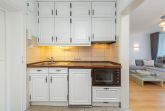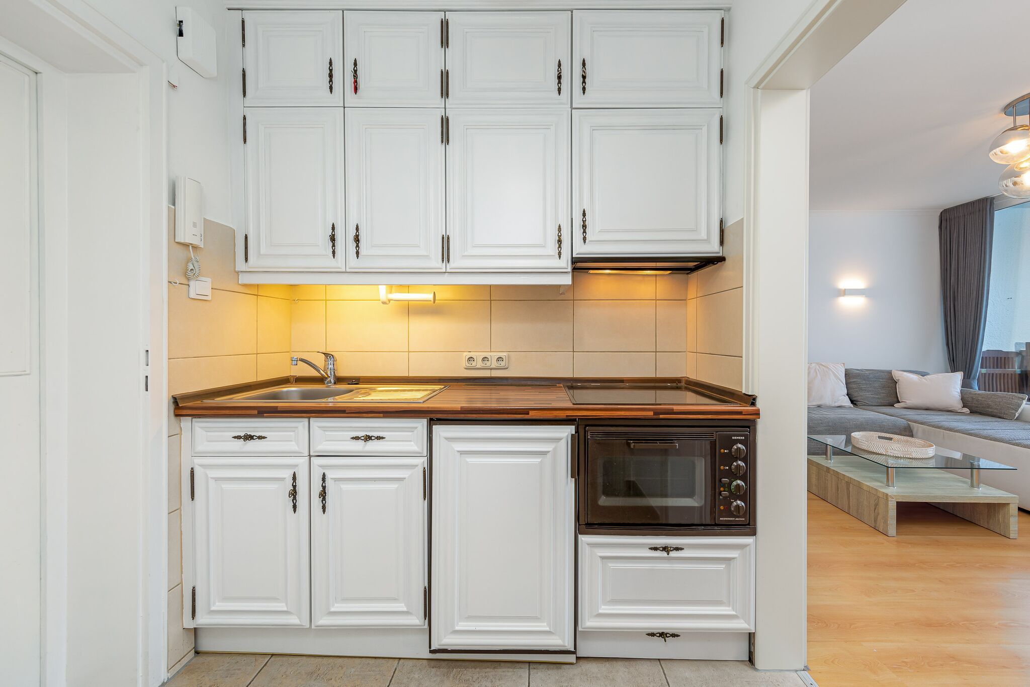 Die separate Einbauküche ist mit einem Backofen, Ceranfeld und einer Filterkaffeemaschine gut ausgestattet.