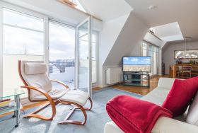 Im großen kombinierten Wohn- und Küchenbereich können Sie auf dem gemütlichen Sofa entspannen oder einen schönen Film ansehen. Von hier aus gelangen Sie auch auf den möblierten Balkon mit Markise als Sonnenschutz, der nach Osten ausgerichtet ist.
