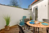 Vom Wohnzimmer aus geht es auf die schöne, möblierte Terrasse in Südwest-Lage, umgeben mit einer weißen Sichtschutzmauer. Somit bietet sich auch im Stadtzentrum eine weitere Oase der Ruhe.