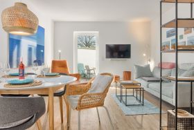 Komfort für Gäste steht hierbei im Vordergrund. Auf ca. 68 qm Wohnfläche ist für den bequemen Aufenthalt genug Raum für einen entspannten Urlaub. LilleHavn ist liebevoll und wertig eingerichtet. Der Wohn- und Essbereich ist großzügig offen gehalten und bietet mit dem gemütlichen Sofa und einem Ledersessel Platz zum Relaxen. Selbstverständlich ist die Wohnung mit Fernsehern, WLAN und Radio/Bluetooth ausgestattet.