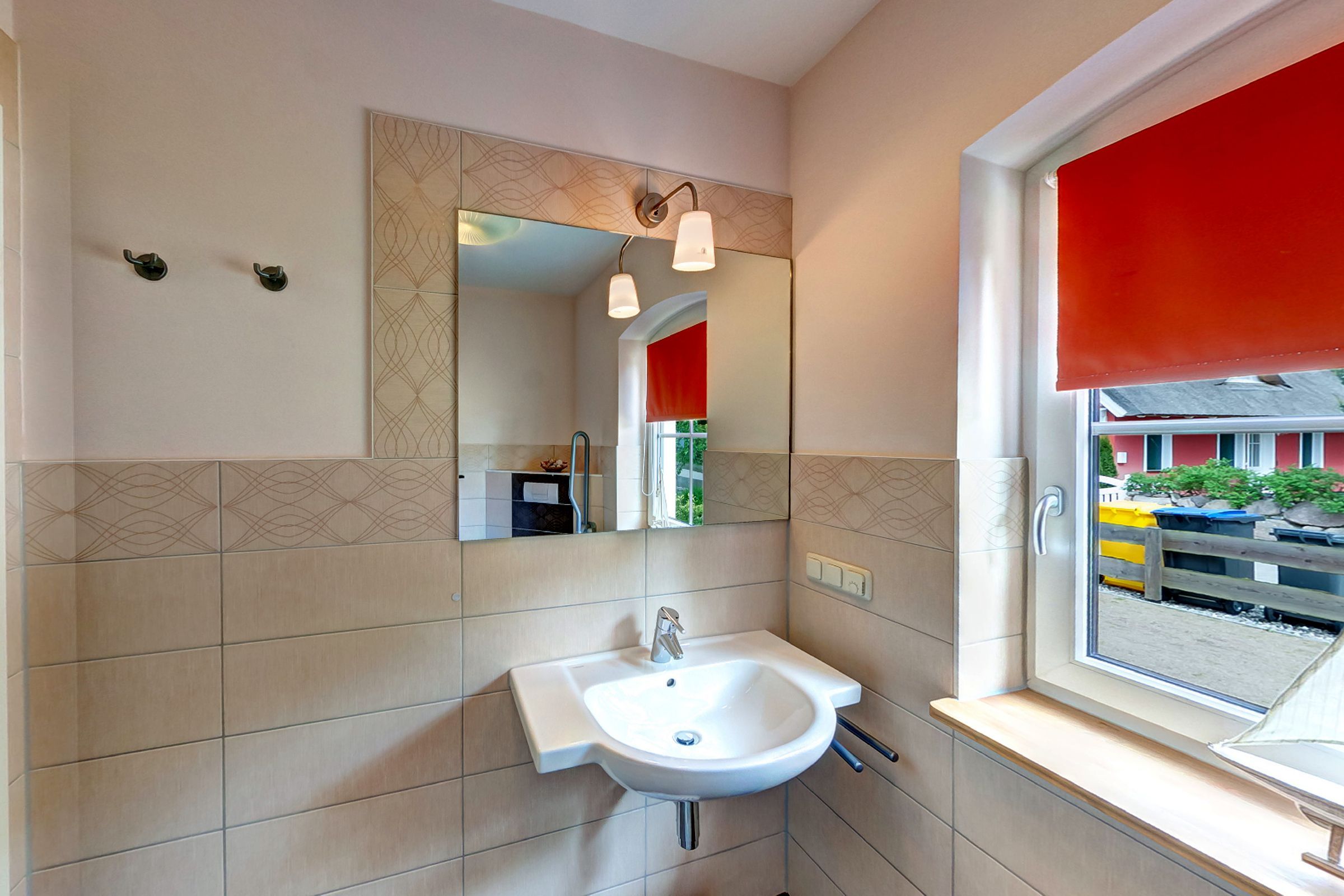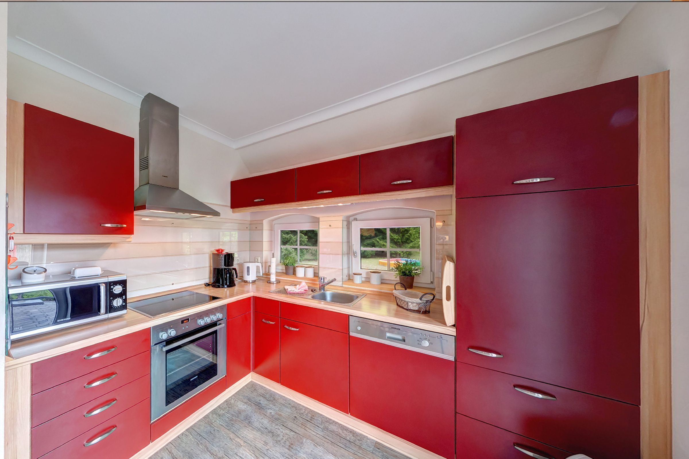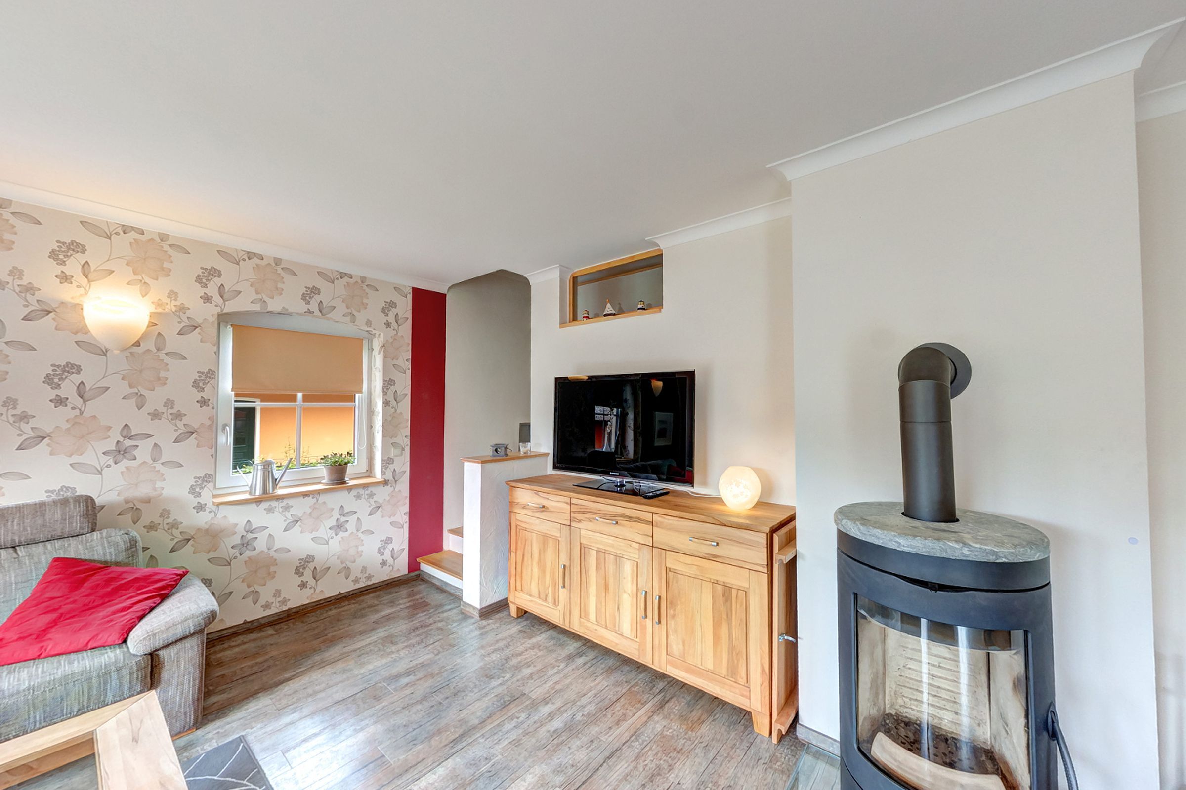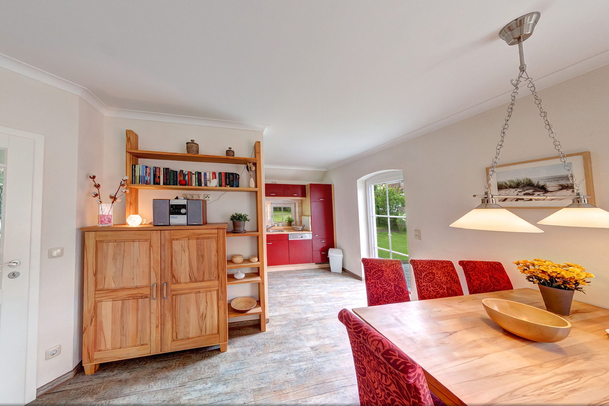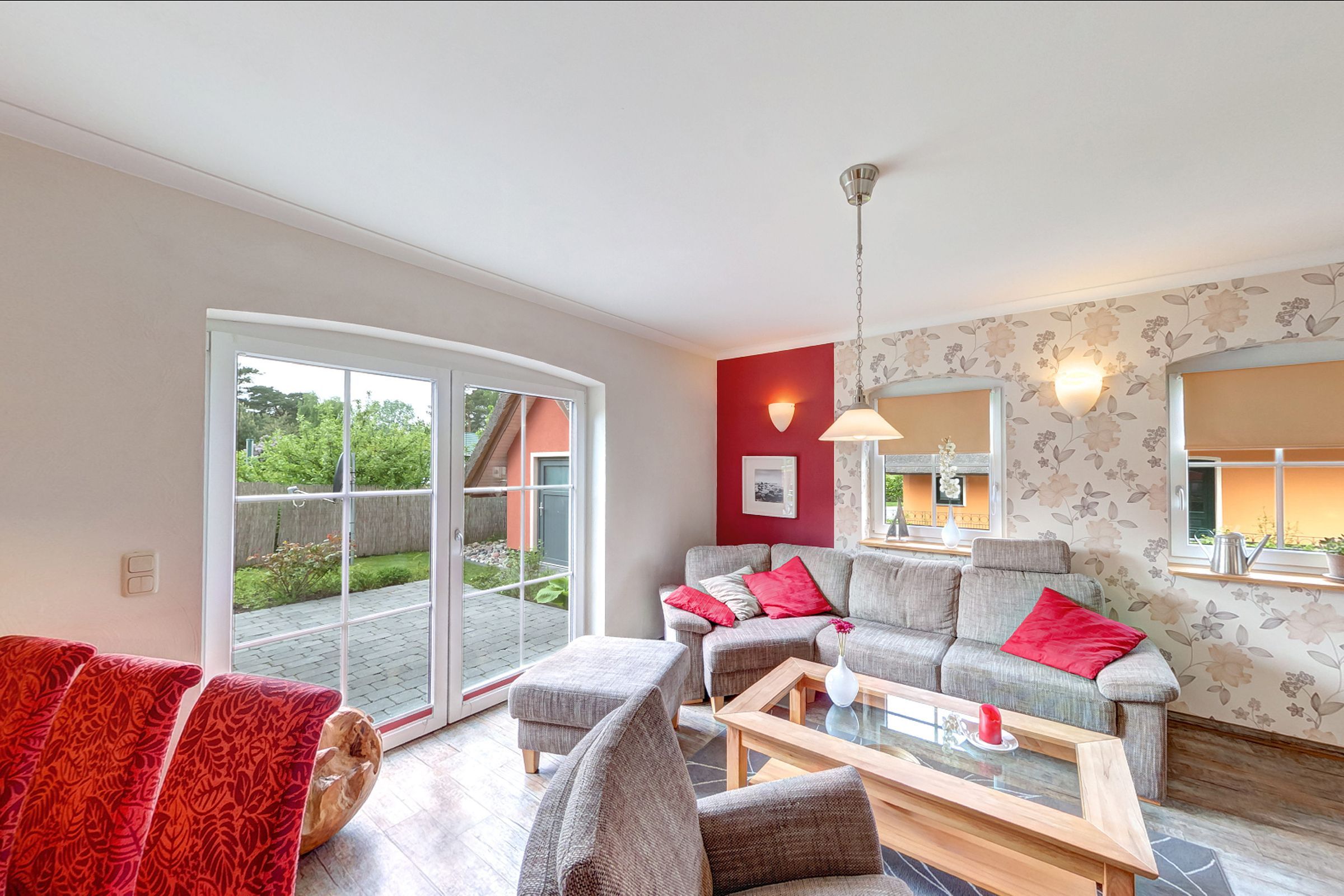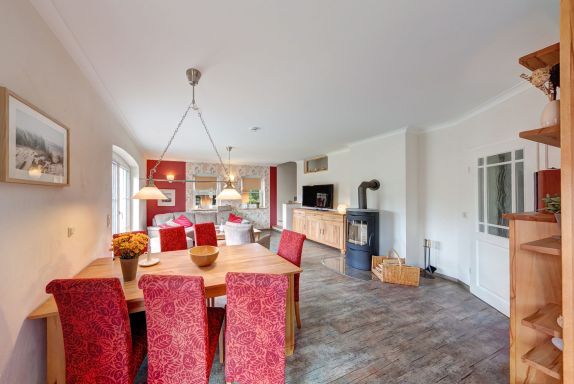Im Erdgeschoss dieses charmanten Hauses erwartet Sie ein großzügiger, lichtdurchfluteter Wohn- und Essbereich, der nahtlos an eine voll ausgestattete Küche angrenzt. Hier können Sie Ihre Lieblingsgerichte zubereiten und gemeinsam am großen, hölzernen Esstisch genießen. Der Wohnbereich ist mit einer bequemen Couch, einem gemütlichen Kaminofen und einem Flat-TV ausgestattet - perfekt für entspannte Stunden. Vom Wohnraum aus haben Sie direkten Zugang zu Ihrer möblierten Terrasse, auf der Sie das herrliche Ostseewetter in vollen Zügen genießen können.
