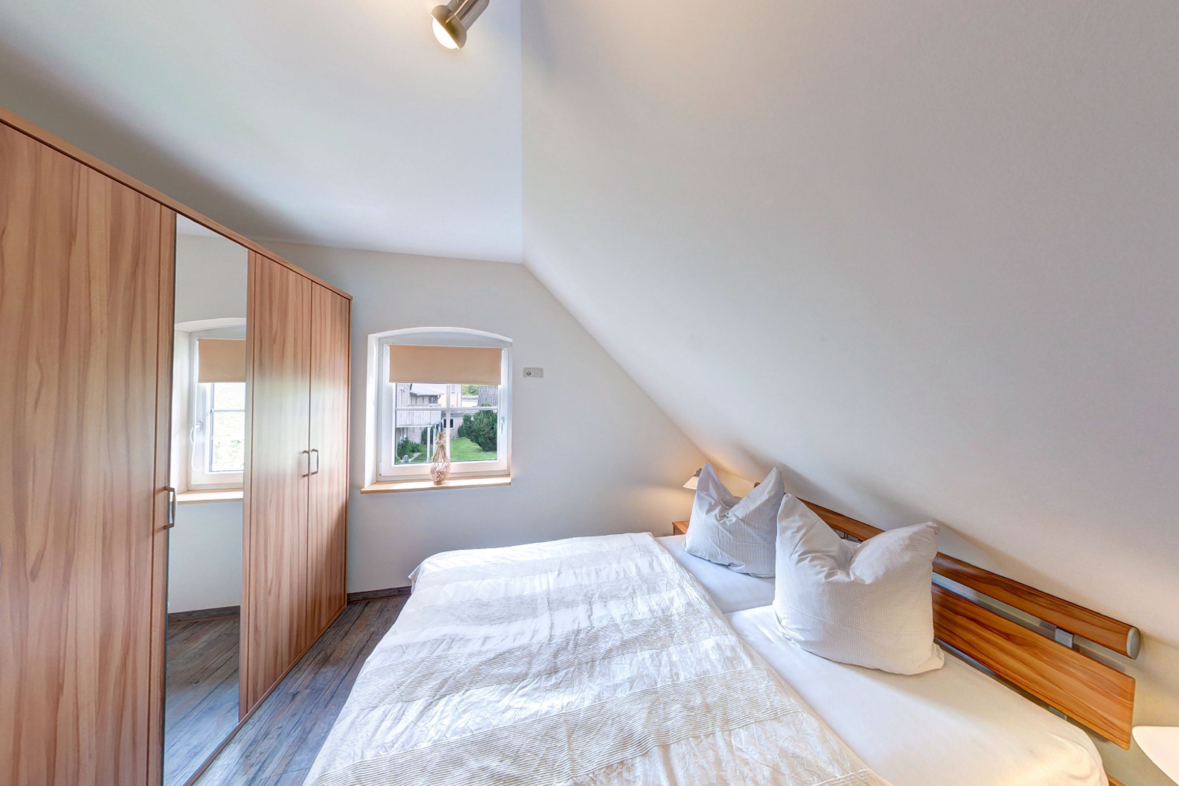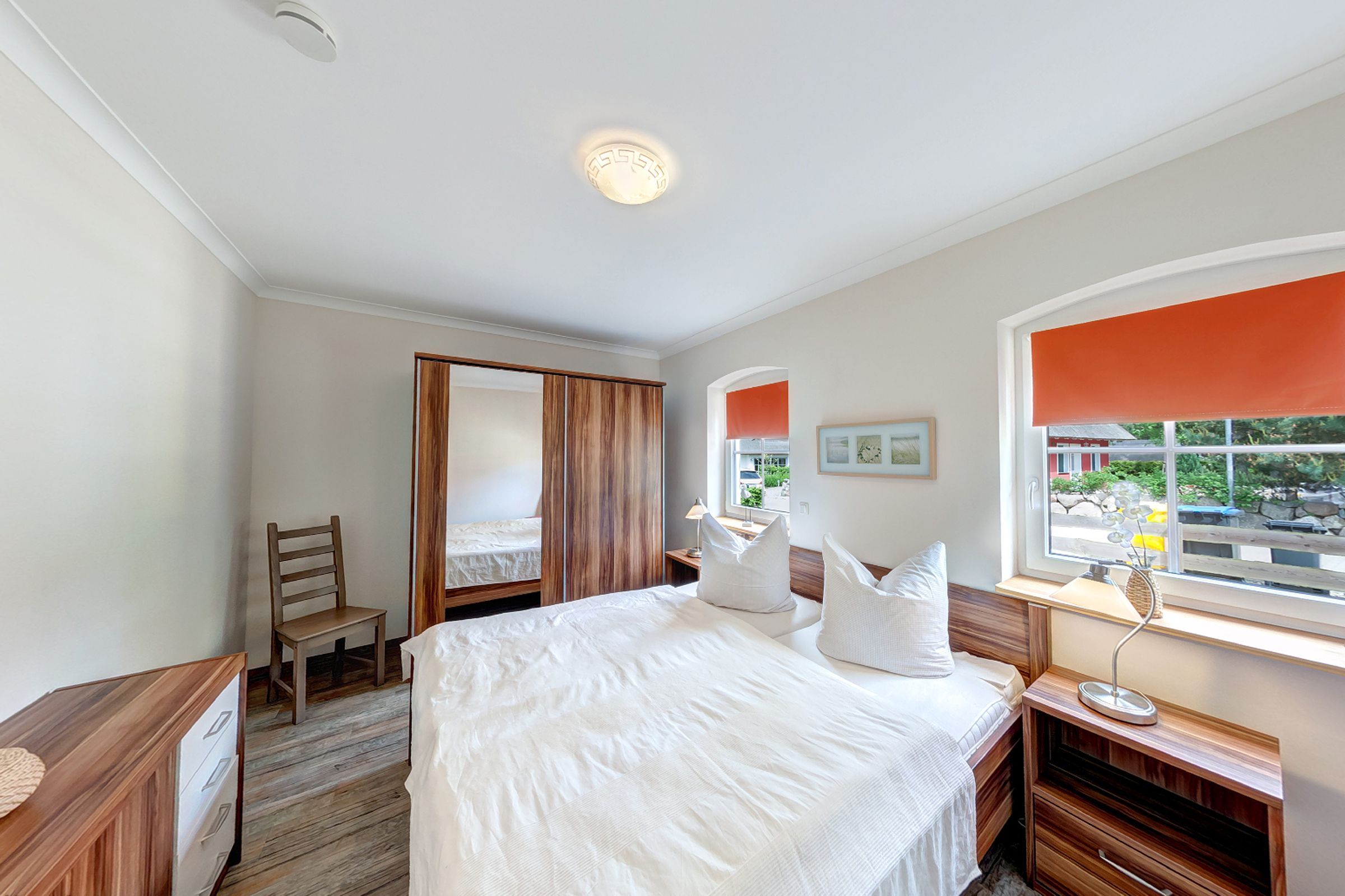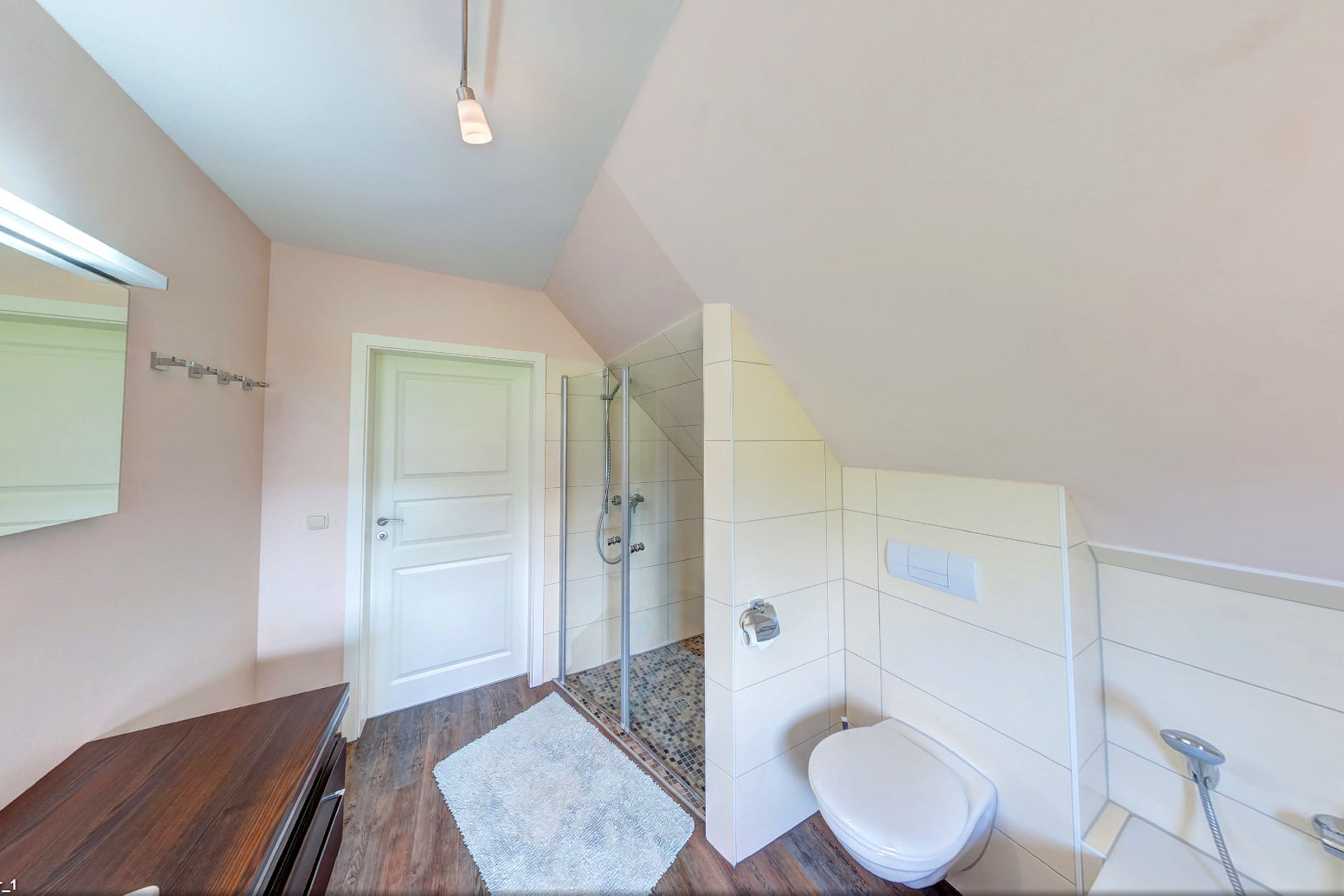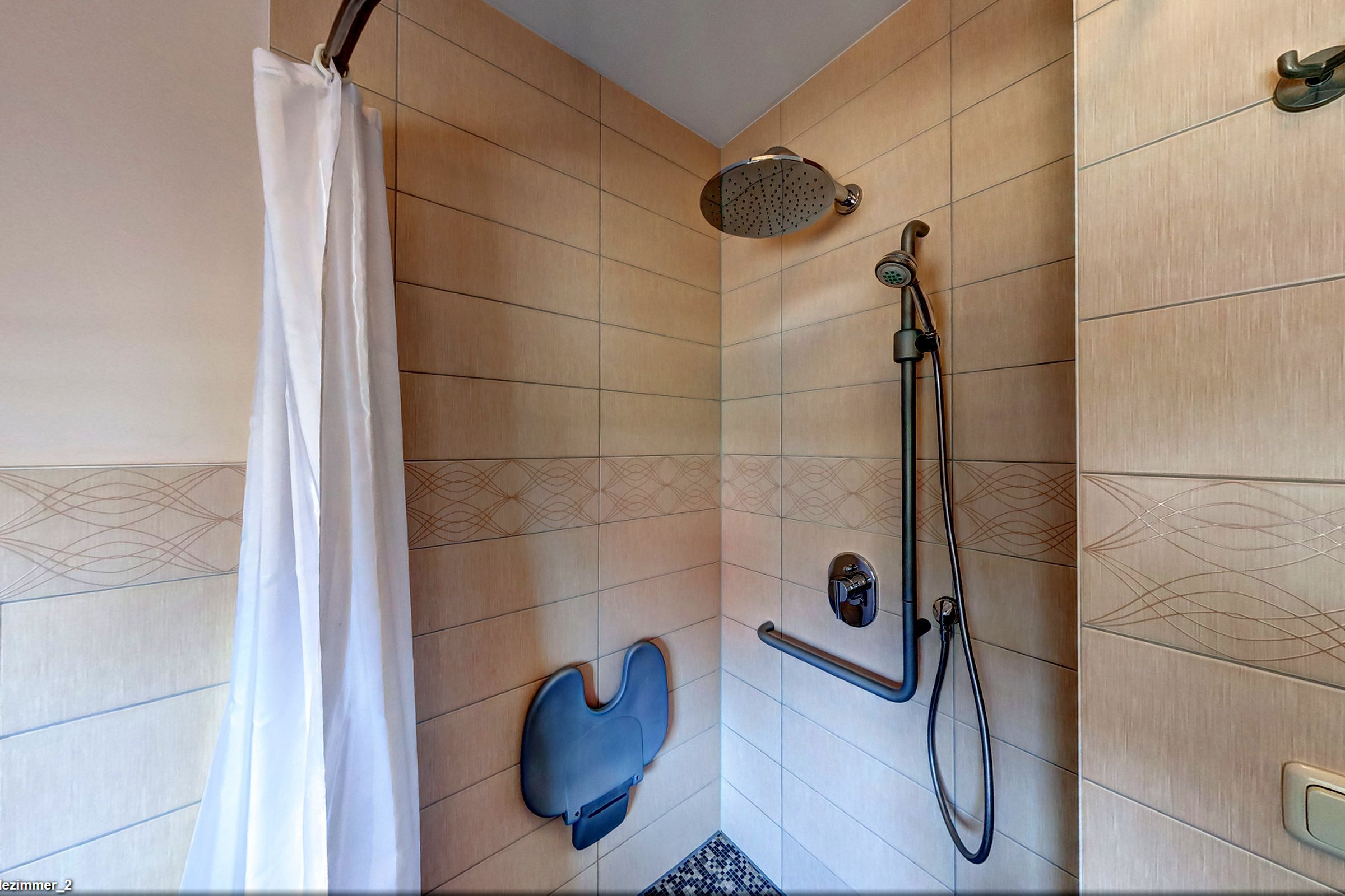 Ebenfalls im Erdgeschoss befindet sich ein Schlafzimmer mit einem komfortablen Doppelbett sowie ein behindertengerechtes Badezimmer mit Dusche und WC.