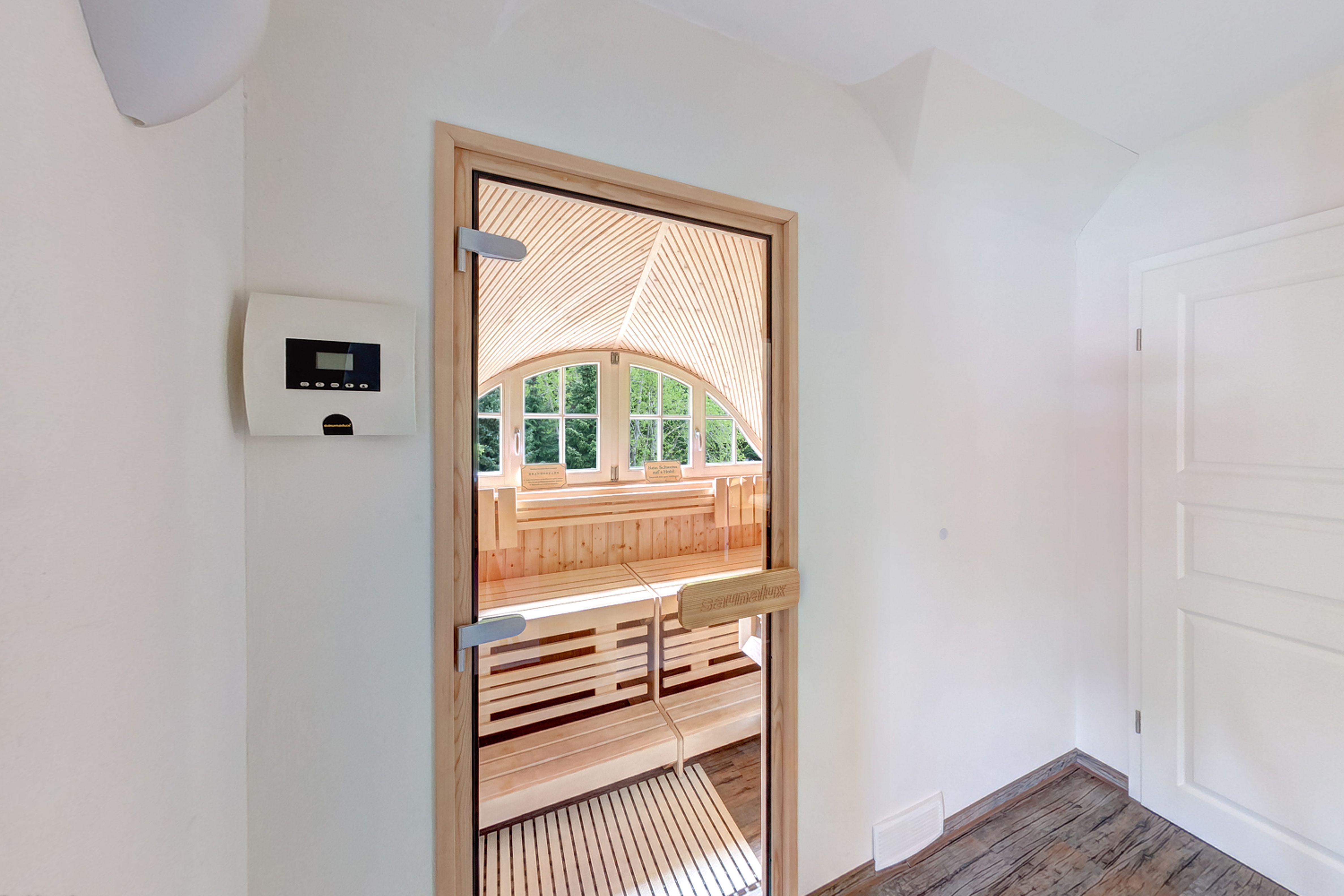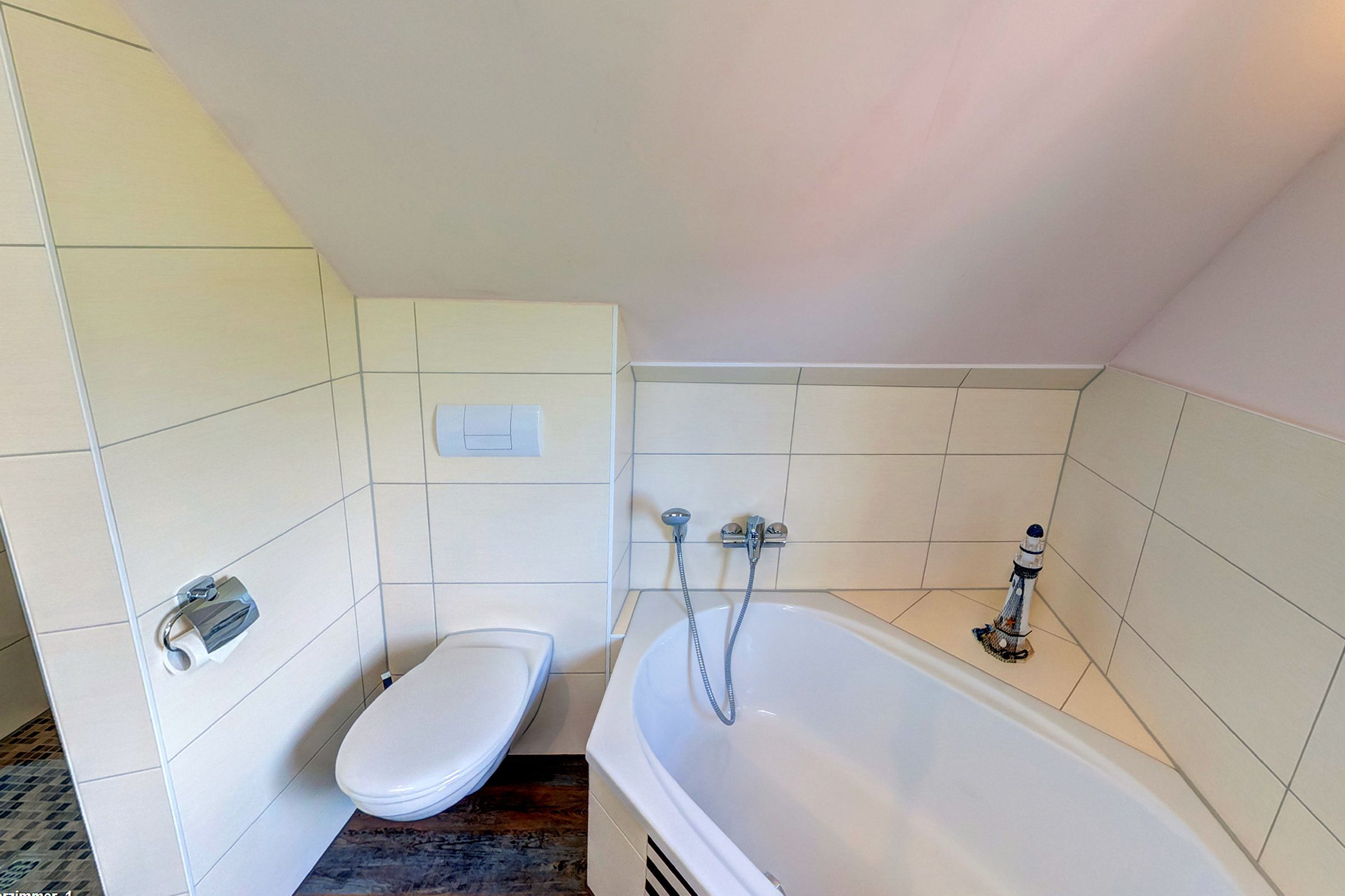 Über eine Treppe gelangen Sie ins Obergeschoss, wo zwei weitere Schlafzimmer mit je einem Doppelbett und einem Einzelbett auf Sie warten. In jedem dieser Zimmer kann auf Wunsch ein Babybett hinzugefügt werden. Hier finden Sie auch ein weiteres Badezimmer, das mit einer Dusche, einer Badewanne, WC und Waschbecken ausgestattet ist, sowie Ihre eigene private Sauna - der perfekte Ort, um nach einem langen Tag zu entspannen!