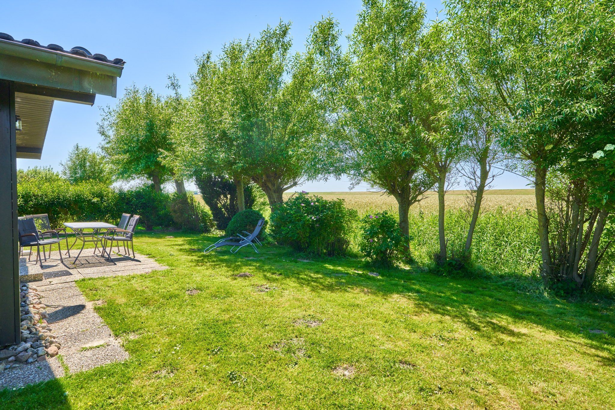 Terrasse in Westlage mit Gartenmöbel und Blick auf den Nordseedeich.