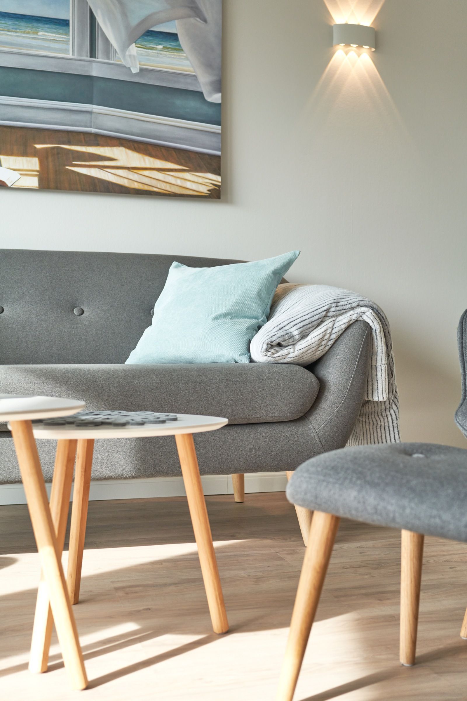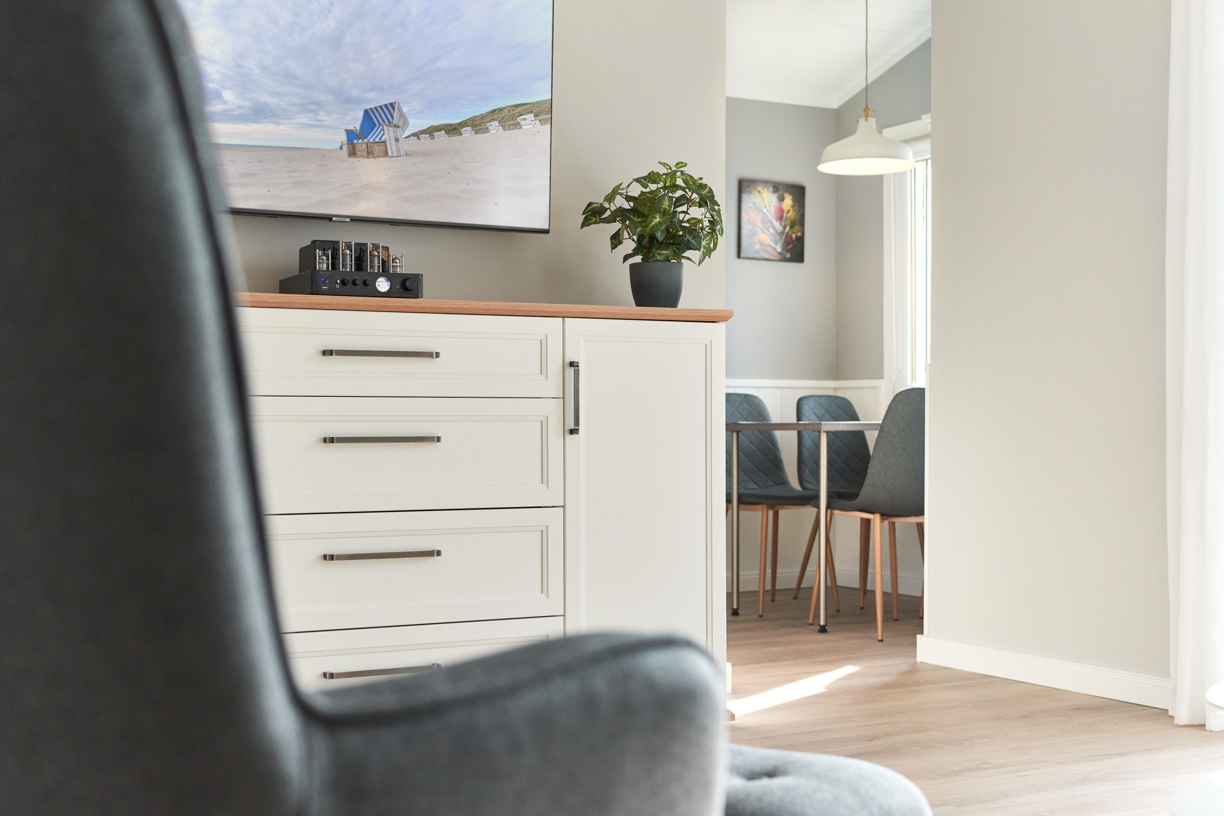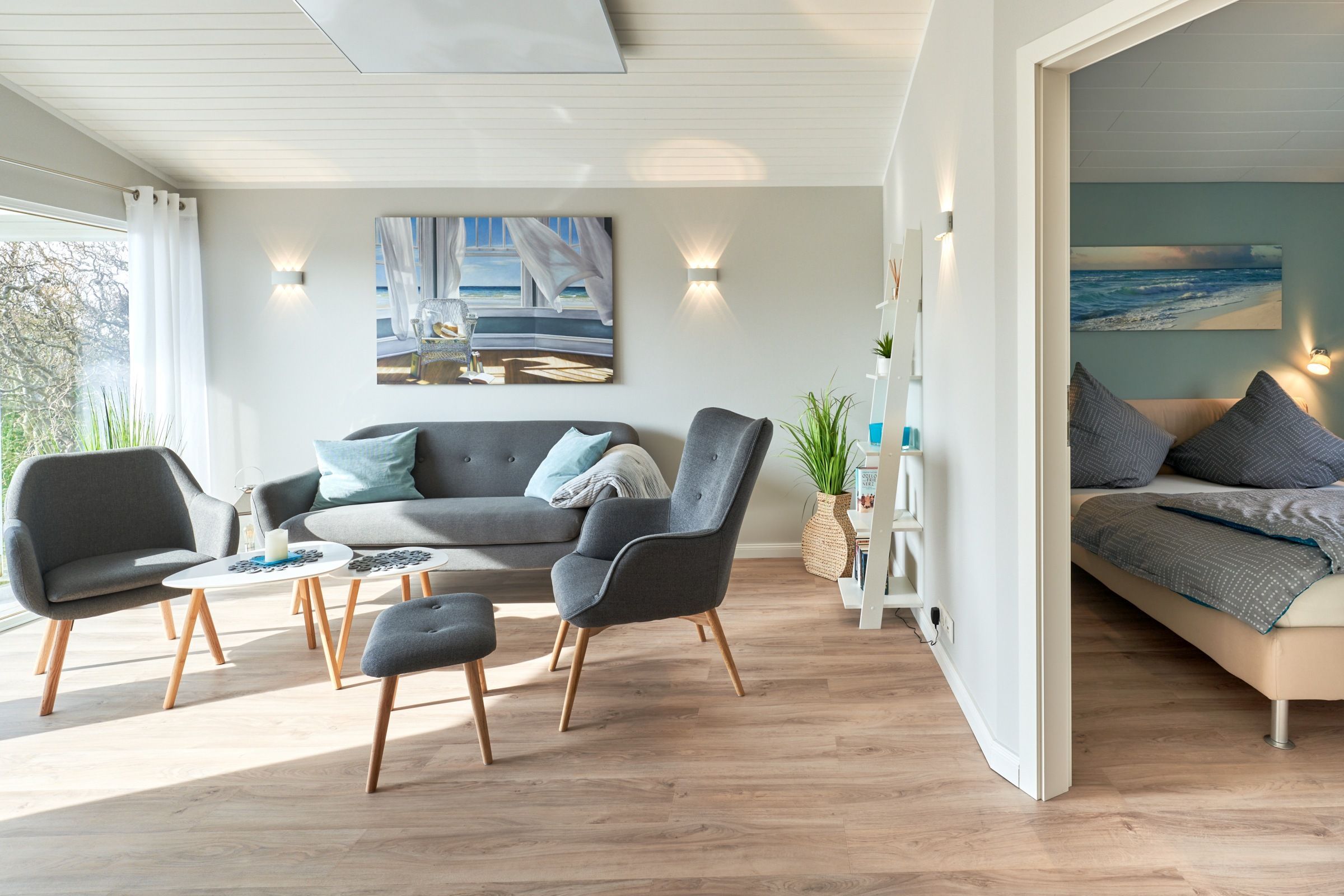 Das 2022 komplett renovierte Ferienhaus Mein Ankerpunkt ist der ideale Ort zum Entspannen und neue Energie tanken. In dem stilvoll eingerichteten und lichtdurchfluteten Haus finden auf 50 Quadratmetern bis zu vier Personen Platz. Das großzügige Wohnzimmer begeistert mit einer einladenden Sitzgruppe und großen Fenstern, die den Blick auf die sonnenverwöhnte Terrasse freigeben. Der 50-Zoll-Smart-TV bietet Zugang zu Netflix und Amazon Prime, um auch bei schlechtem Wetter unterhaltsame Stunden zu verbringen. Kostenloses WLAN steht ebenfalls zur Verfügung, und an heißen Tagen sorgt ein Deckenventilator für angenehme Kühle.