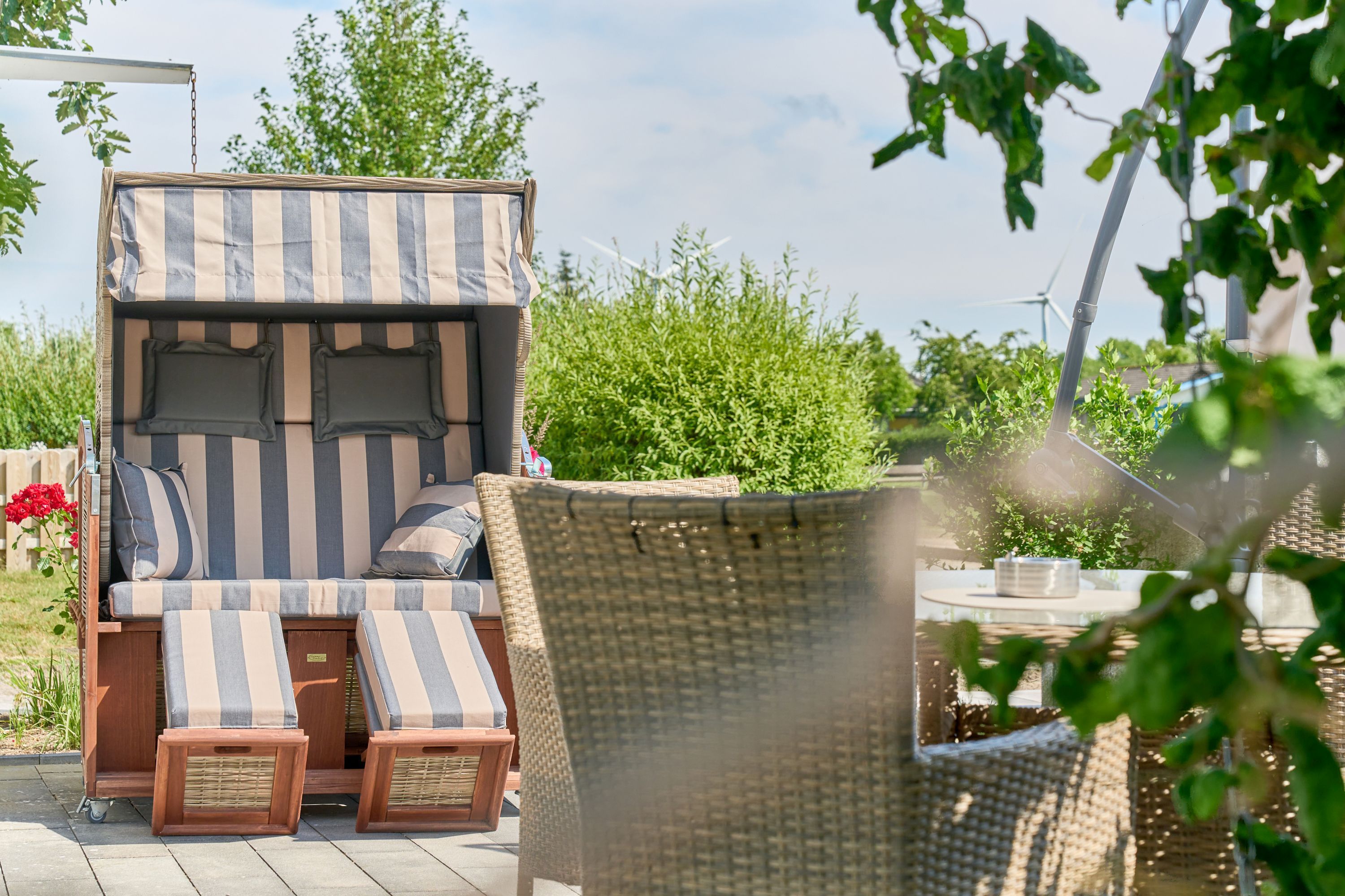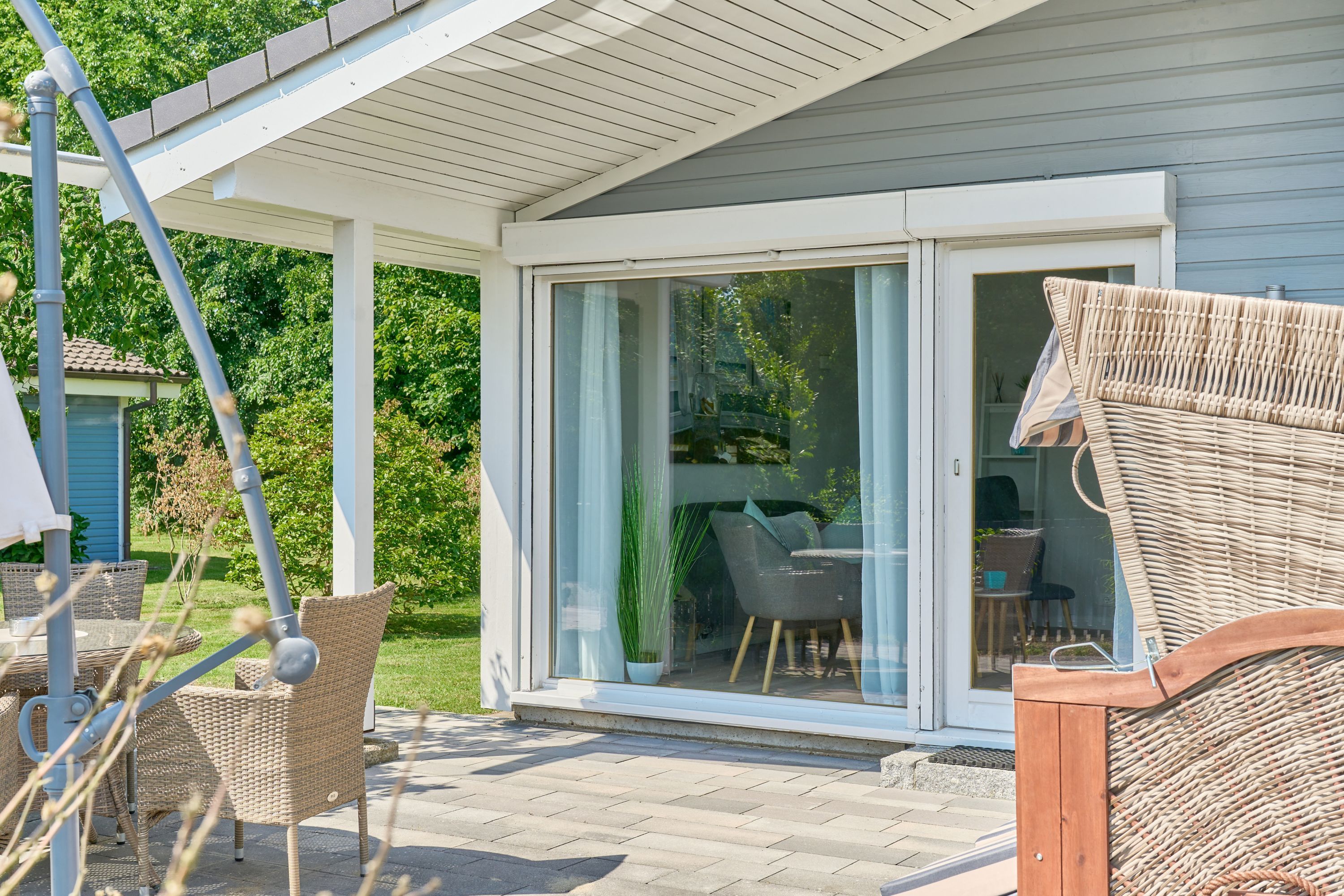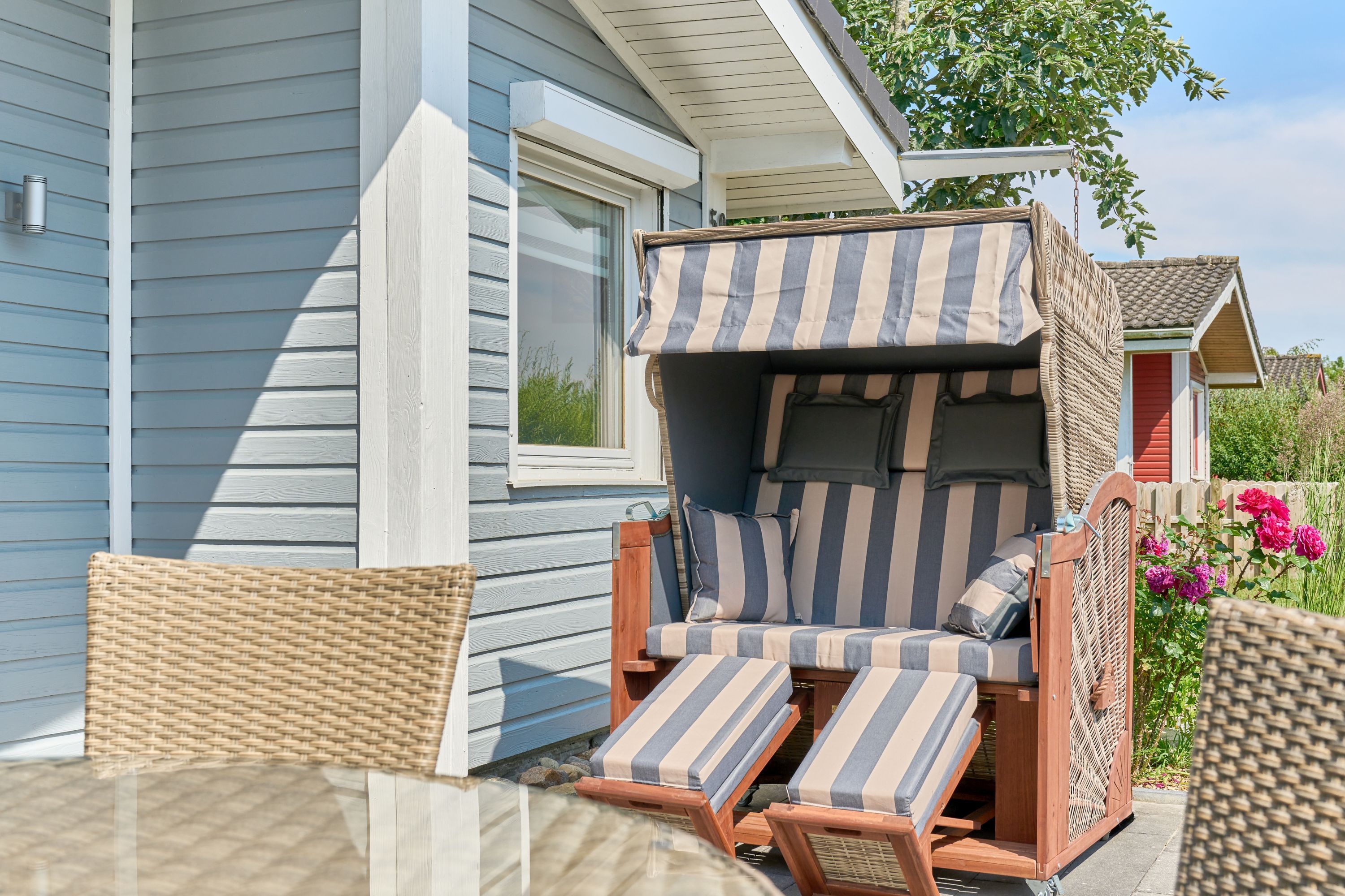 Das nach Süd-Westen ausgerichtete Haus verfügt über eine großzügige, teilweise überdachte Terrasse mit Gartenmöbeln und Strandkorb, die vom Wohnzimmer aus zugänglich ist, sowie eine kleinere, schattige und uneinsehbare Terrasse hinter dem Haus - ideal für heiße Sommertage.