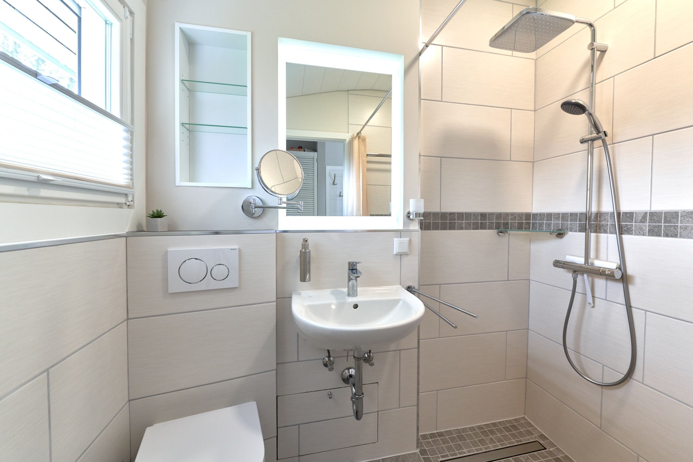 In der modernen, vollausgestatteten Küchenzeile finden Sie alle nötigen Elektrogeräte, inklusive einer Tassimo-Kapselmaschine. Ein Esstisch mit vier Stühlen lädt zum geselligen Beisammensein ein. Das hochwertige Duschbad punktet mit einer bodengleichen Dusche, Regenwaldduschkopf, Handbrause und Fußbodenheizung, während ein erhöhtes Fenster frische Luft hereinlässt.