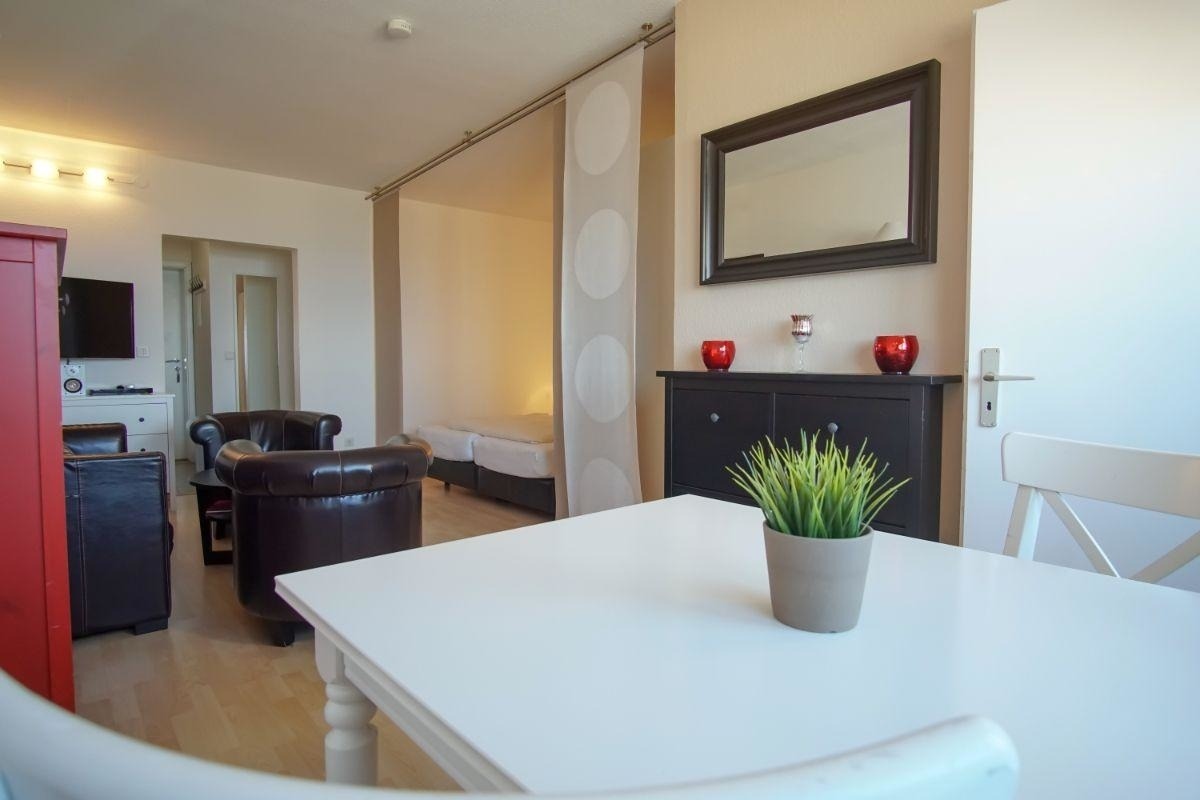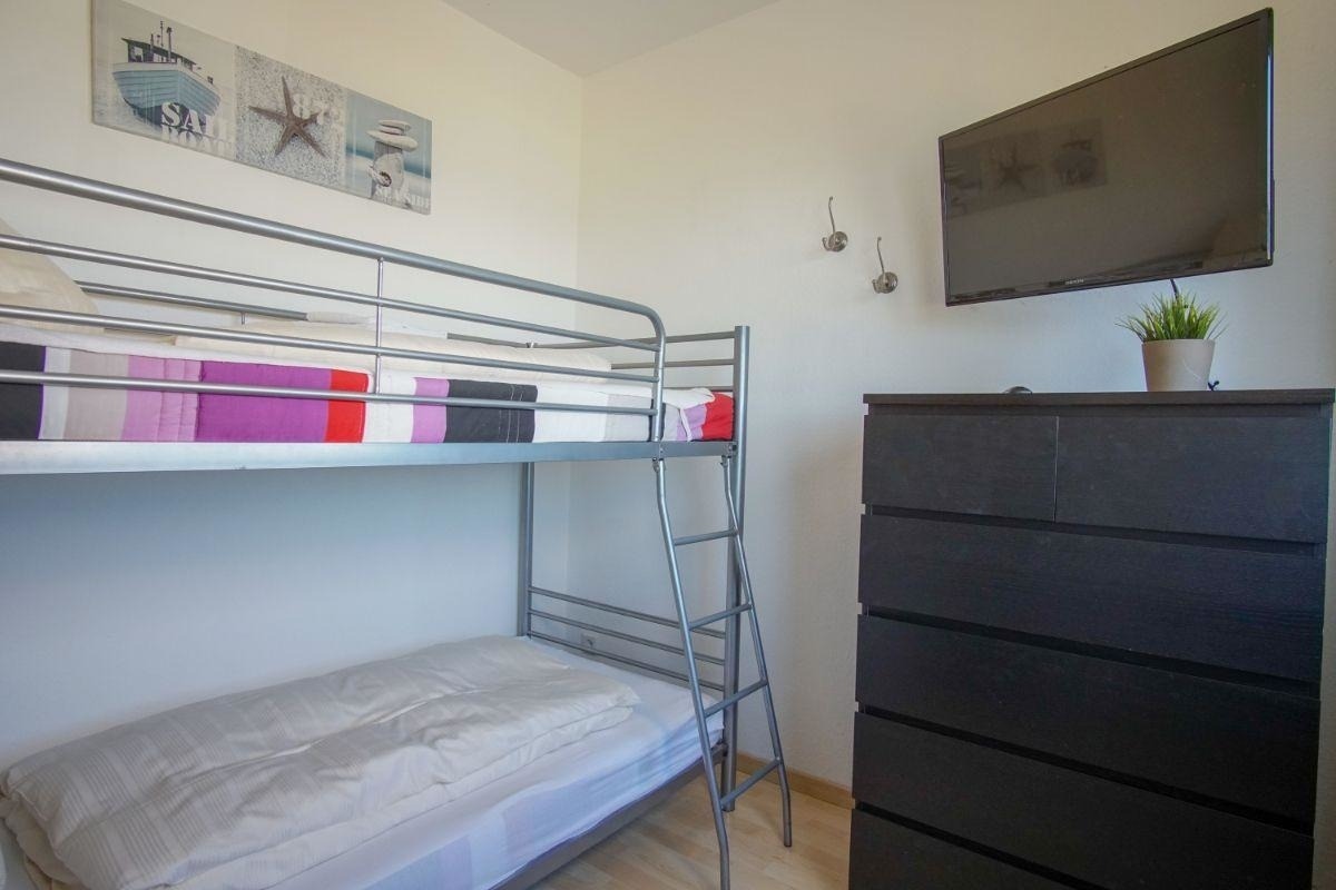 Die gemütliche 2 Zimmer-Wohnung befindet sich in der zweiten Etage des Hauses (Aufzug vorhanden) und verfügt auf ihren ca. 41 m² über einen kombinierten, hellen Wohn-Schlafbereich mit einem gemütlichen Doppelbett (ca. 180x200), sowie eine großzügige Einbauküche. Vom Wohnbereich aus hat man einen tollen Ausblick direkt zum Meer. Das Kinderzimmer verfügt über ein Etagenbett - ideal für Kinder und Teenager.