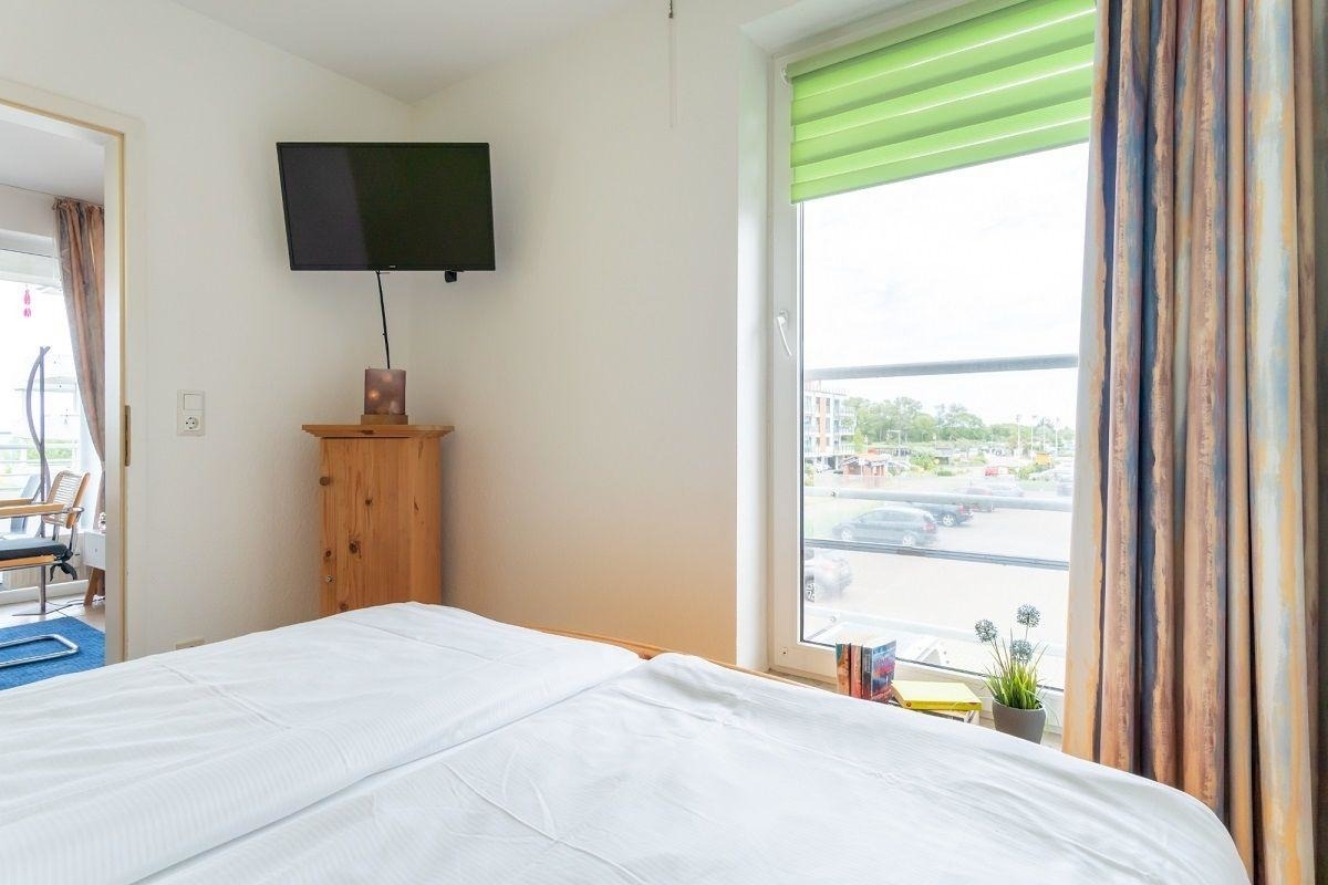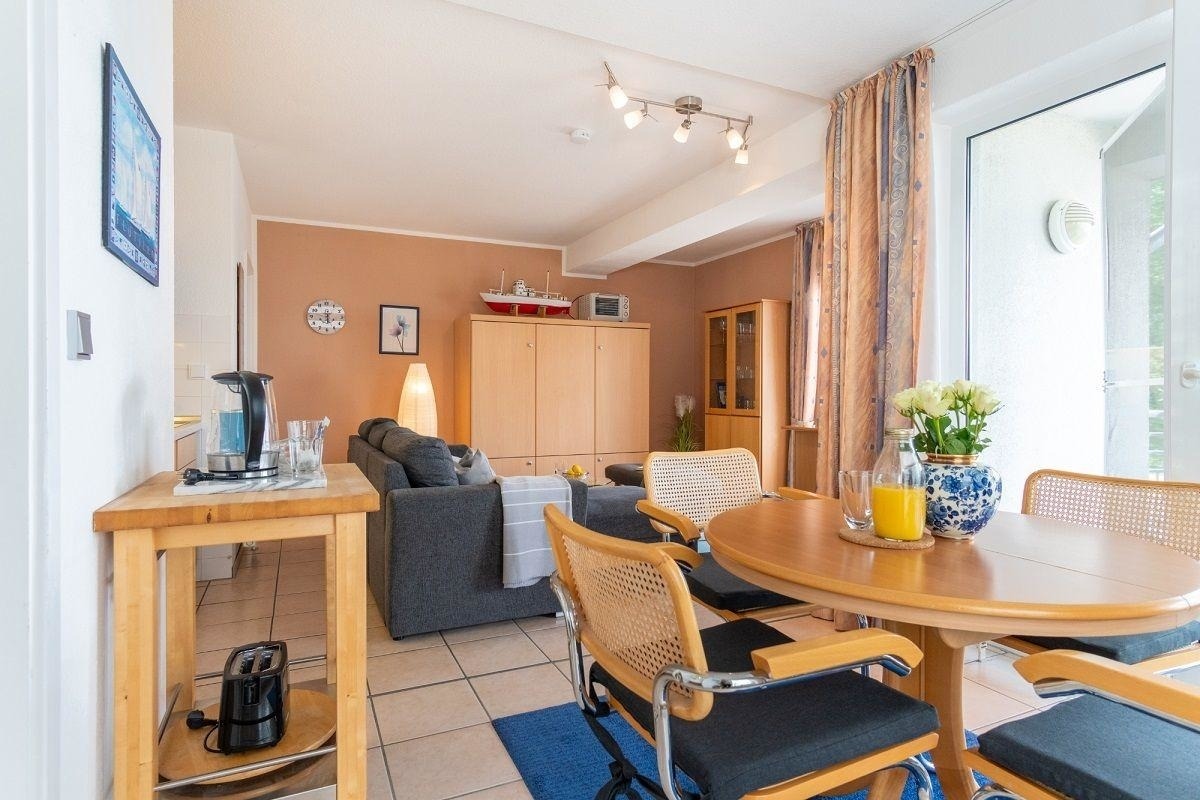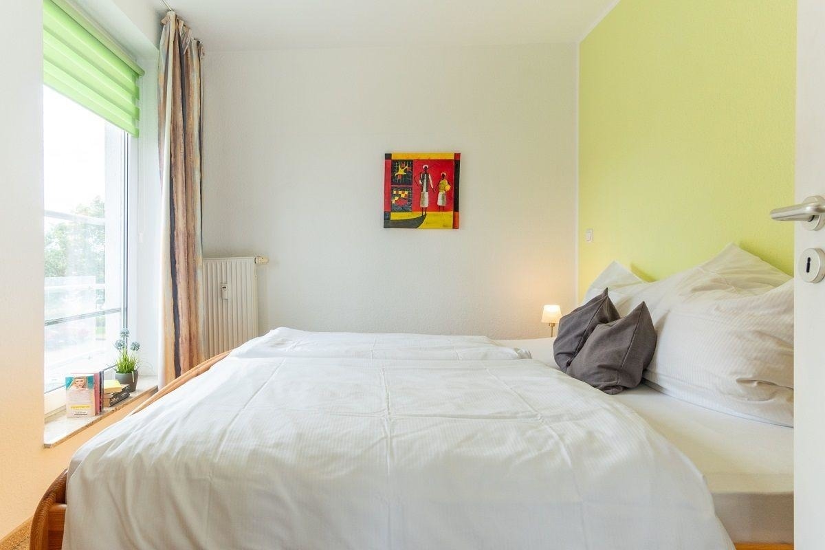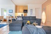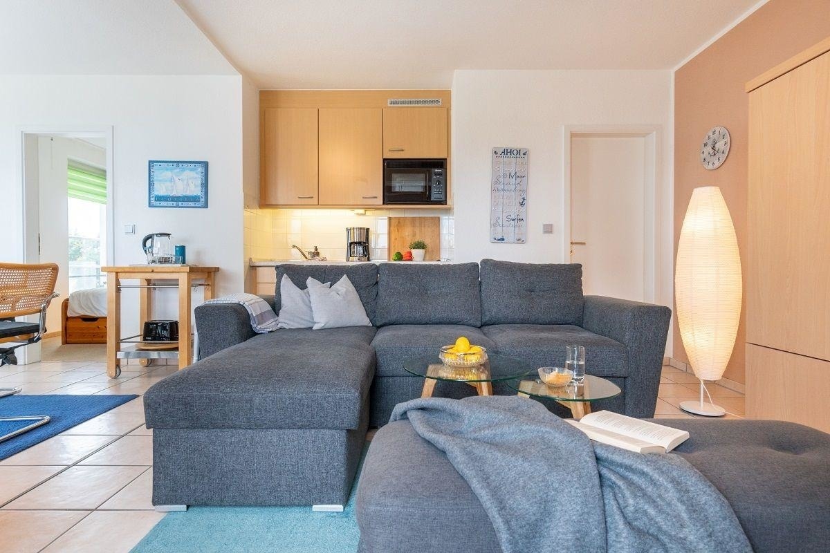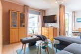 Die gemütliche 40m²-Wohnung befindet sich in der ersten Etage (Aufzug vorhanden) und verfügt über ein separates Schlafzimmer mit Doppelbett (ca. 160 x 200 cm) und einen hellen Wohn- und Essbereich. Als dritter Schlafplatz steht im Wohnbereich ein Schrankbett für eine Person zur Verfügung.