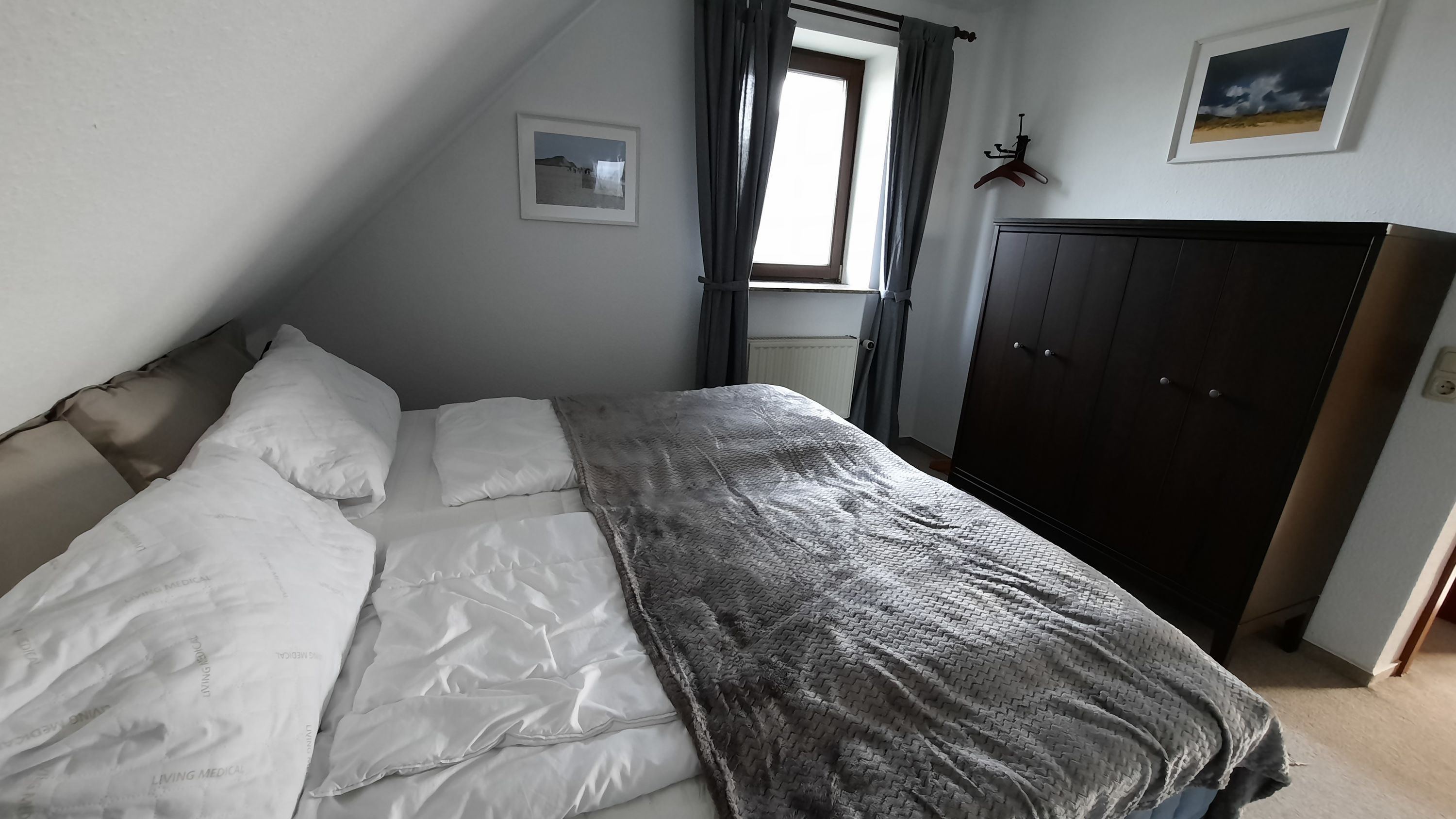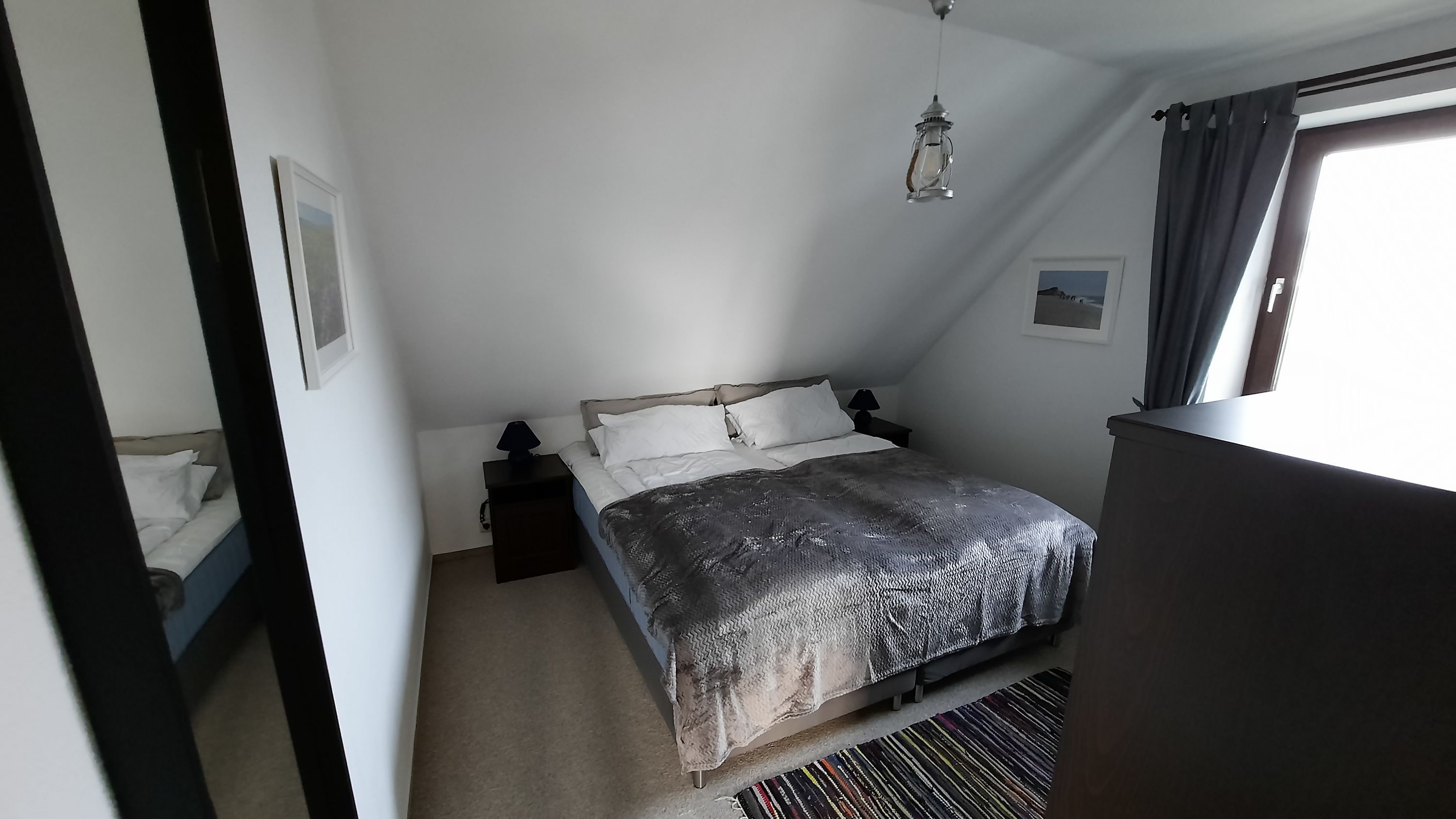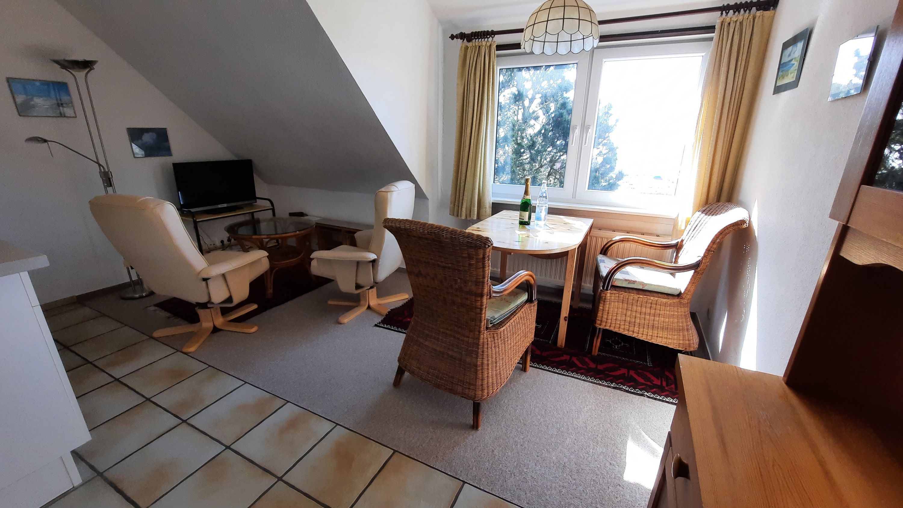 Diese kleine Ferienwohnung für zwei Personen im Haus Meerblick hat zwei getrennte Zimmer, davon ein neues Schlafzimmer mit Boxspringbett, und ein Wohnzimmer mit Küchenzeile.