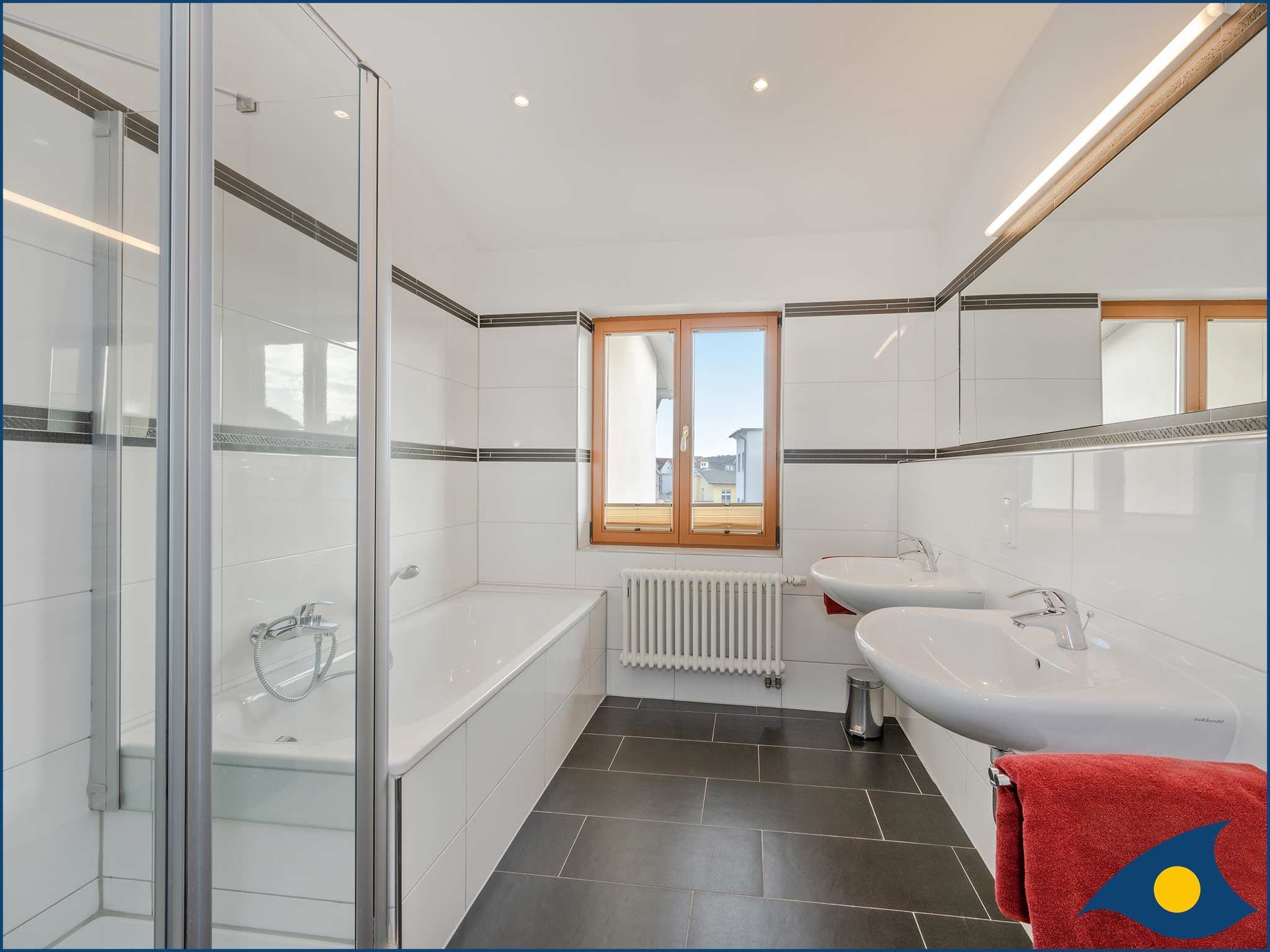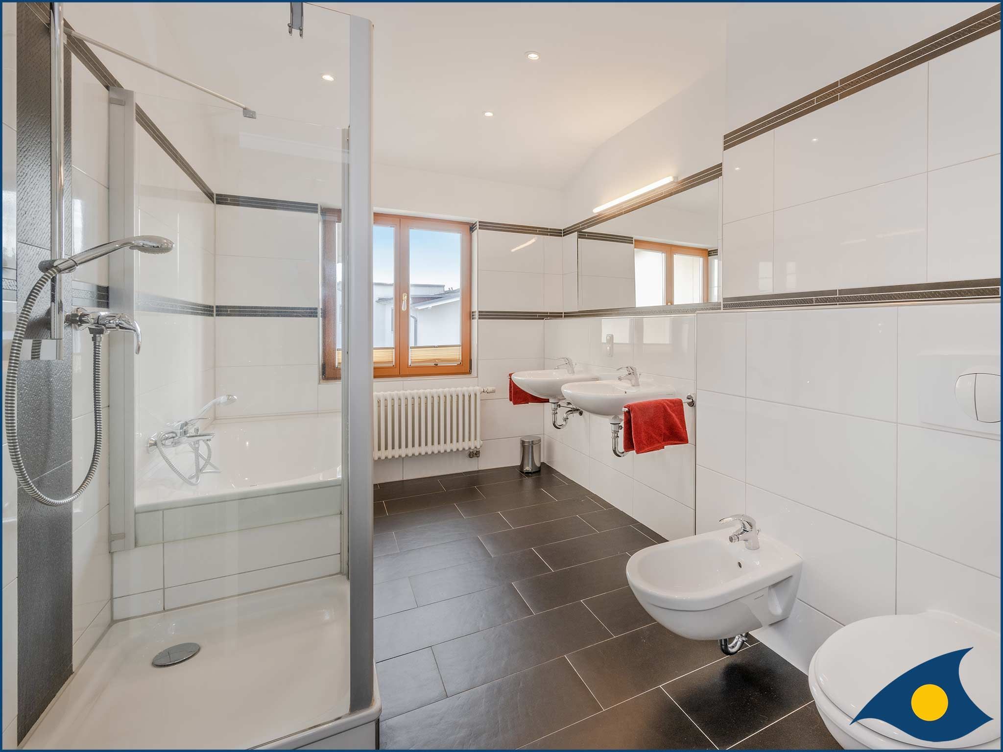 Das Tageslicht-Badezimmer überzeugt mit Badewanne und Dusche sowie zwei Waschbecken und Bidet.