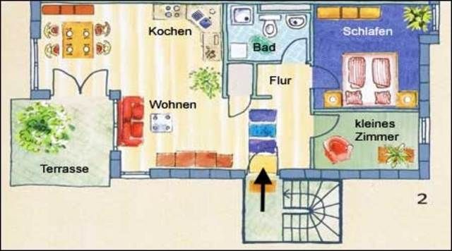 Die Wohnung ist 64 qm groß und bietet ausreichend Platz für 2-4 Personen. Die Wohnung liegt ebenerdig mit direktem Zugang zu Terrasse und Garten.(Grundriss)