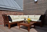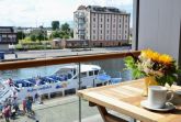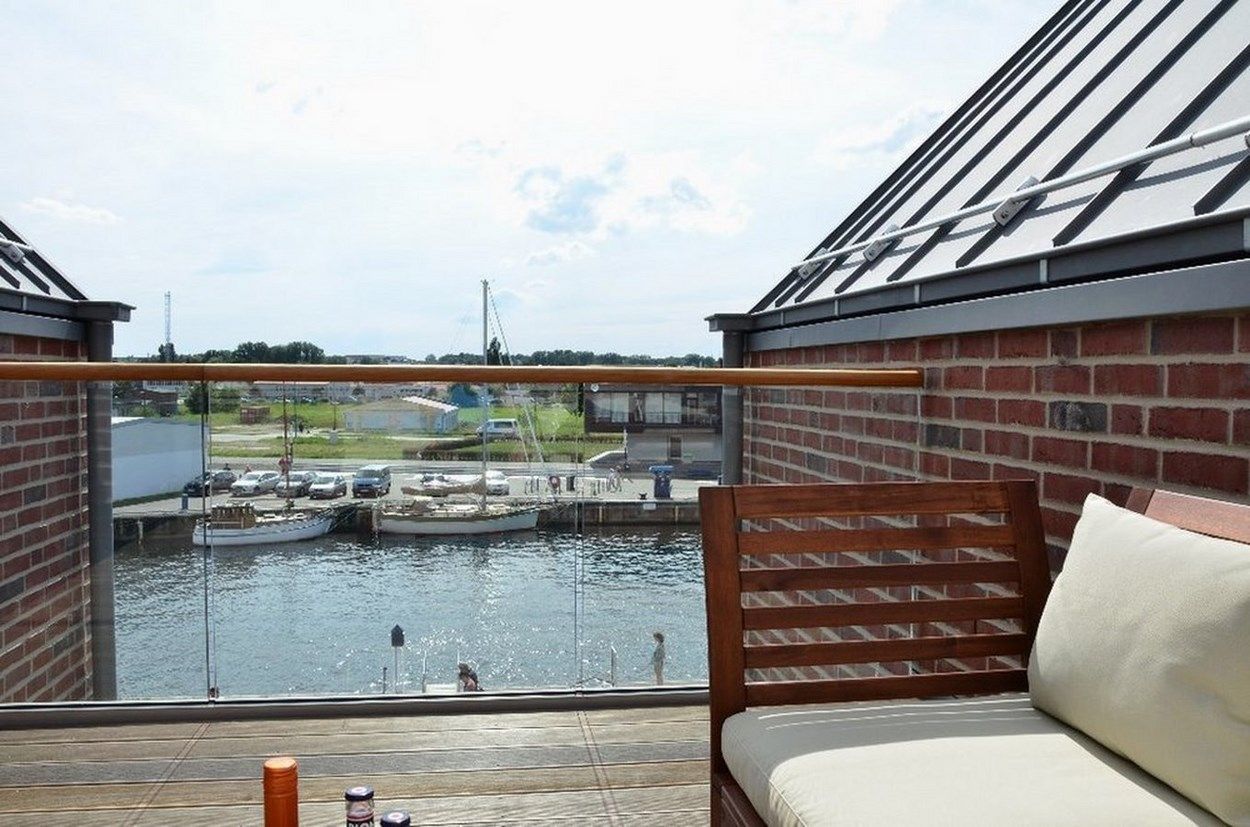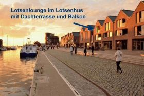 Unsere Ferienwohnung Lotsenlounge befindet sich im Lotsenhus, hat eine Loggia, von der Sie den wunderbaren Ausblick auf den Alten Hafen und Wismars Kirchen genießen können sowie eine einmalig gelegene Sonnenterrasse in Südwestlage mit Loungemöbeln.