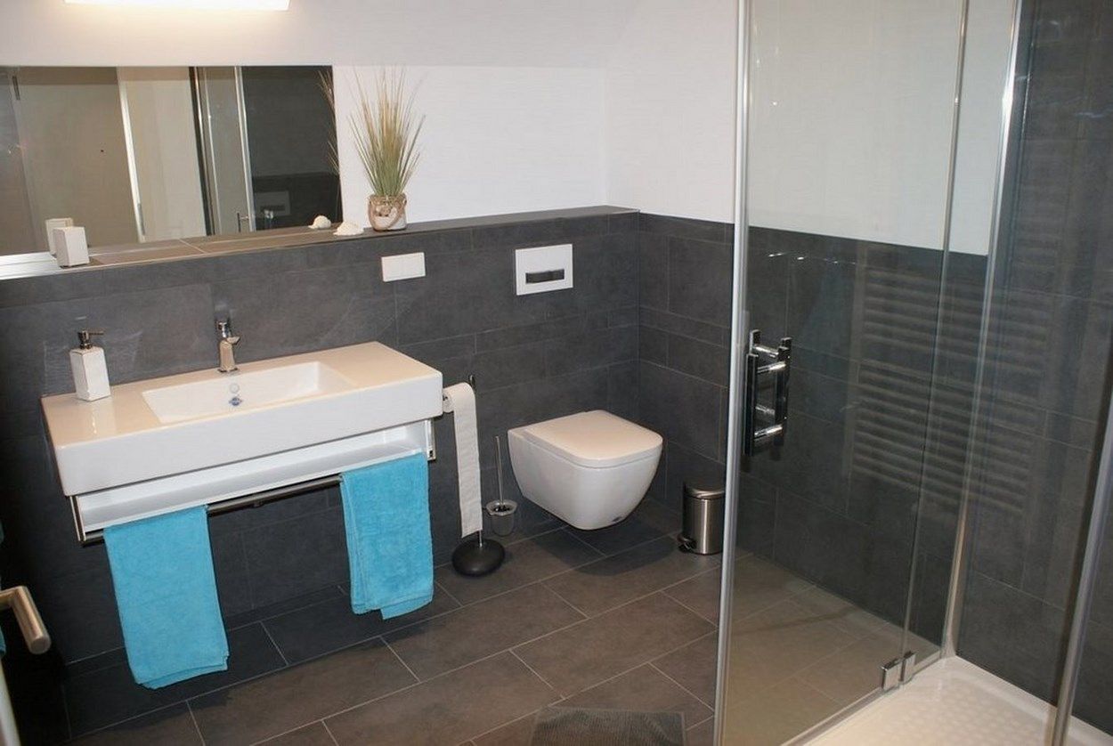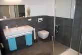 - Badezimmer mit Dusche, WC, großen Spiegelschrank