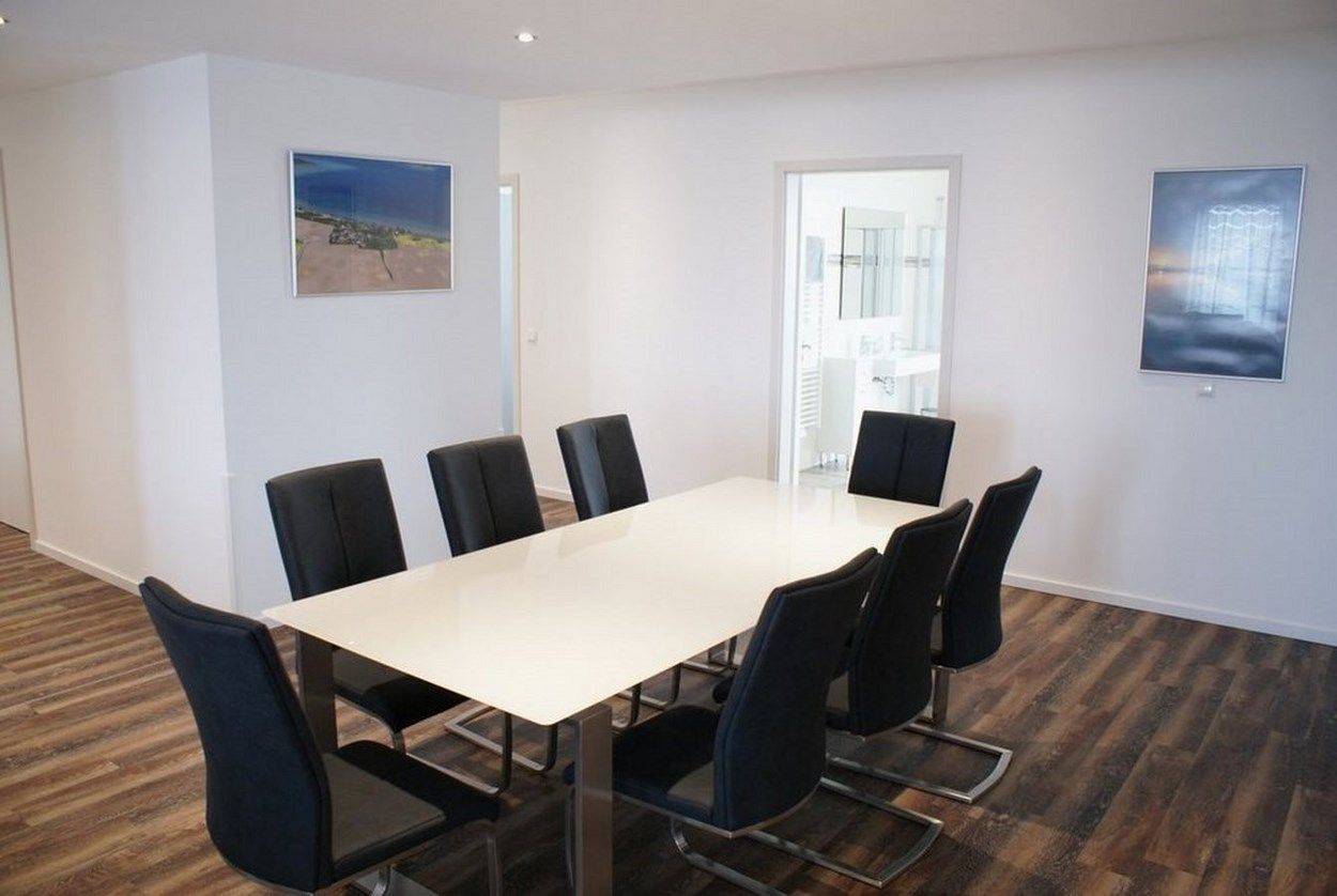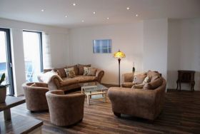 - Wohnzimmer mit 2 Sofas, 2 Sessel und offener Küche vollausgestattet mit Barbereich und 3 Barhocker