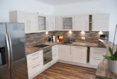 Küchenausstattung: Side-by-Side Kühlschrank mit Eisaufbereiter und Gefrierfach, Geschirrspüler, Backofen, Kaffeemaschine, Wasserkocher, Toaster, Geschirr, Besteck, Töpfe, Pfannen uvm.