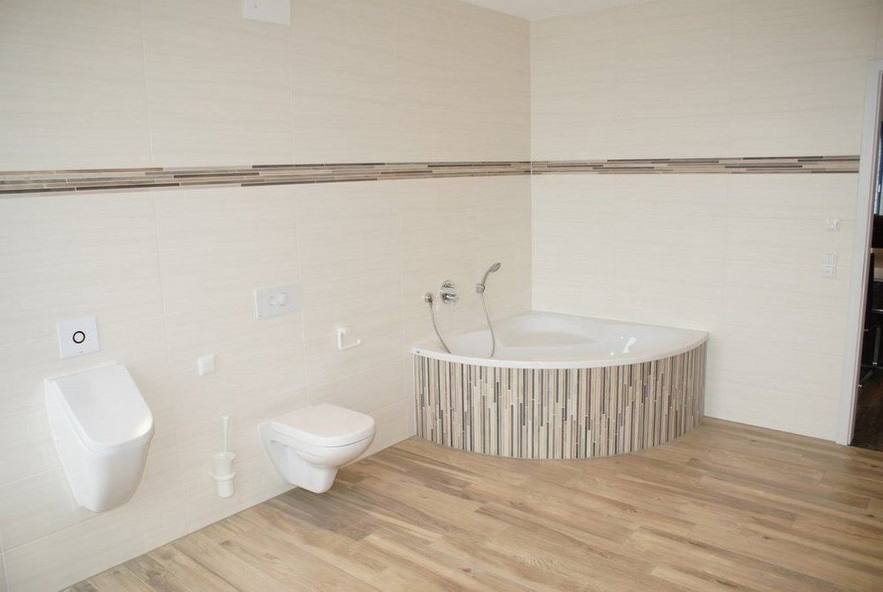 - Badezimmer 1 mit Badewanne, Dusche, Pissoir, WC, Spiegel, Waschbecken, Waschmaschine