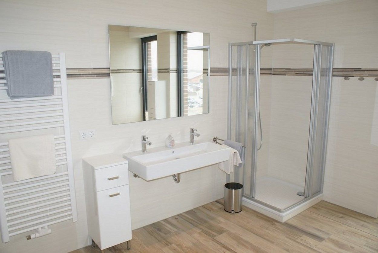 - Badezimmer 2 mit Dusche, WC, Spiegel, Waschbecken