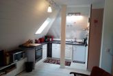 Das Wohnzimmer mit offener Küche und Eßbereich, ausgestattet mit TV-Sat, Radio, Couch (als Schlafcouch - ausgezogen 1,40 x 2,00 m) für 1 Person geeignet und Sitzgruppe mit Hochstuhl. Küchenzeile ausgestattet mit 2-Platten-Herd,Backofen, Kühlschrank mit Gefrierfach, Wasserkocher, Kaffeemaschine und Toaster, Mikrowelle, Laminatboden.