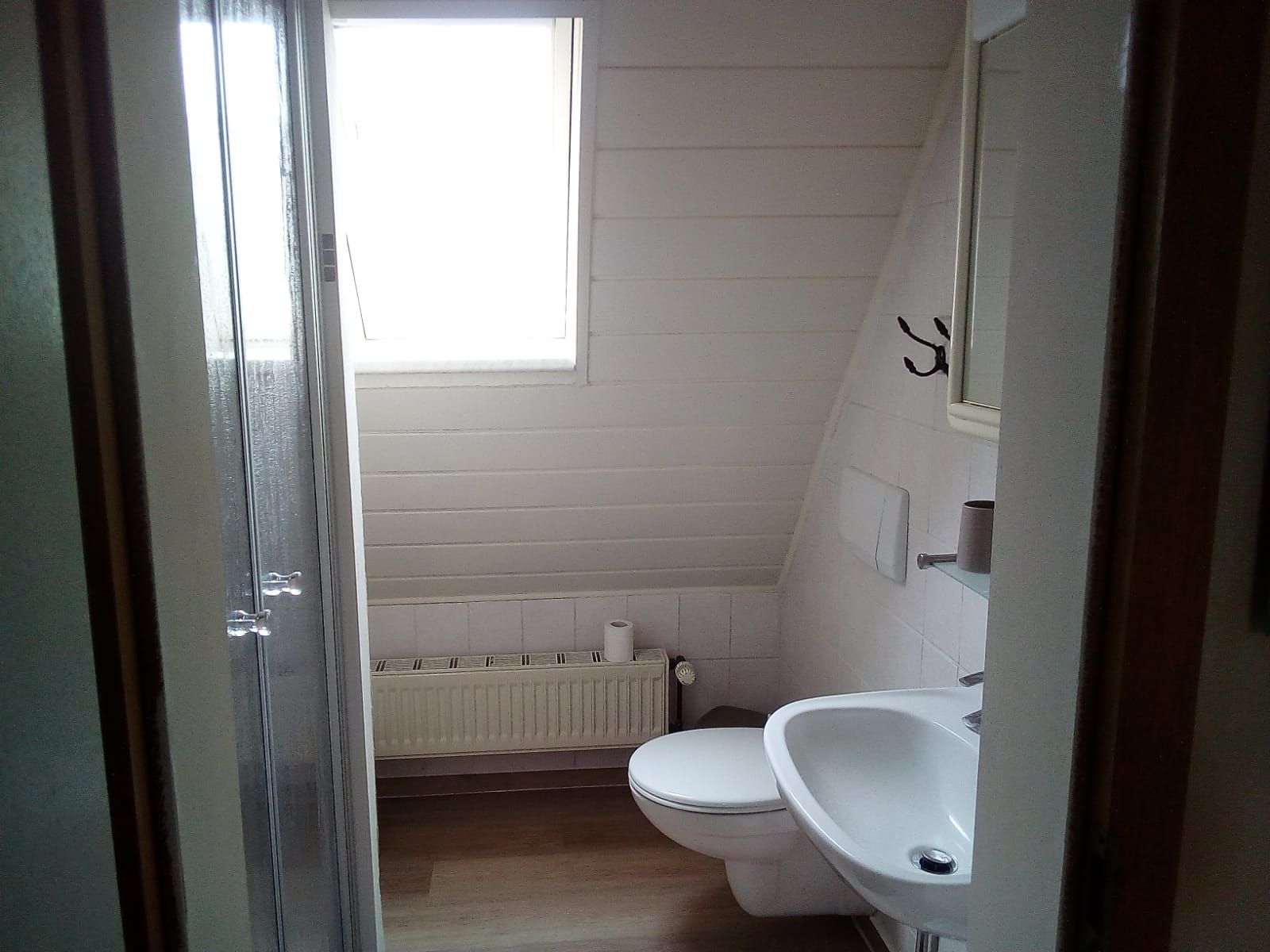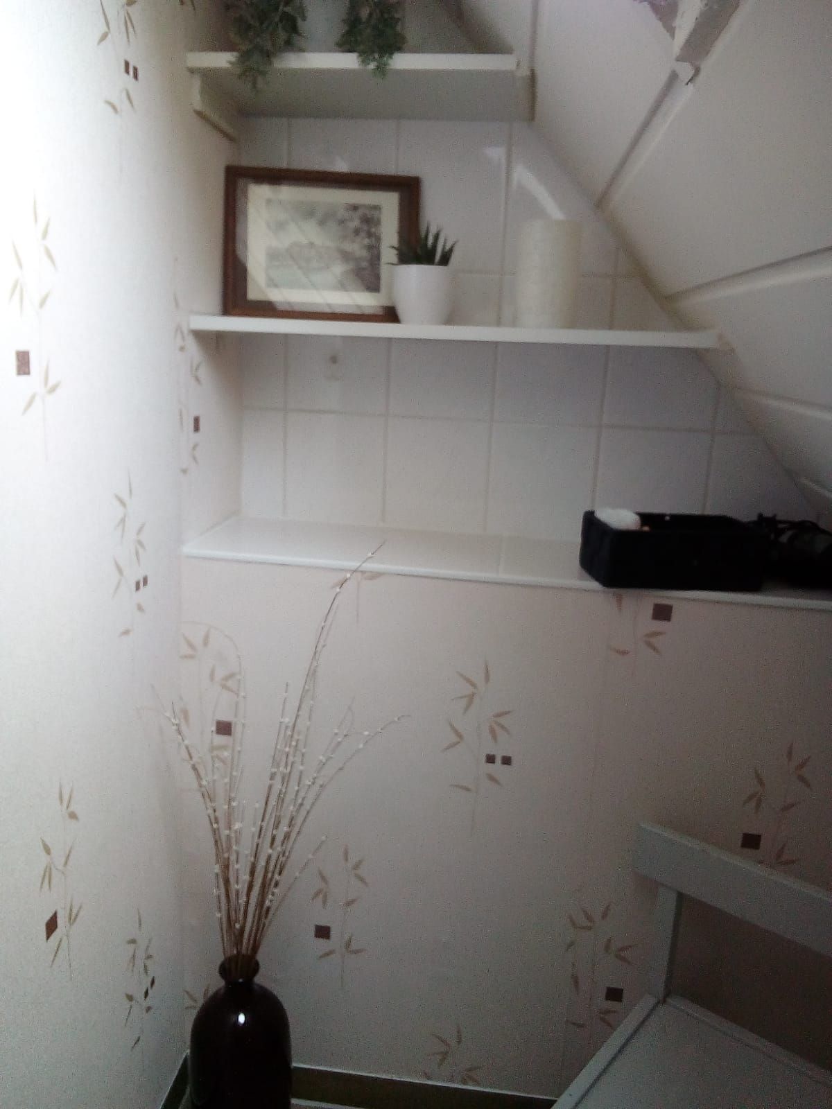 Separater Eingang und steile Holztreppe ins 1. Obergeschoss. Ein Treppenschutzgitter bietet Sicherheit für kleine Besucher. 2 Schlafräume und 1 Wohn/Schlafraum mit Küchenzeile, Badezimmer mit Dusche/WC und Fön.