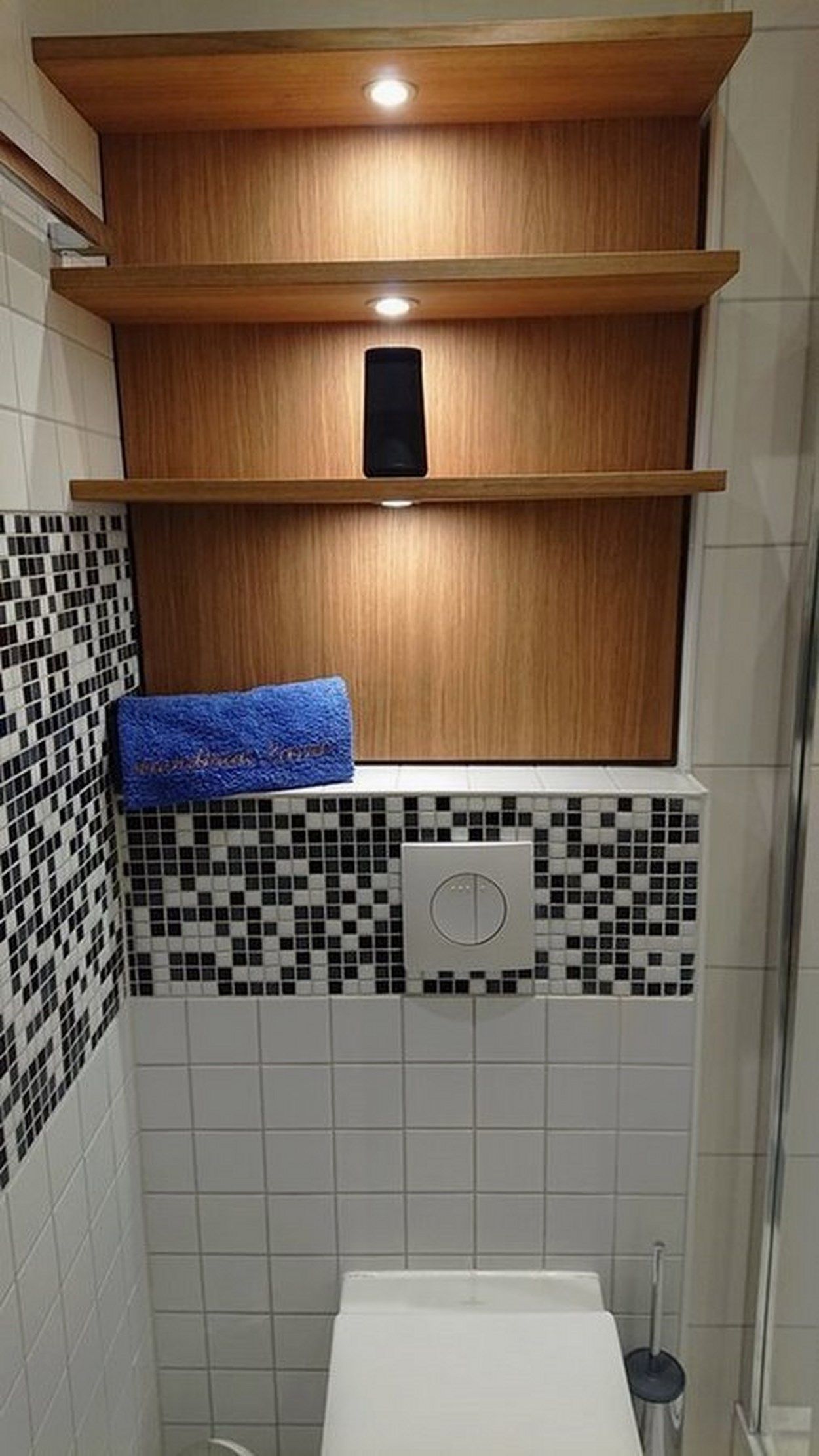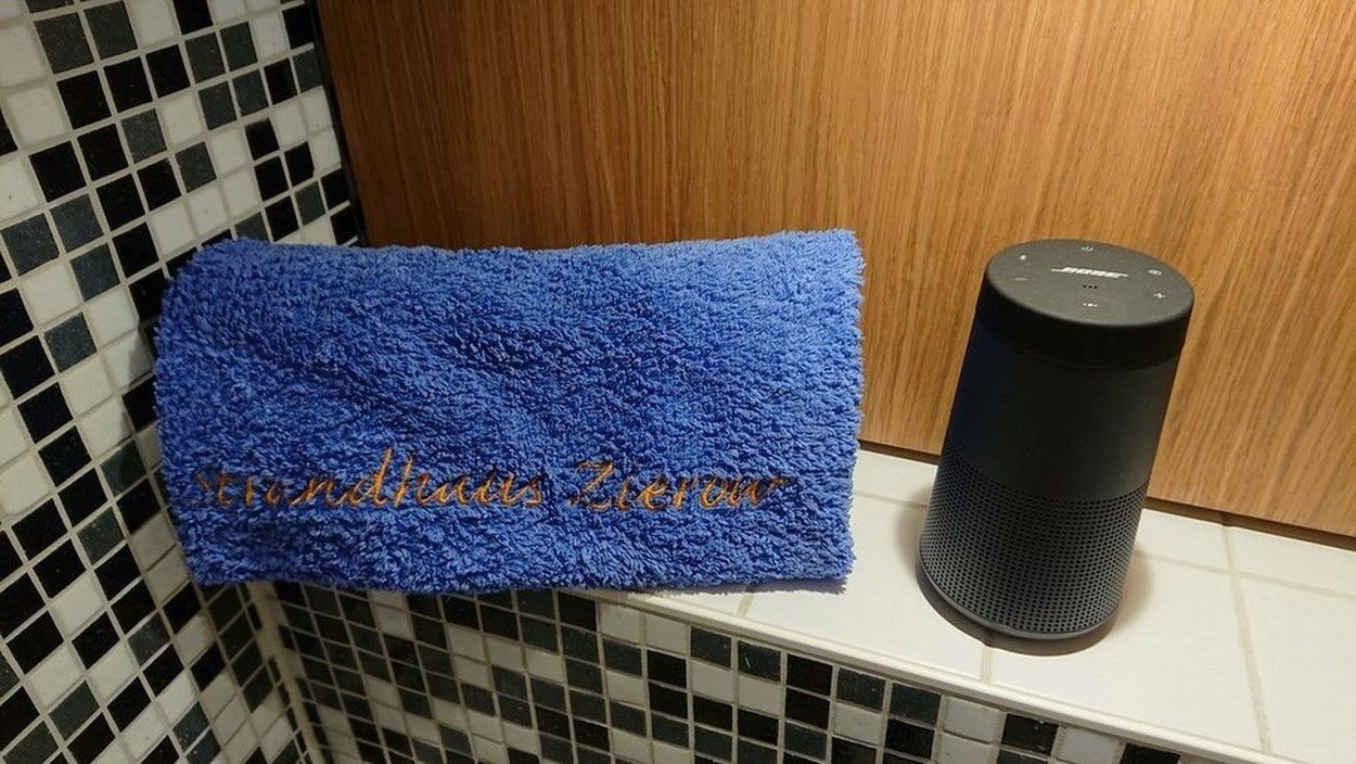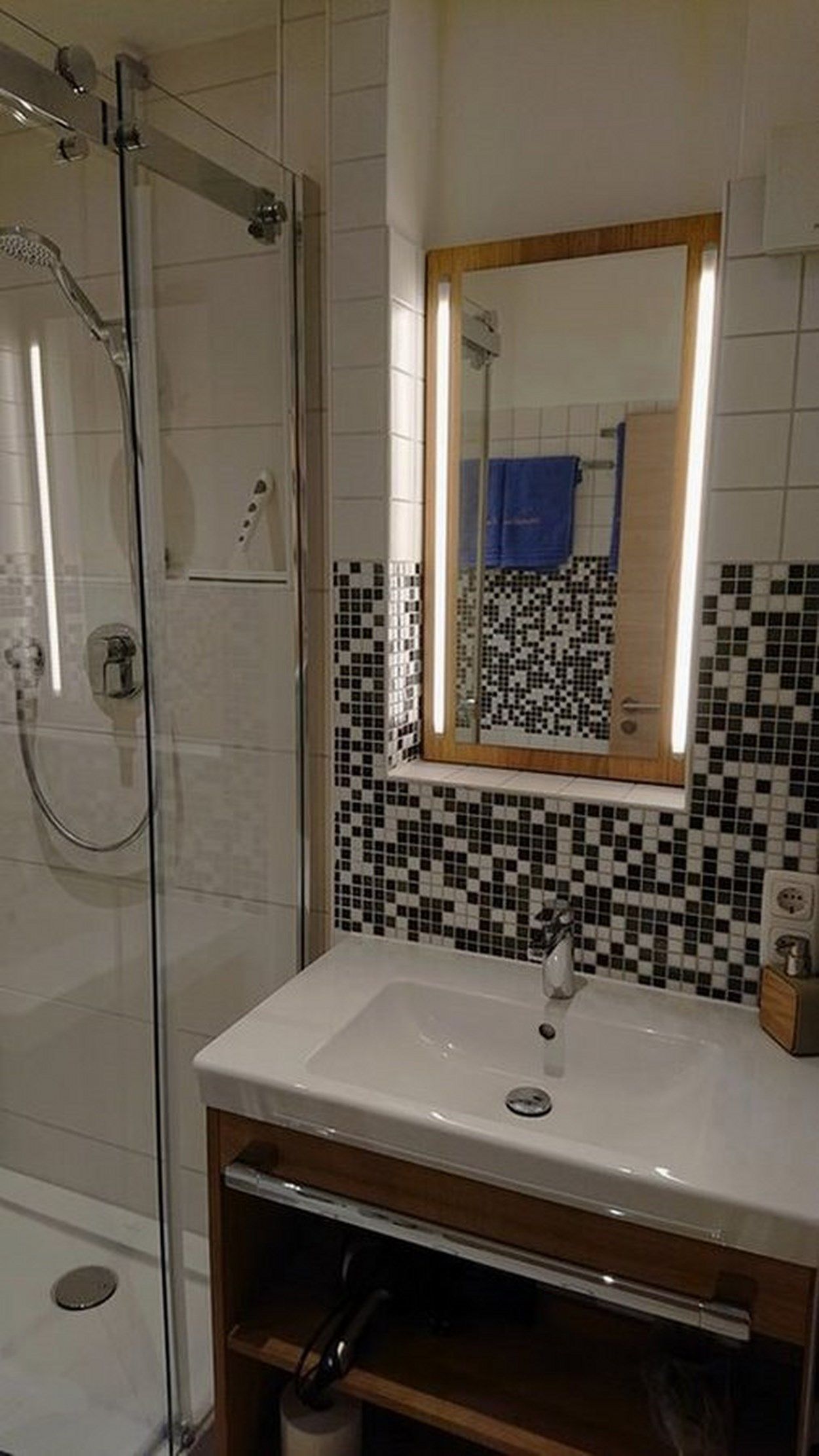 Das komfortable Bad ist ausgestattet mit WC, Fußbodenheizung, Waschtisch, Wellnessdusche (mit Massagefunktion, Stimmungsbeleuchtung und Radio), Kosmetikspiegel, Haartrockner, Handtücher und bietet viele Ablagemöglichkeiten.