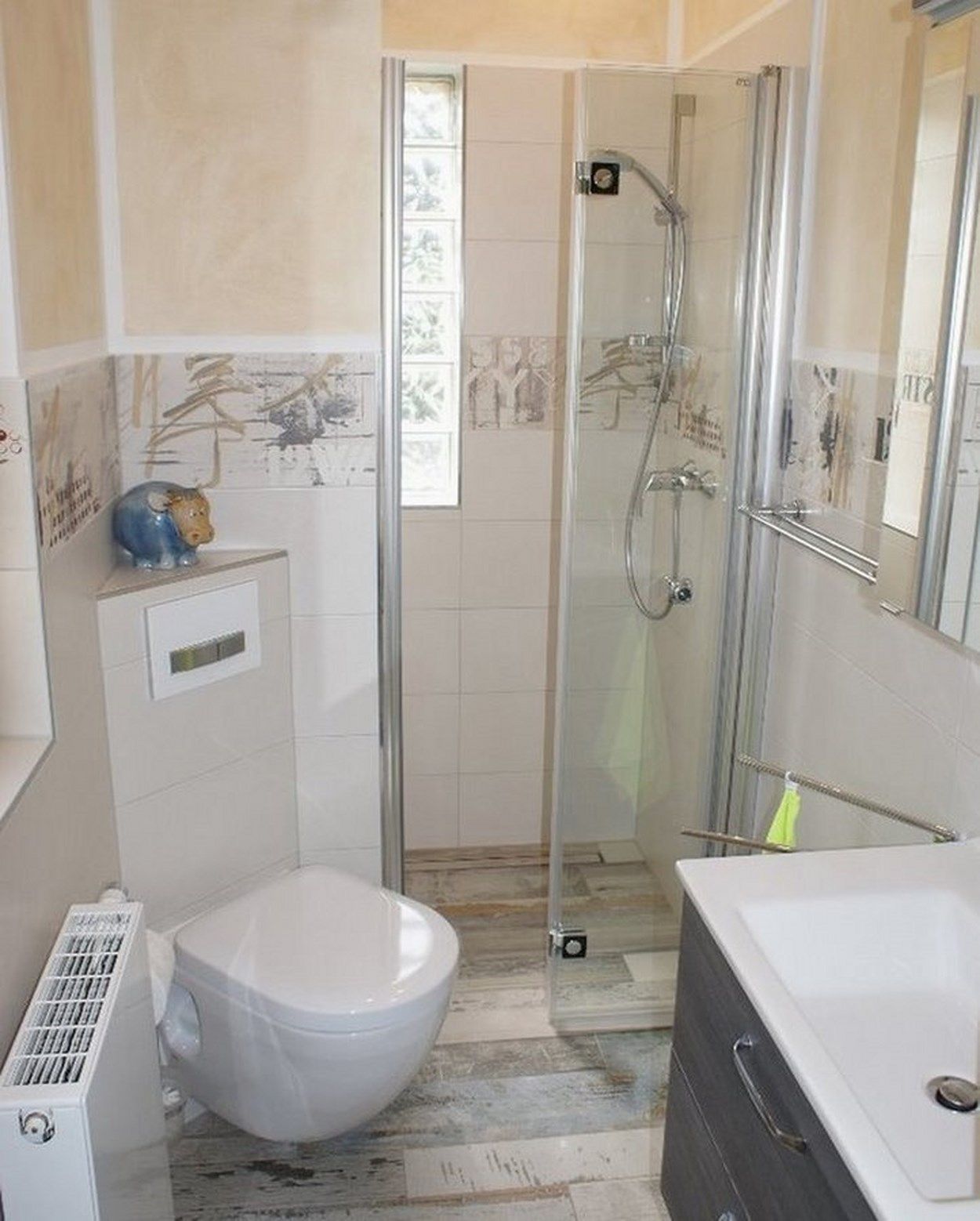 Da darf natürlich auch ein stylisches Badezimmer mit Dusche, WC, Spiegel, Waschbecken und Unterschrank mit viel Stauraum nicht fehlen.