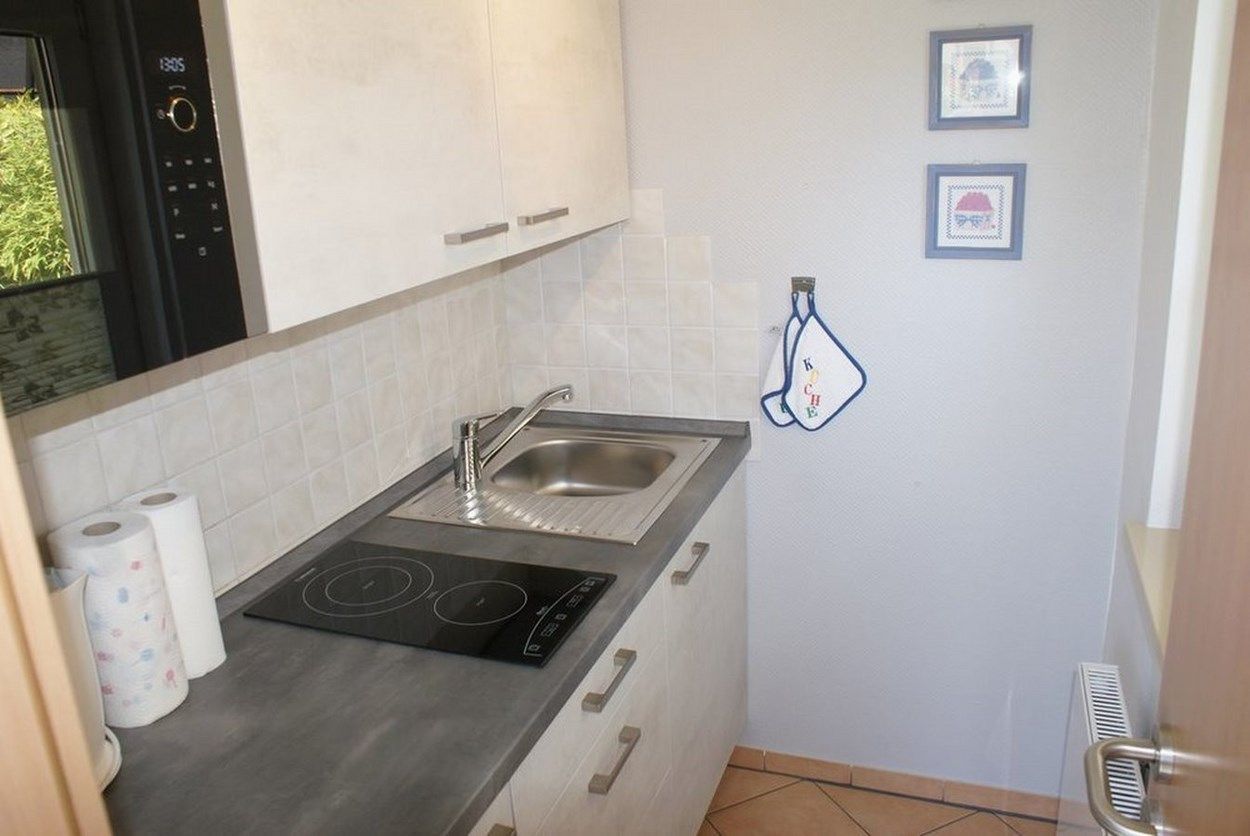 Das Bad ist mit Fußbodenheizung, Dusche und WC ausgestattet. Die Küche ist komplett eingerichtet (Toaster, Kaffeemaschine, Wasserkocher, Kühlschrank, Ceranfeld). Es ist bei uns klein aber sehr gemütlich.