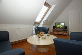 Die Ferienwohnung im 2. Obergeschoss mit separatem Eingang/Treppen-haus ist ca. 90 m² groß und aufgeteilt in Wohnzimmer, zwei Schlafzimmer, Küche und Bad.