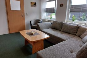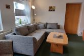 - Wohnzimmer mit Sitzgruppe bestehend aus Sessel, Tisch sowie Schrankwand, sowie TV über Sat- Anlage, DVD Player und Radio