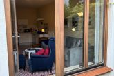 Die Fewo hat einen grünen Außenbereich mit Terrasse nach Süden ausgerichtet und dazu entsprechende Gartenmöbel mit Auflage.