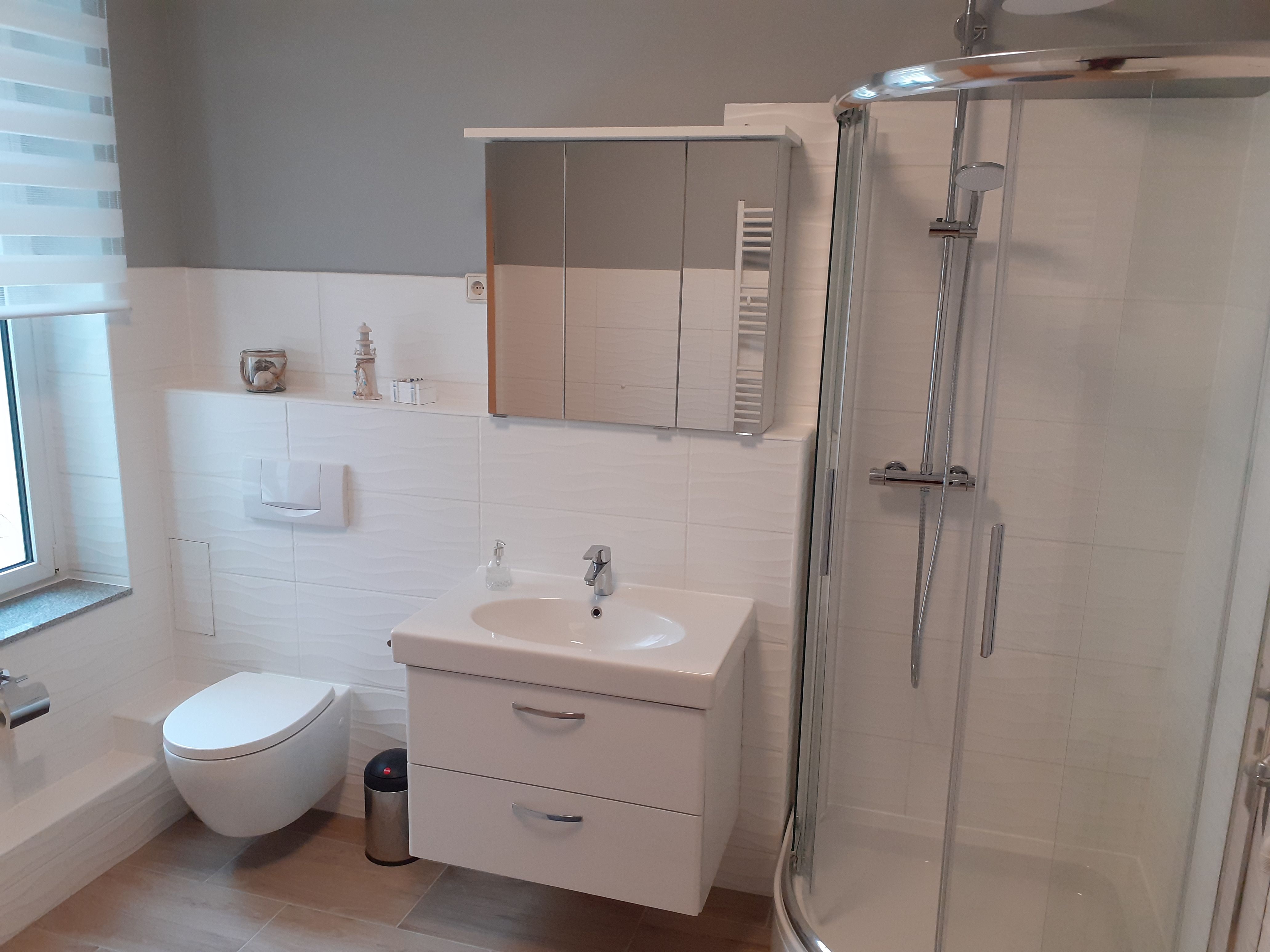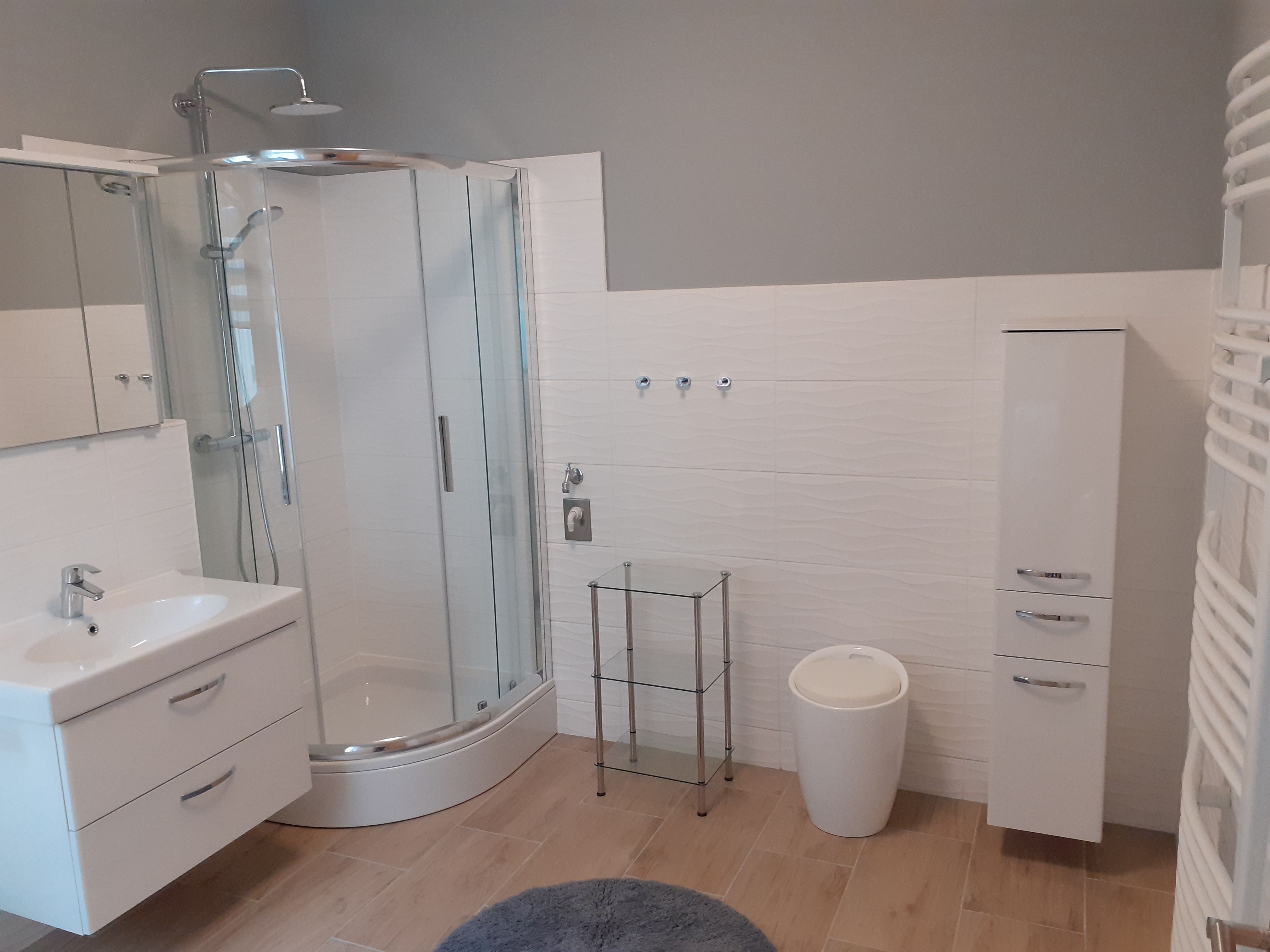 - Badezimmer mit Dusche, Spiegel, Schrank