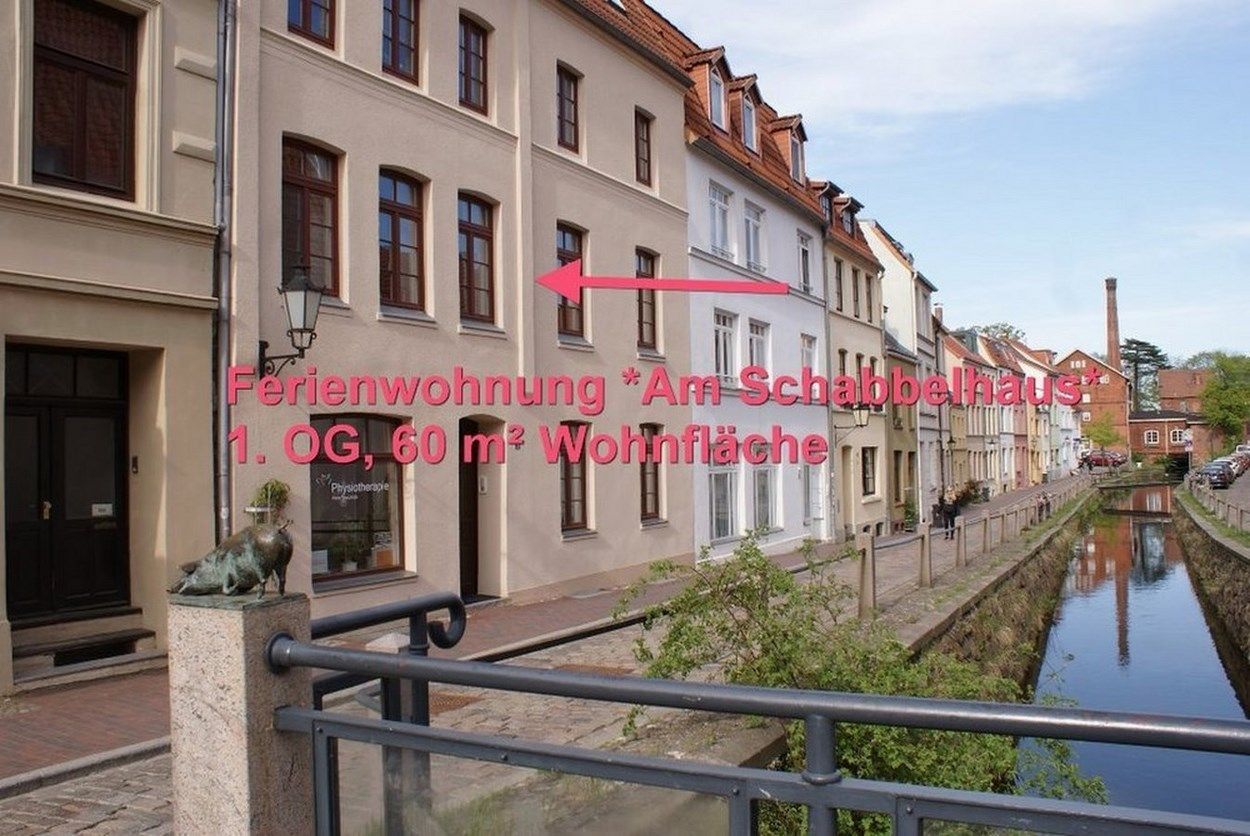 Unsere Ferienwohnung *Am Schabbelhaus* liegt sehr zentral im historischen Stadtkern von Wismar an der Mühlengrube mit Blick auf das Stadtgeschichtliche Museum Schabbelhaus und der St. Nikolai-Kirche.