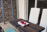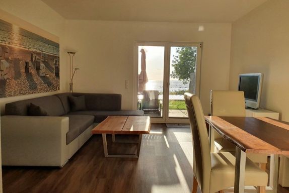Auf der Terrasse, die vom Wohnzimmer aus begehbar ist, genießen Sie den Ausblick auf die Wismar-Bucht. Die überdachte Terrasse ist mit 2 Stühlen, 2 Loungesesseln und zwei Tischen aus wetterfestem Polyrattan ausgestattet. Ein kleines, eigenes Rasenstück rundet das Bild ab.