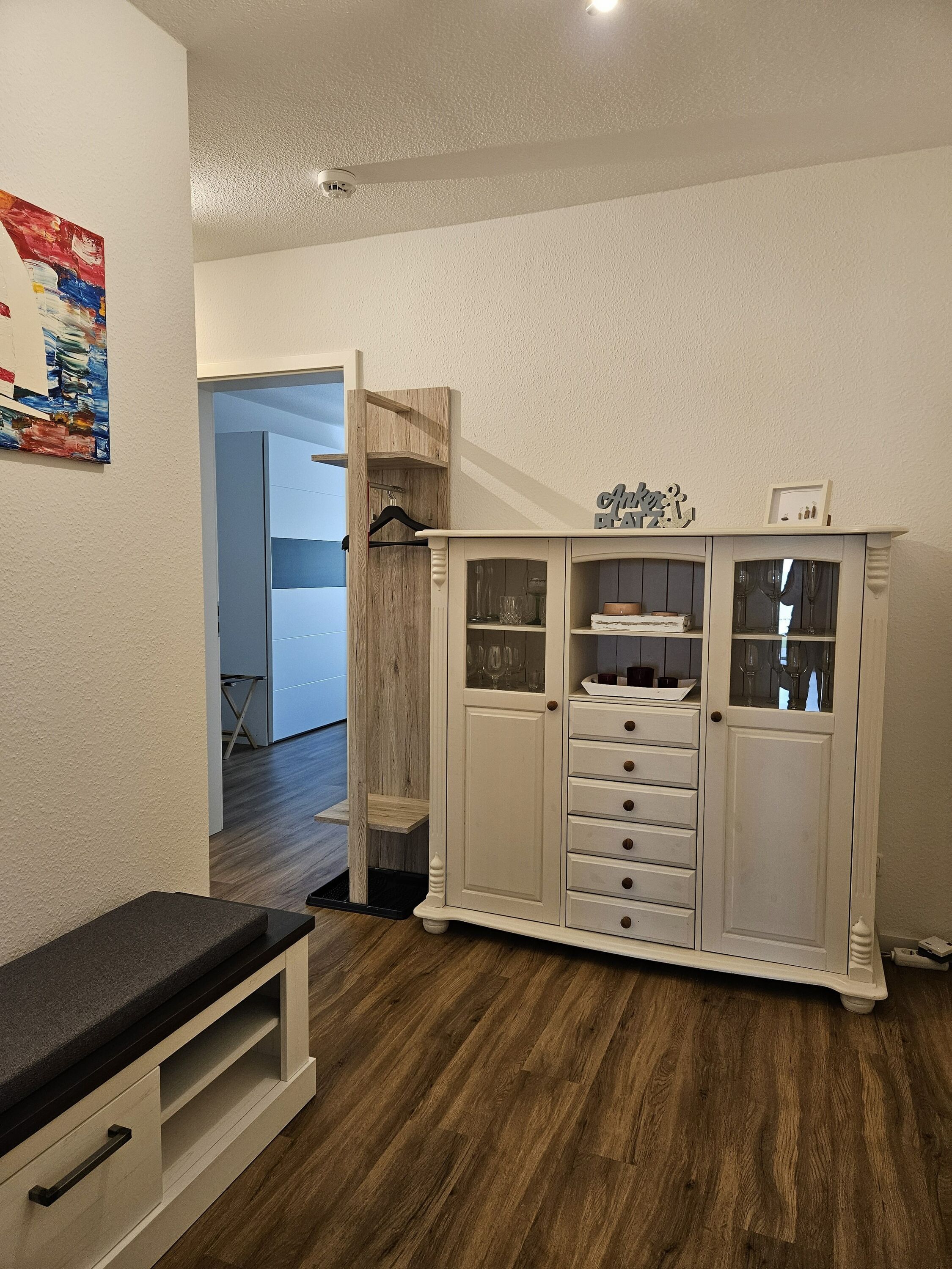 Die Ferienwohnung ist mit Kabel-TV, einer offenen Küche mit Ceranfeld und Backofen, Kühlschrank, Kaffemaschine und Toaster sowie Duschbad mit Waschmaschine ausgestattet. Kein Fön.