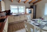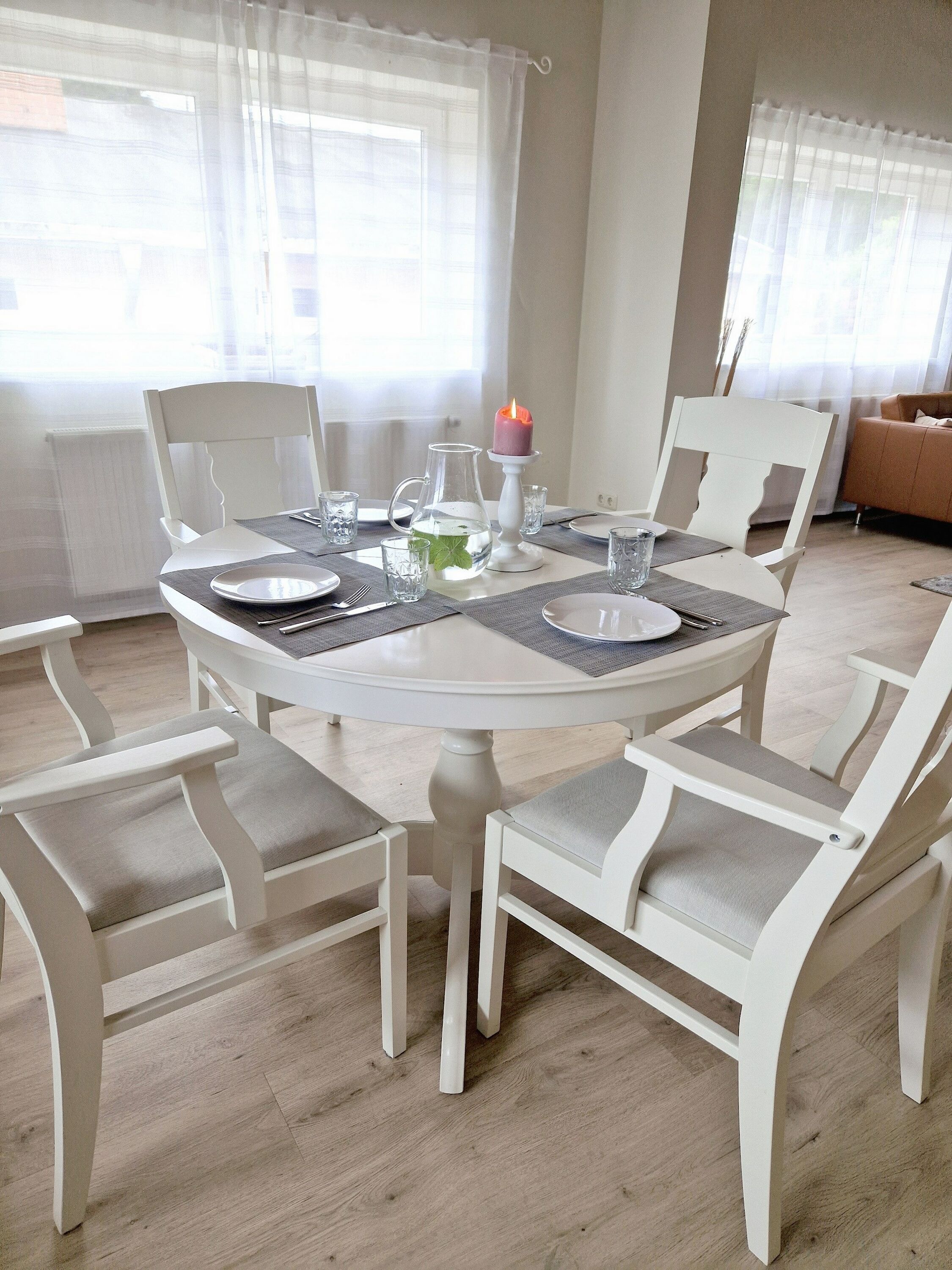 - großes Wohnzimmer (Sofa, Tisch, TV) mit offener Küche (vollausgestattet u.a. mit Geschirrspüler, Backofen, Ceranfeld, Kaffeemaschine, Geschirr, Besteck, Gläser, Kühlschrank u. v. m.), sowie Essbereich für 4 Personen