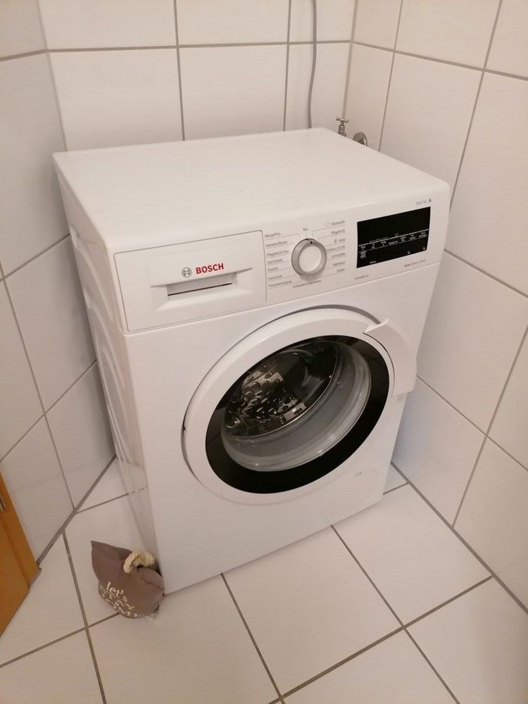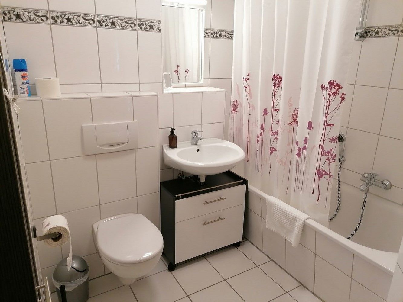 - Badezimmer mit Badewanne, WC, Waschmaschine, Spiegel und Ablage
