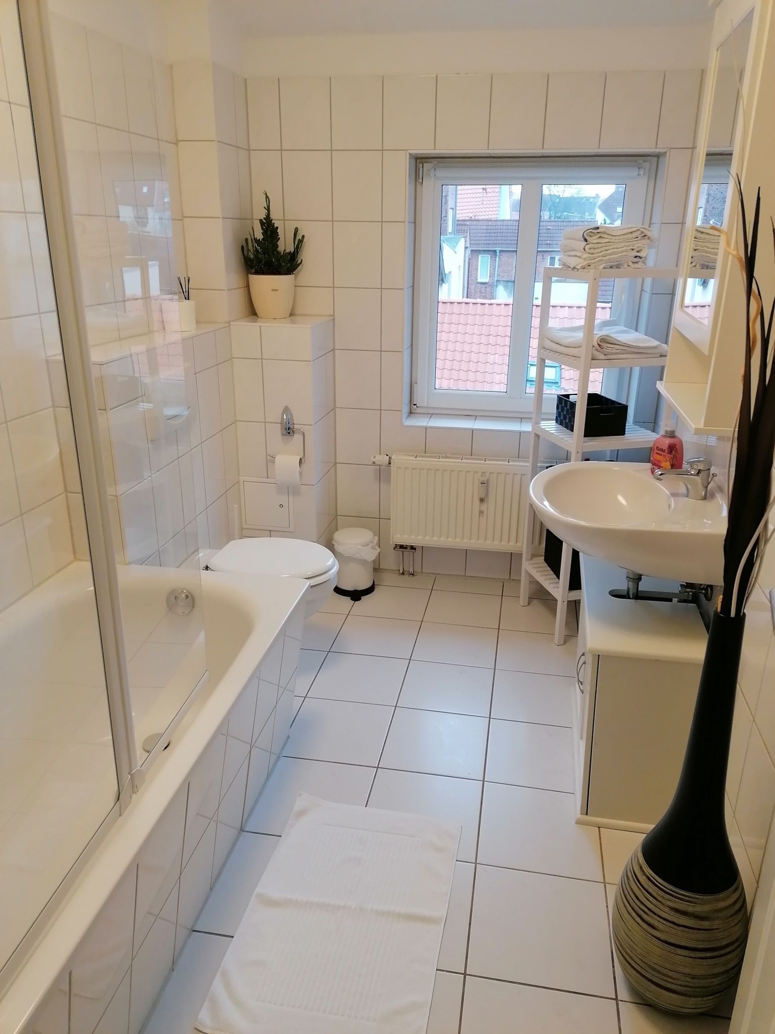 - Voll-Badezimmer mit Badewanne mit Duschscheibe, WC