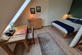 Mittelpunkt ist das große Dachzimmer, räumlich in Wohn- und Schlafraum unterteilt. Mit Blick in den Himmel und auf die Wismarer Hinterhöfe (mit Hühnern) können Sie hier auf der bequemen Coach entspannen, den Schreibtisch für Ihre Urlaubspost nutzen, lesen, ausschlafen, Ausflüge planen……..