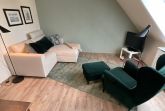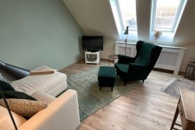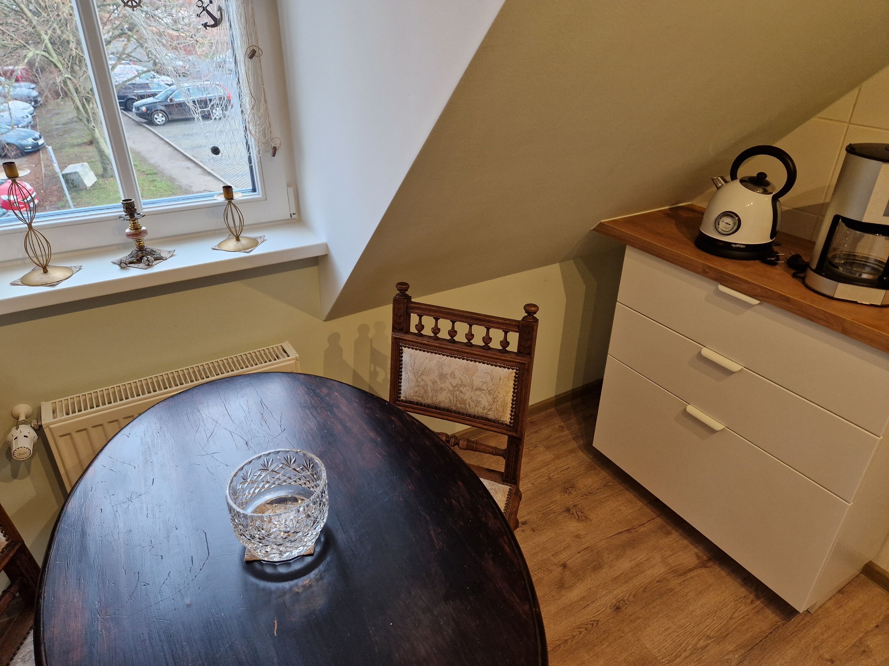 Mittelpunkt ist das große Dachzimmer, räumlich in Wohn- und Schlafraum unterteilt. Mit Blick in den Himmel und auf die Wismarer Hinterhöfe (mit Hühnern) können Sie hier auf der bequemen Coach entspannen, den Schreibtisch für Ihre Urlaubspost nutzen, lesen, ausschlafen, Ausflüge planen..