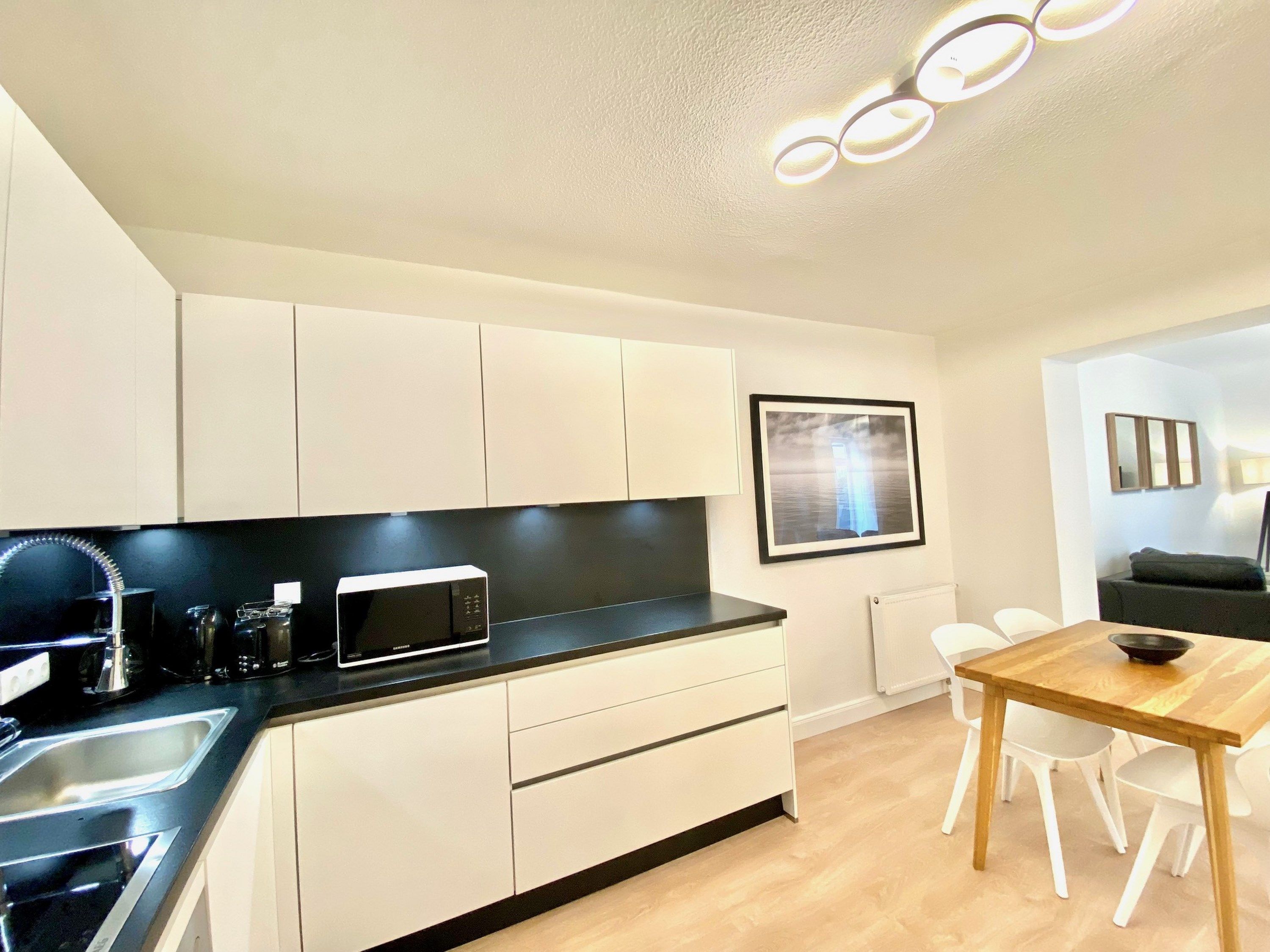 - offene Küche vollausgestattet u.a. mit Geschirrspüler, Backofen, Induktionsherd, Filter-Kaffeemaschine, zusätzliche Nespresso-Kaffeemaschine, Geschirr, Besteck, Gläser, Kühlschrank mit Gefrierteil
