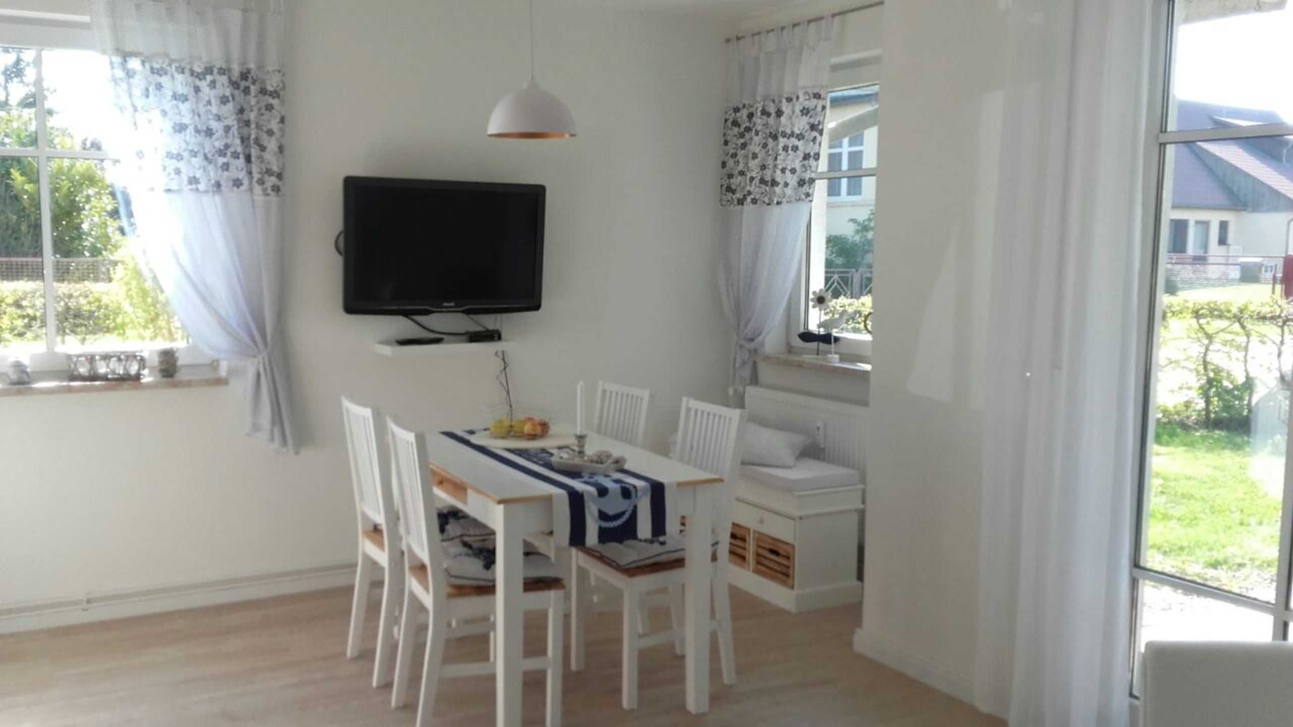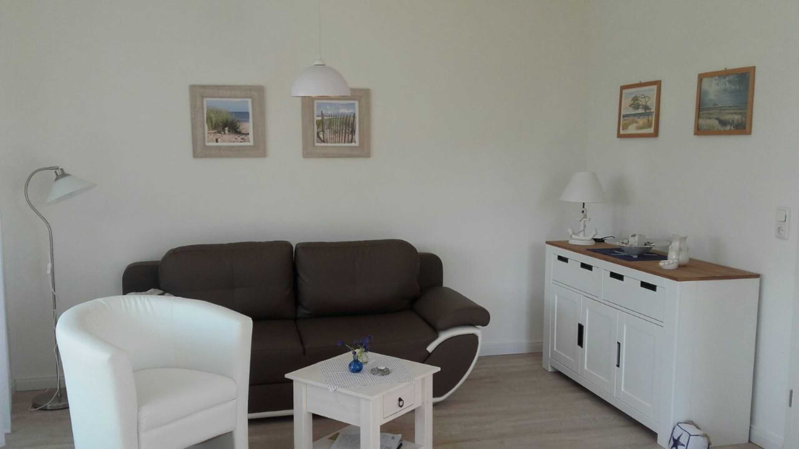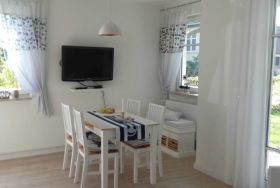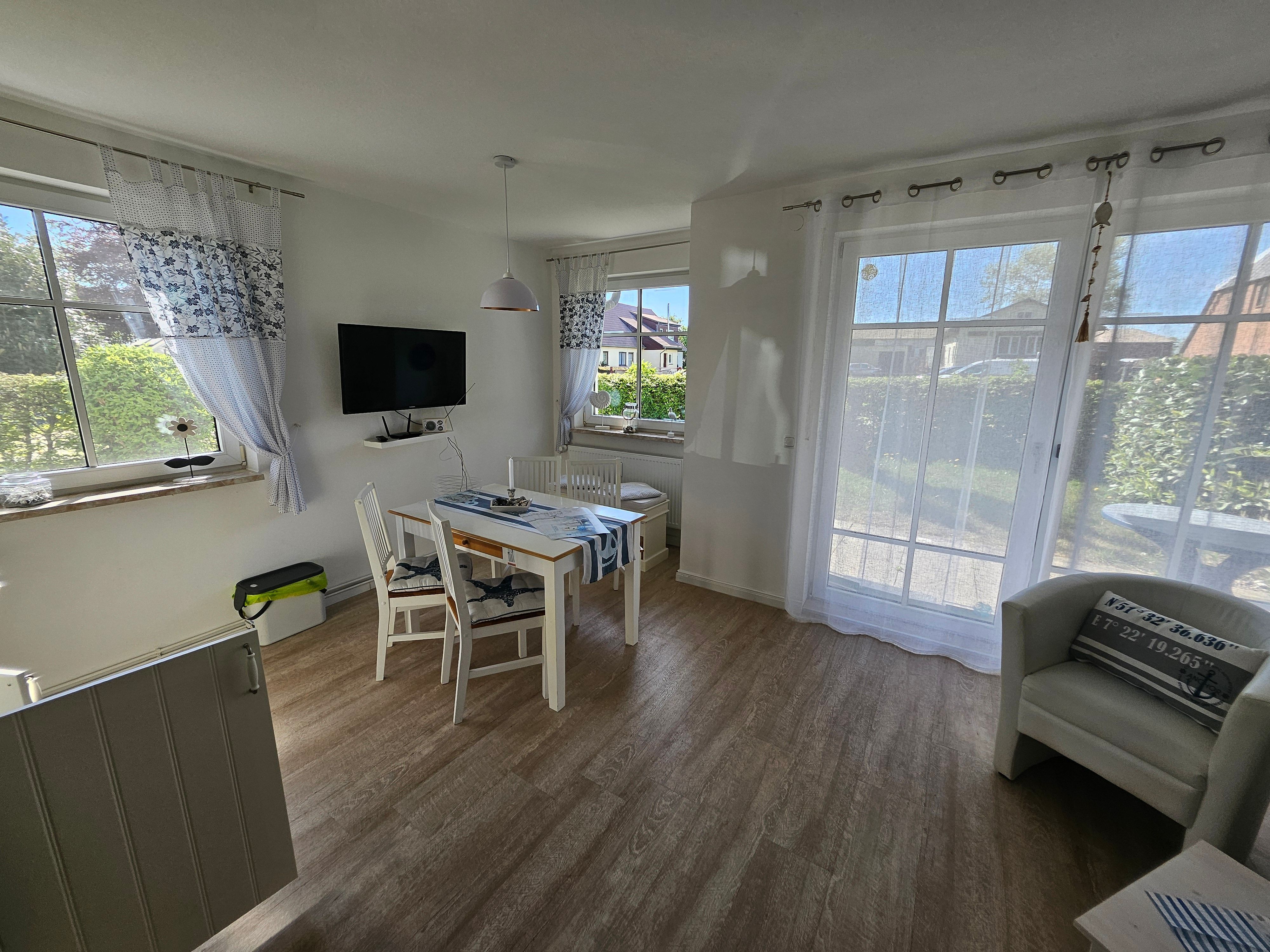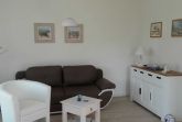 Das behagliche Wohnzimmer ist ausgestattet mit einem Flachbild-SAT-TV, Radio, einer komfortablen Couch sowie einem Sessel. Von hier aus gelangen Sie direkt auf die sonnige Südterrasse, die gemeinsam mit dem angrenzenden Garten zu entspannten Stunden im Freien einlädt. Natürlich stehen Ihnen Terrassenmöbel inklusive Tisch zur Verfügung.